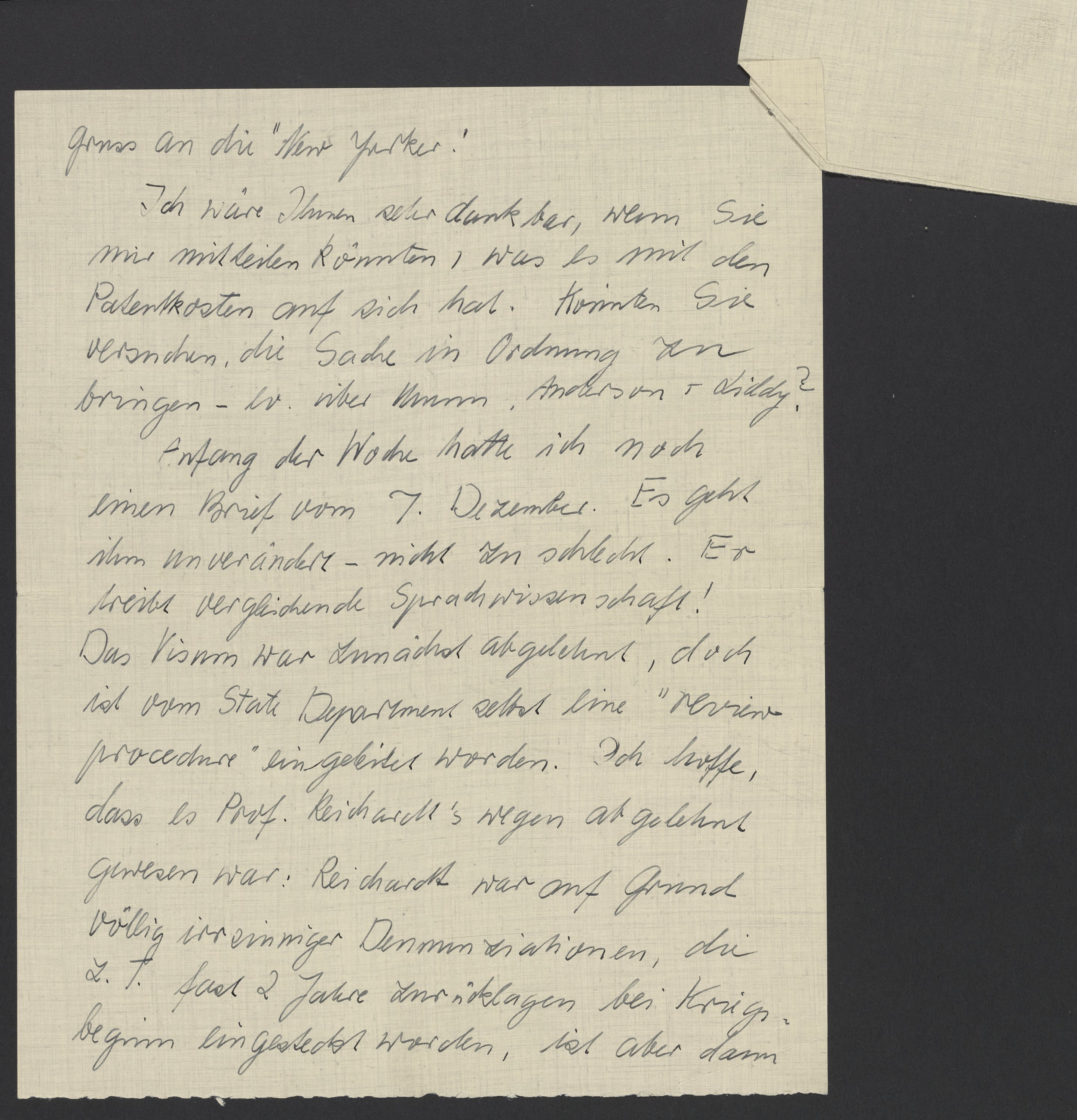 Anfang der Woche hatte ich noch einen Brief vom 7. Dezember. Es geht ihm unverändert – nicht zu schlecht. Er treibt vergleichende Sprachwissenschaft! Das Visum war zunächst abgelehnt, doch ist vom State Department selbst eine “review procedure” eingeleitet worden. Ich hoffe, dass es Professor Reichard’s wegen abgelehnt gewesen war. Reichardt war auf Grund völlig irrsinniger Denunziationen, die z.T. fast 2 Jahre zurücklagen bei Kriegsbeginn, eingesteckt worden, ist aber dann