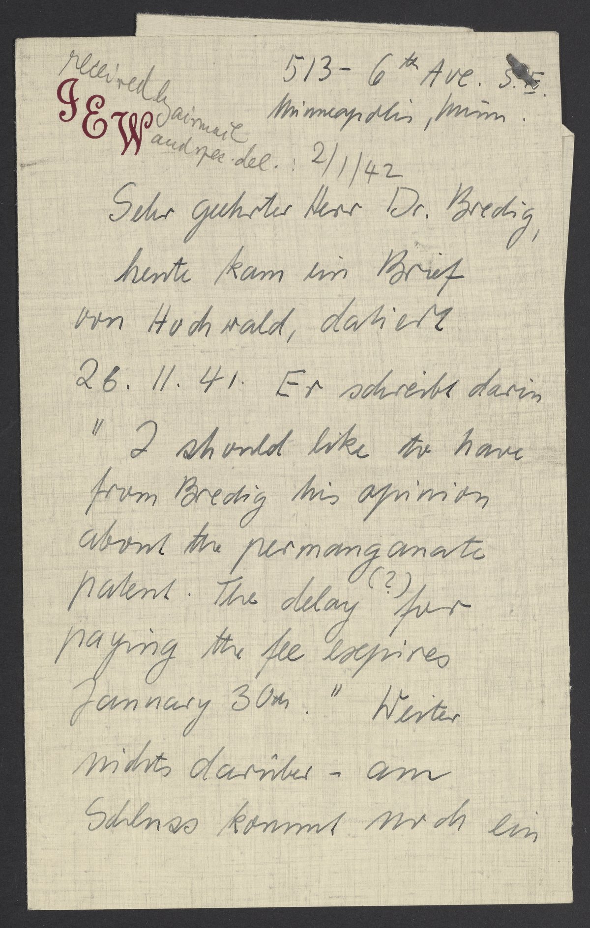 A letter came today from Hochwald, dated November 26, 1941. In it he writes, “I should like to have from Bredig his opinion about the permanganate patent. The delay (?) for paying the fee expires January 30.” There is nothing more about it. At the end, he says hello