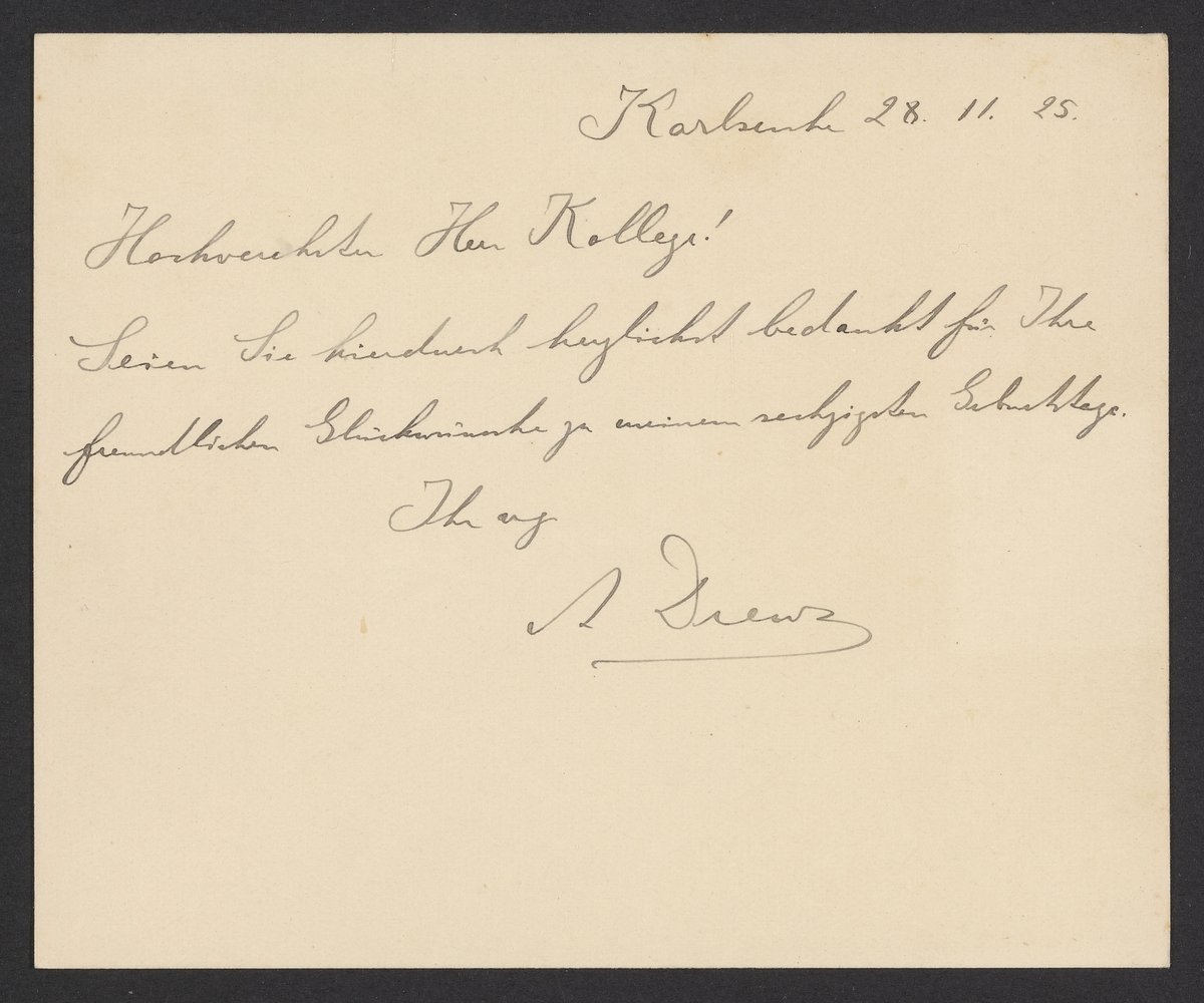 Drews, Arthur. “Thank You Note from Arthur Drews to Georg Bredig, November 1925,” November 28, 1925. Papers of Georg and Max Bredig, Box 2, Folder 28. Science History Institute. Philadelphia. https://digital.sciencehistory.org/works/ugfa3rp.