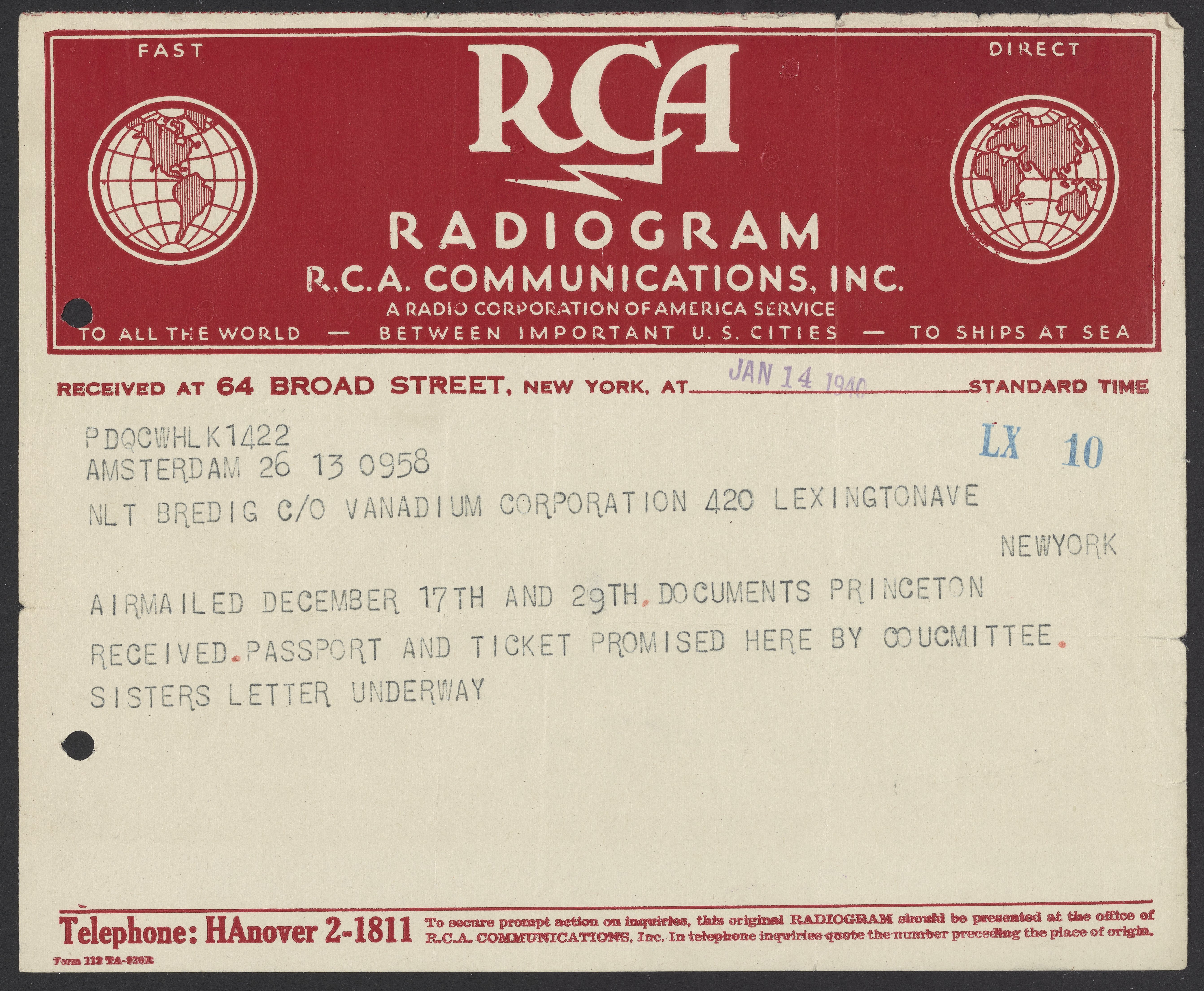 Radiogram from Georg Bredig to Max Bredig, January 14, 1940