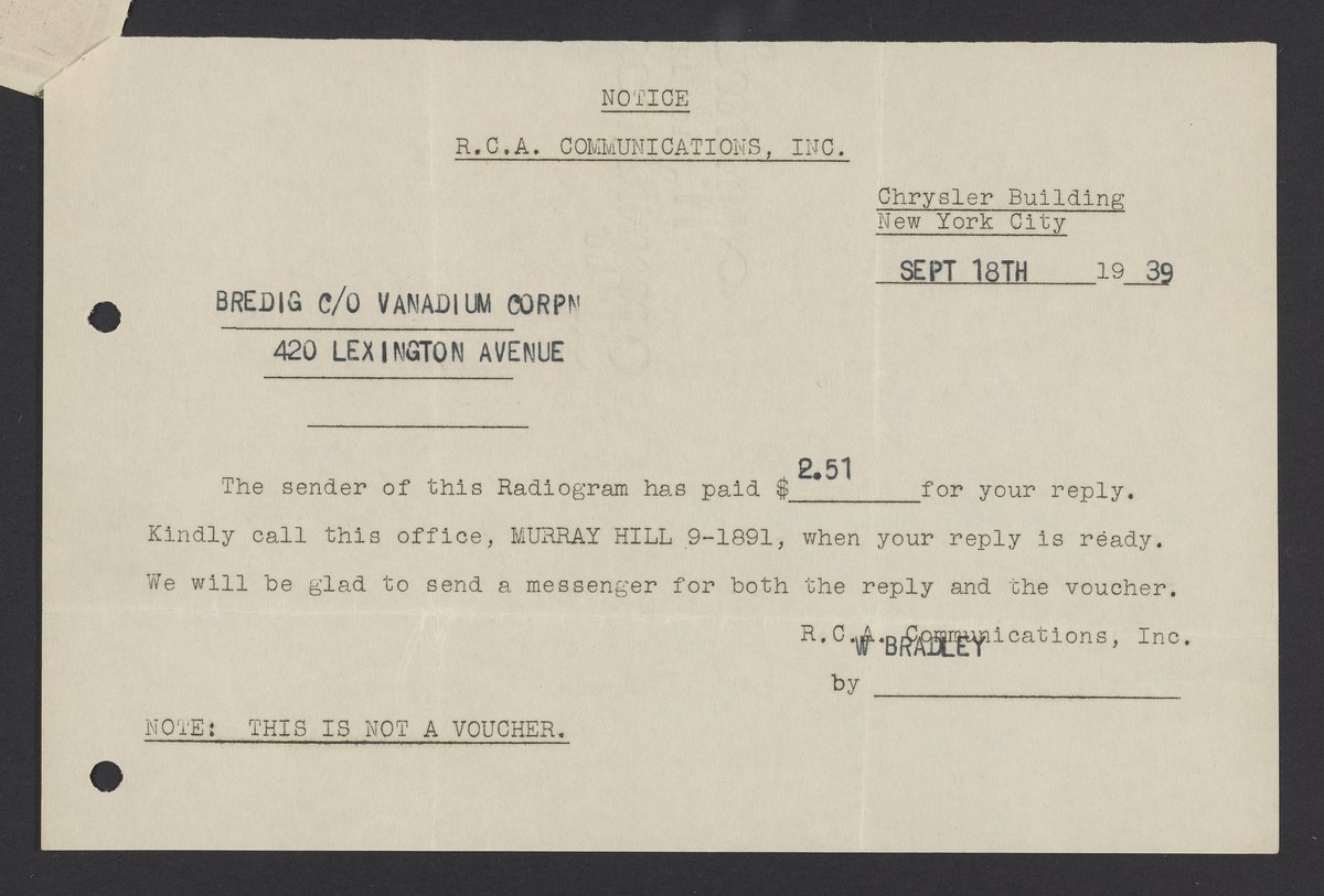 Bredig, Georg. “Radiogram from Georg Bredig to Max Bredig, September 18, 1939,” September 18, 1939. Papers of Georg and Max Bredig, Box 7, Folder 15. Science History Institute. Philadelphia. https://digital.sciencehistory.org/works/uoeae9x.