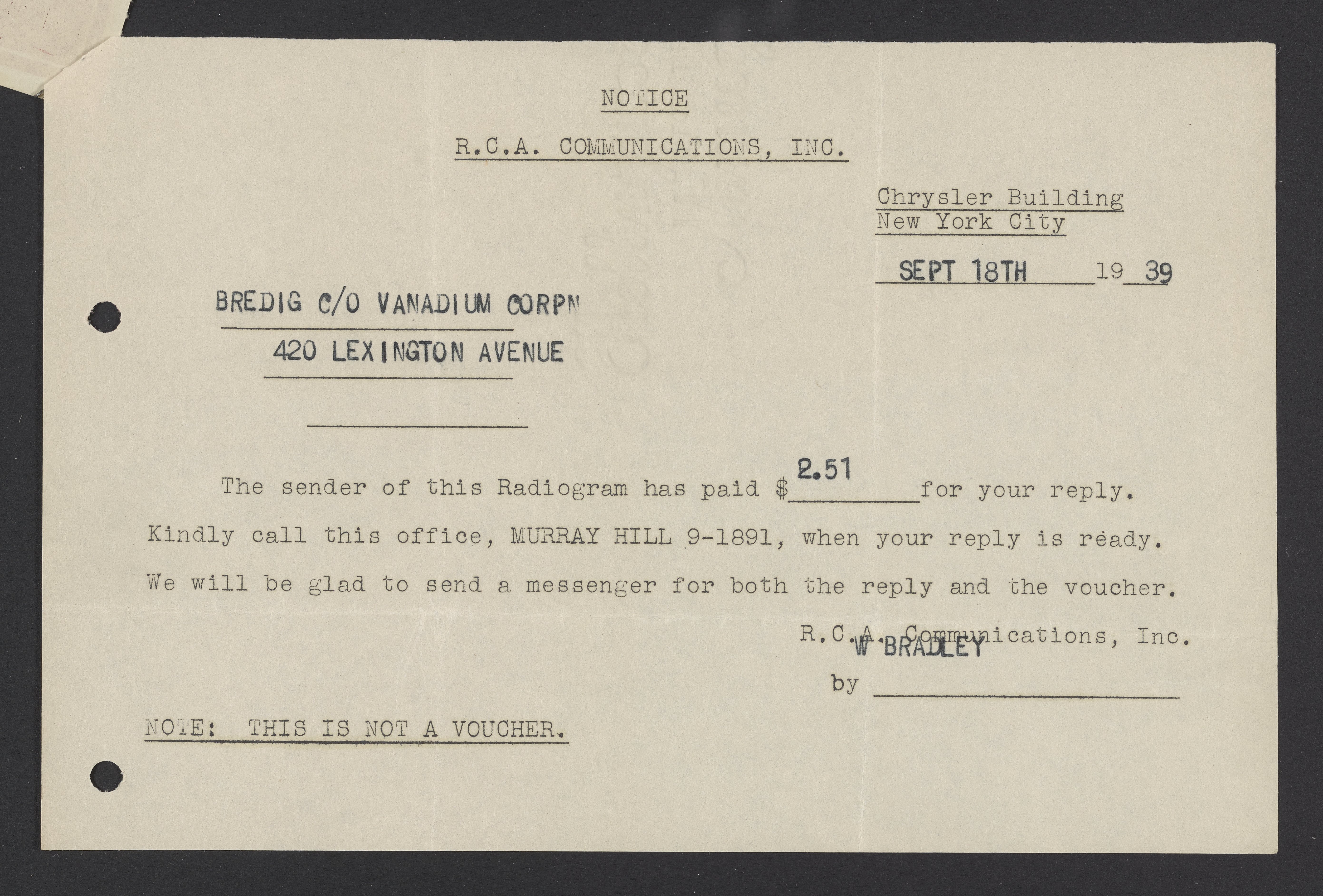 Radiogram from Georg Bredig to Max Bredig, September 18, 1939