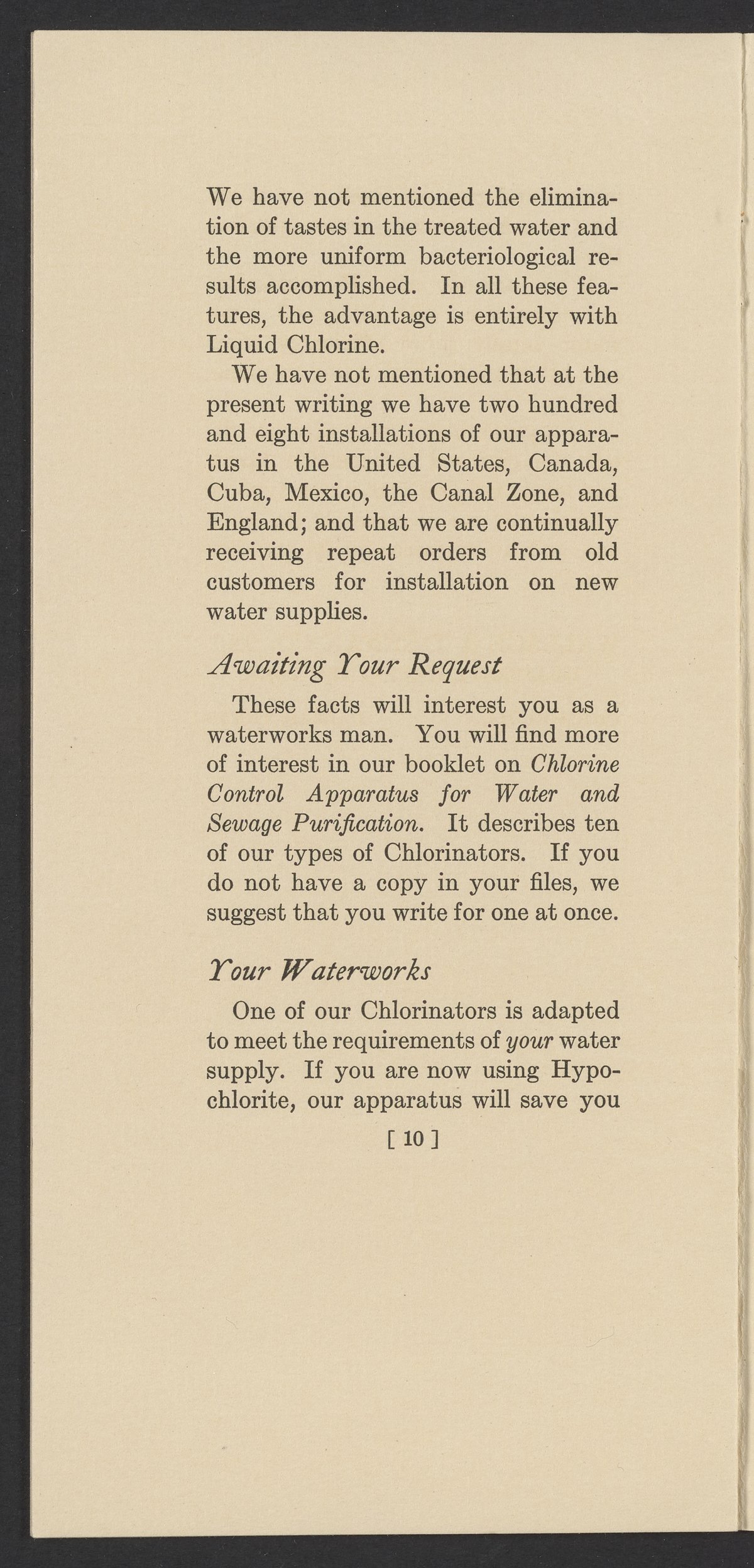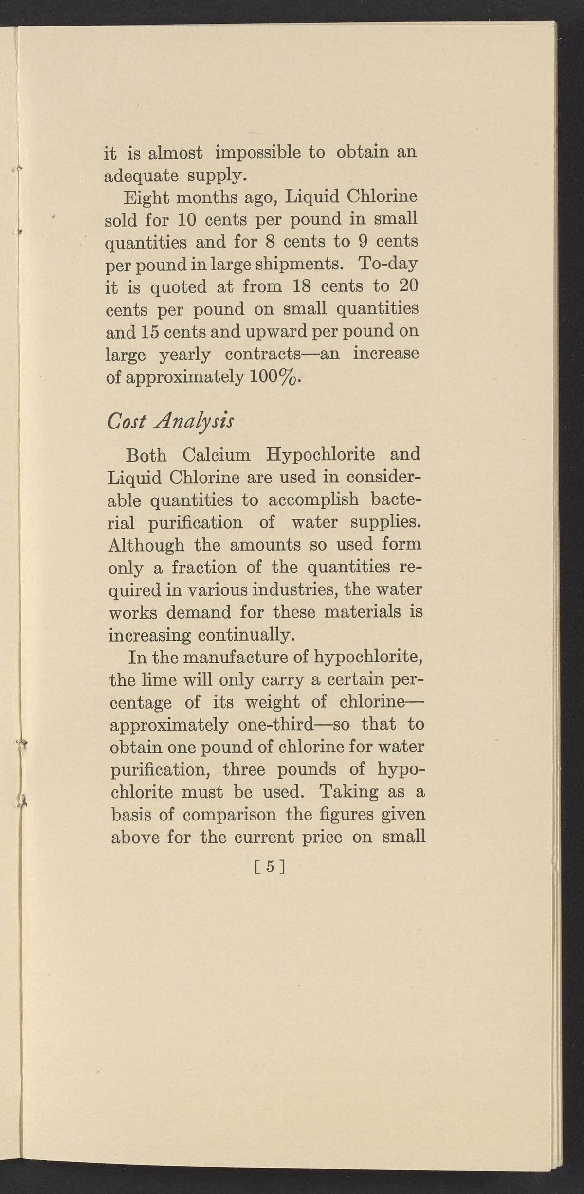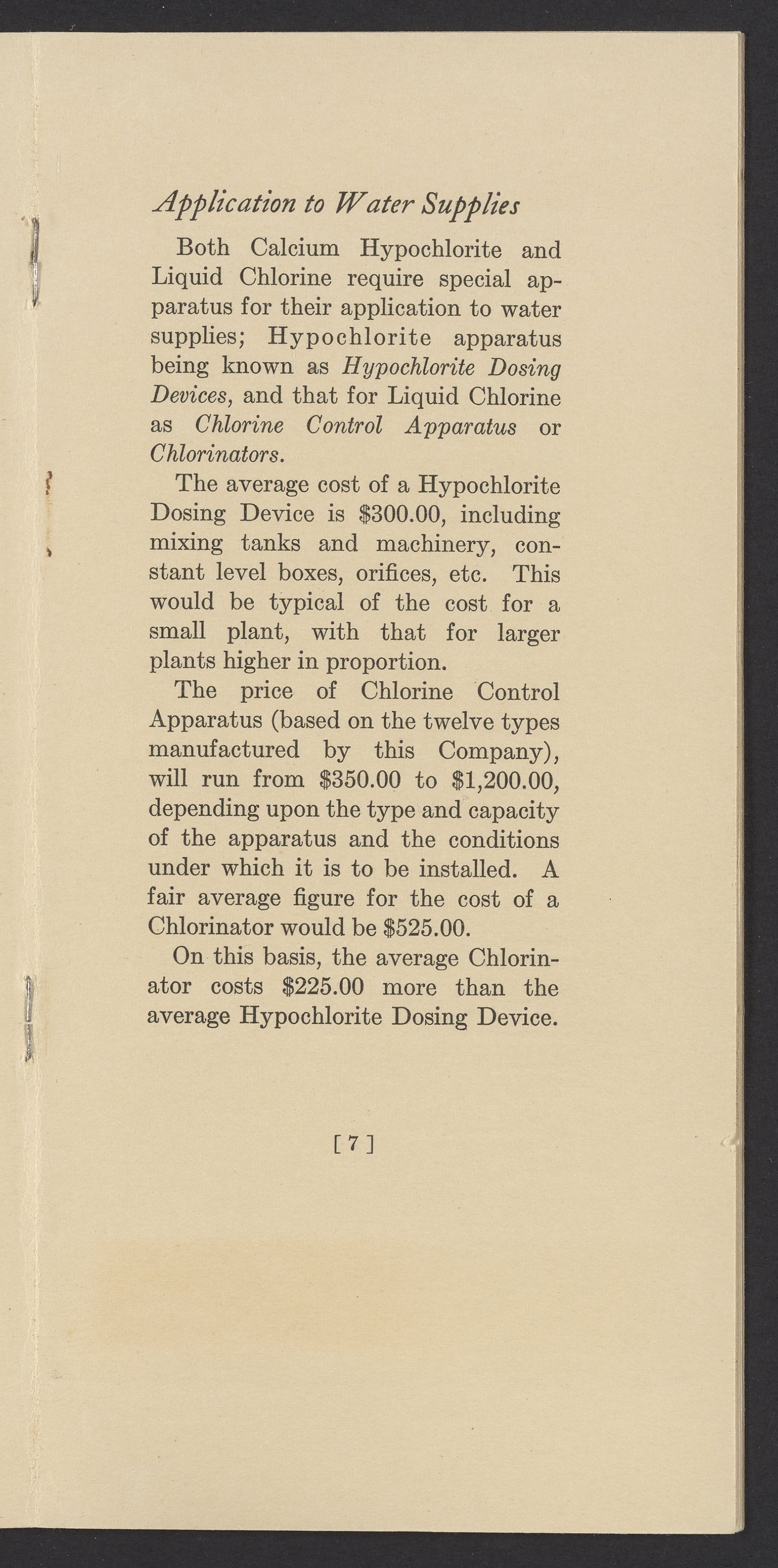 Small JPG1200 x 2437px — 420 KBFull-sized JPG1764 x 3582px — 928 KBOriginal fileTIFF — 1764 x 3582px — 18.1 MBTechnical publication pamphlet providing a cost analysis of liquid chlorine and hypochlorite products. Discusses the increase in chlorine chemical costs, and the price of water purification apparatus. Underscores the financial advantages of liquid chlorine and Wallace & Tiernan chlorinators. The work is digitized in its entirety.