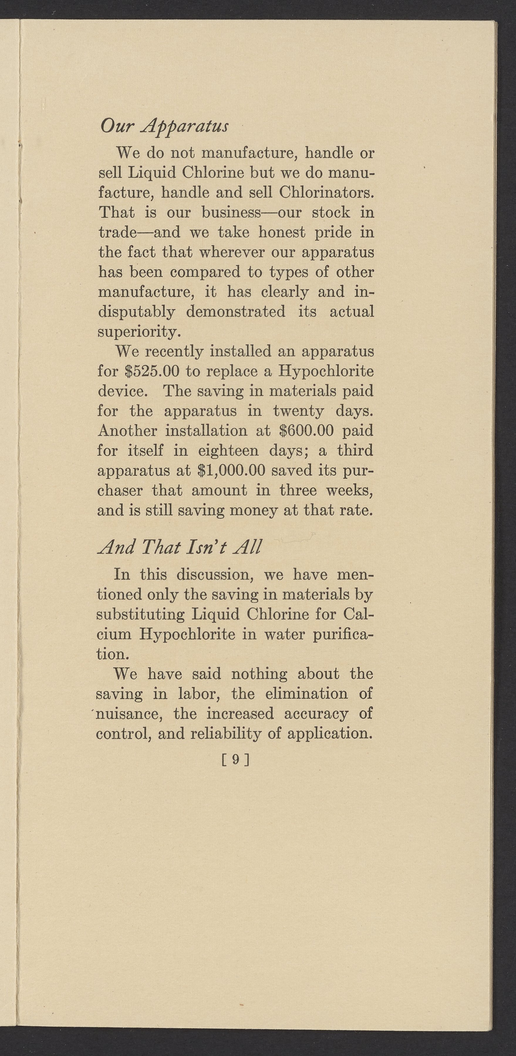 Small JPG1200 x 2437px — 420 KBFull-sized JPG1764 x 3582px — 928 KBOriginal fileTIFF — 1764 x 3582px — 18.1 MBTechnical publication pamphlet providing a cost analysis of liquid chlorine and hypochlorite products. Discusses the increase in chlorine chemical costs, and the price of water purification apparatus. Underscores the financial advantages of liquid chlorine and Wallace & Tiernan chlorinators. The work is digitized in its entirety.