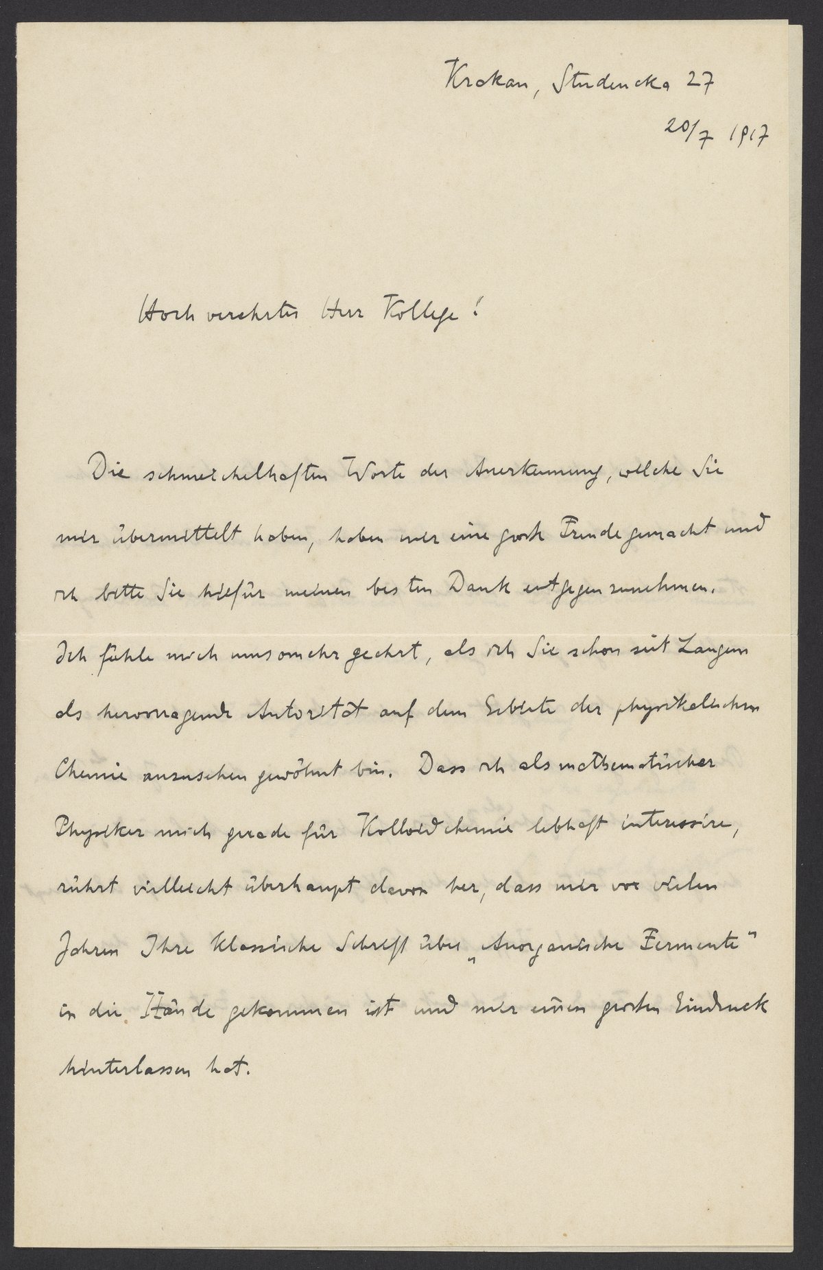 Smulchowski, Marian. “Letter from Marian Smulchowski to Georg Bredig, July 1917,” July 20, 1917. Papers of Georg and Max Bredig, Box 2, Folder 27. Science History Institute. Philadelphia. https://digital.sciencehistory.org/works/upk1jok.