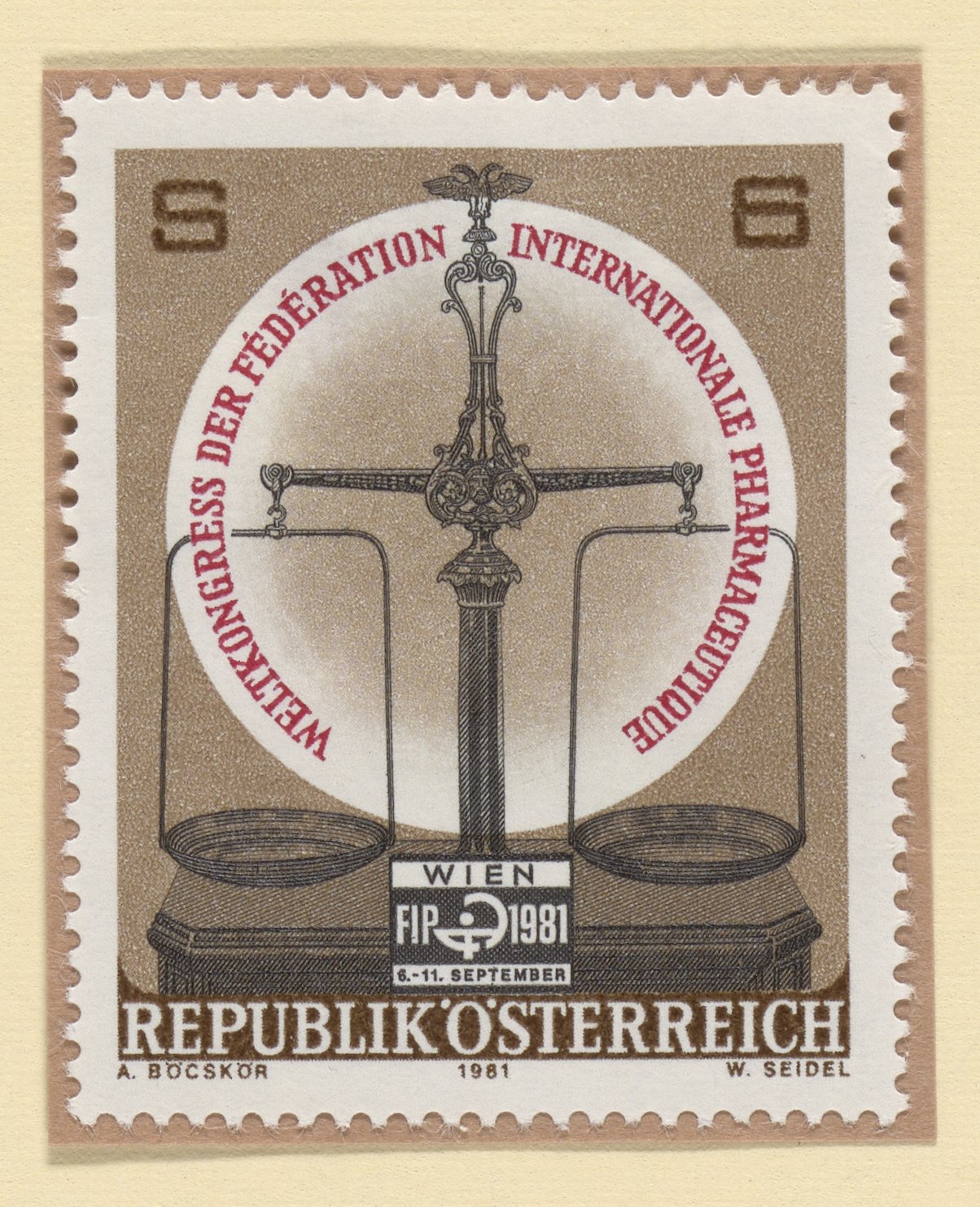 Austrian postage stamp commemorating the International Pharmaceutical Federation Congress. The stamp features an illustration of an apothecary scale.