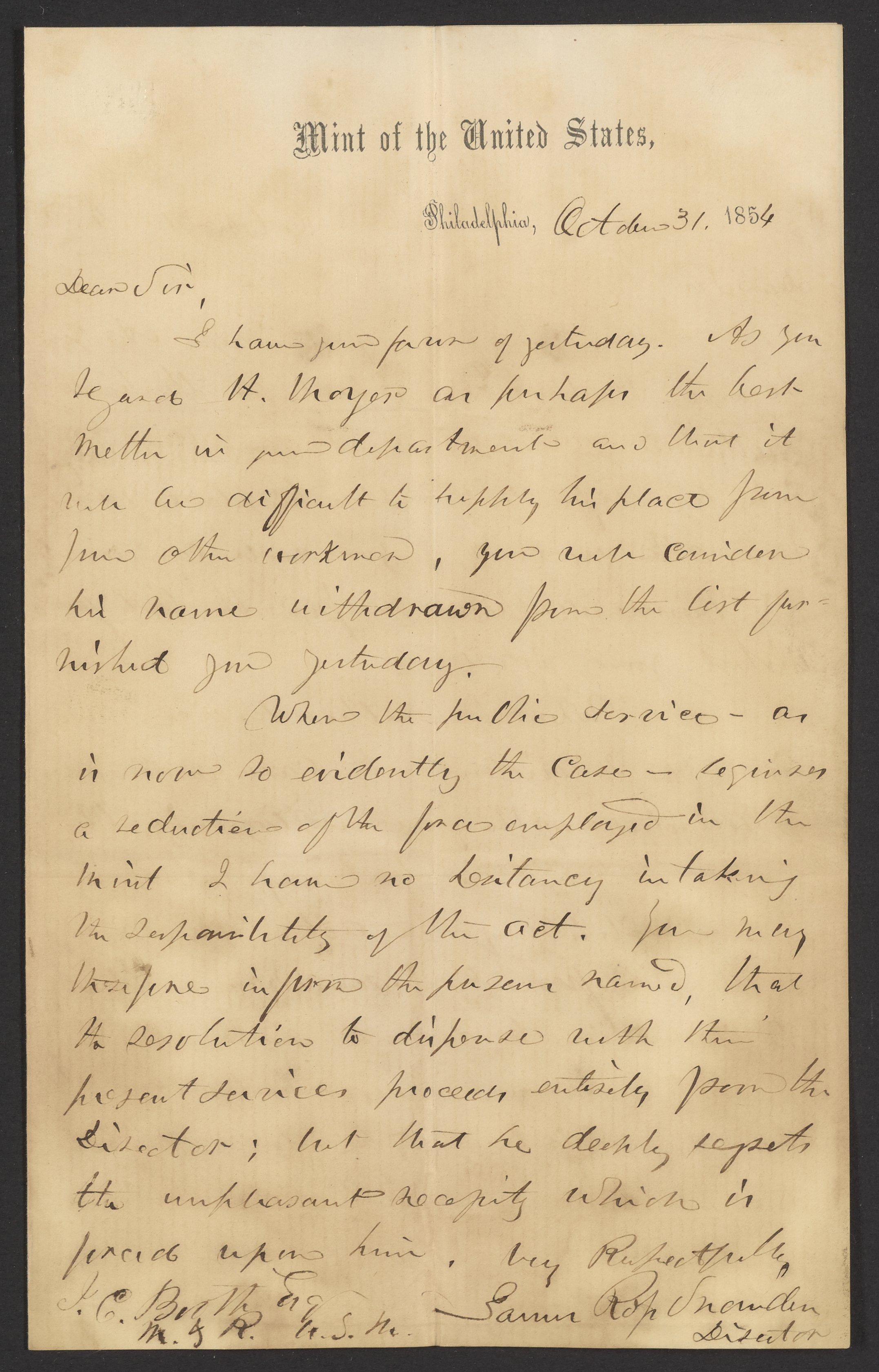 Letter from J. Ross Snowden to James Curtis Booth, October 31, 1854