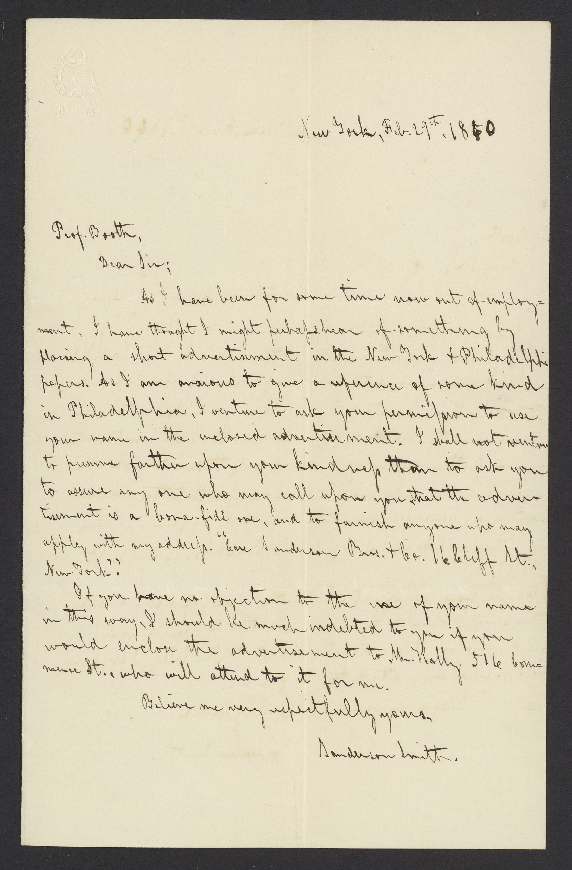 Small JPG1200 x 1826px — 286 KBFull-sized JPG2243 x 3413px — 878 KBOriginal fileTIFF — 2243 x 3413px — 22.0 MBSanderson Smith asks James Curtis Booth (1810-1888) to be a reference.