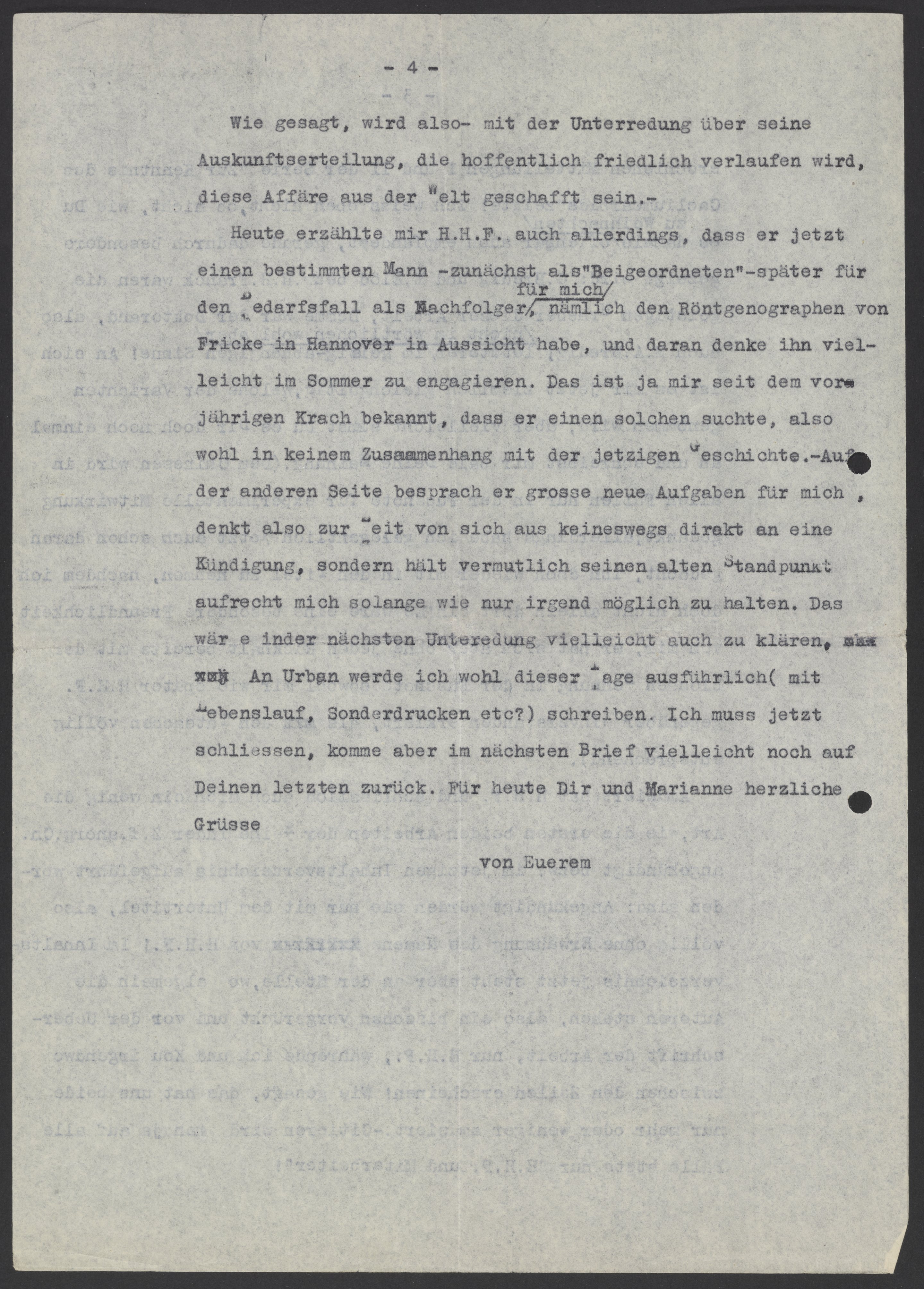 Heute erzählte mir H.H.F. auch allerdings, dass er jetzt einen bestimmten Mann - zunächst als "Beigeordneten" - später für mich den Bedarfsfall als Nachfolger, nämlich den Röntgenographen von Fricke in Hannover in Aussicht habe, und daran denke ihn viel- leicht im Sommer zu engagieren. Das ist ja mir seit dem vorjährigen Krach bekannt, dass er einen solchen suchte, also wohl in keinem Zusammenhang mit der jetzigen Geschichte. – Auf der anderen Seite besprach er grosse neue Aufgaben für mich, denkt also zur Weit von sich aus keineswegs direkt an eine Kündigung, sondern hält vermutlich seinen alten Standpunkt aufrecht mich solange wie nur irgend möglich zu halten. Das wäre in der nächsten Unterredung vielleicht auch zu klären. An Urban werde ich wohl dieser Tage ausführlich (mit Lebenslauf, Sonderdrucken etc?) schreiben. Ich muss jetzt schliessen, komme aber im nächsten Brief vielleicht noch auf Deinen letzten zurück. Für heute Dir und Marianne herzliche Grüsse