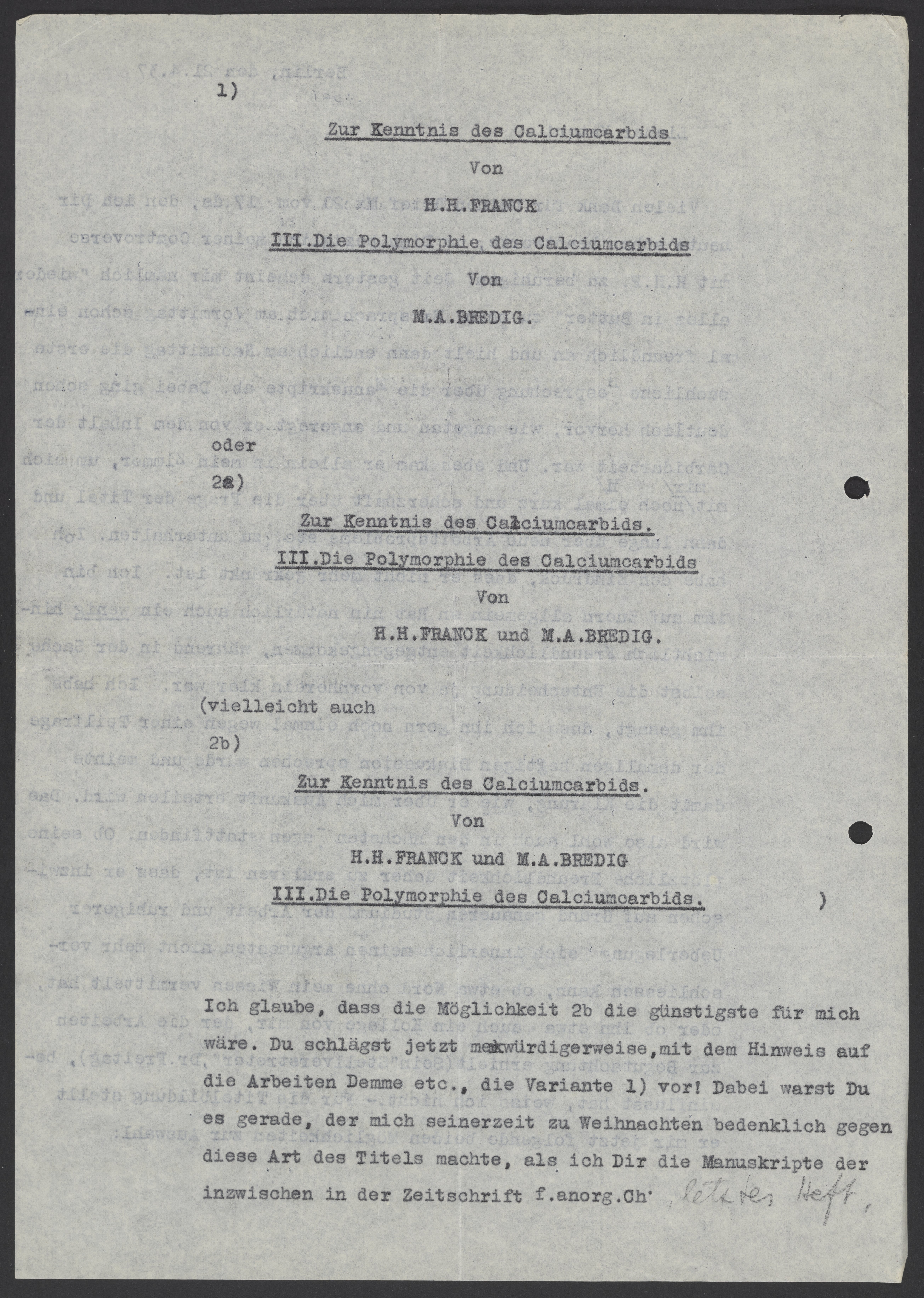 Thank you very much for your letter Mx #20 from the December 17th, which I am currently responding to in order to assuage your concerns about my dispute with H.H.F. Since yesterday, it seems to me that "everything is fine again"! Once in the morning, he spoke to me in a friendly manner and then finally in the afternoon, he conducted the first factual discussion about the manuscripts. It was already clear how impressed and excited he was by the content of the carbide paper. Moreover, he just came alone to my office to have a short, humorous chat with me about titles. We then talked more in depth about new work problems. I have the impression that he is no longer offended. On your general advice, I of course also made some concessions to him in terms of friendliness, while the decision on the matter itself was clear from the start. I told him that I would like to speak to him again about a part of the heated discussion that we previously. I wanted to clarify how he would give information about me. That will probably also take place in the next few days. Whether his sudden friendliness can be explained by the fact that, after studying the work more closely and considering it more calmly, he can no longer inwardly ignore my arguments. Hence, I don't know if Nord got involved without my knowledge, or if a colleague of mine who received the work for review (his "deputy" Dr. Freitag) influenced him. He is now suggesting the following title options to choose from: