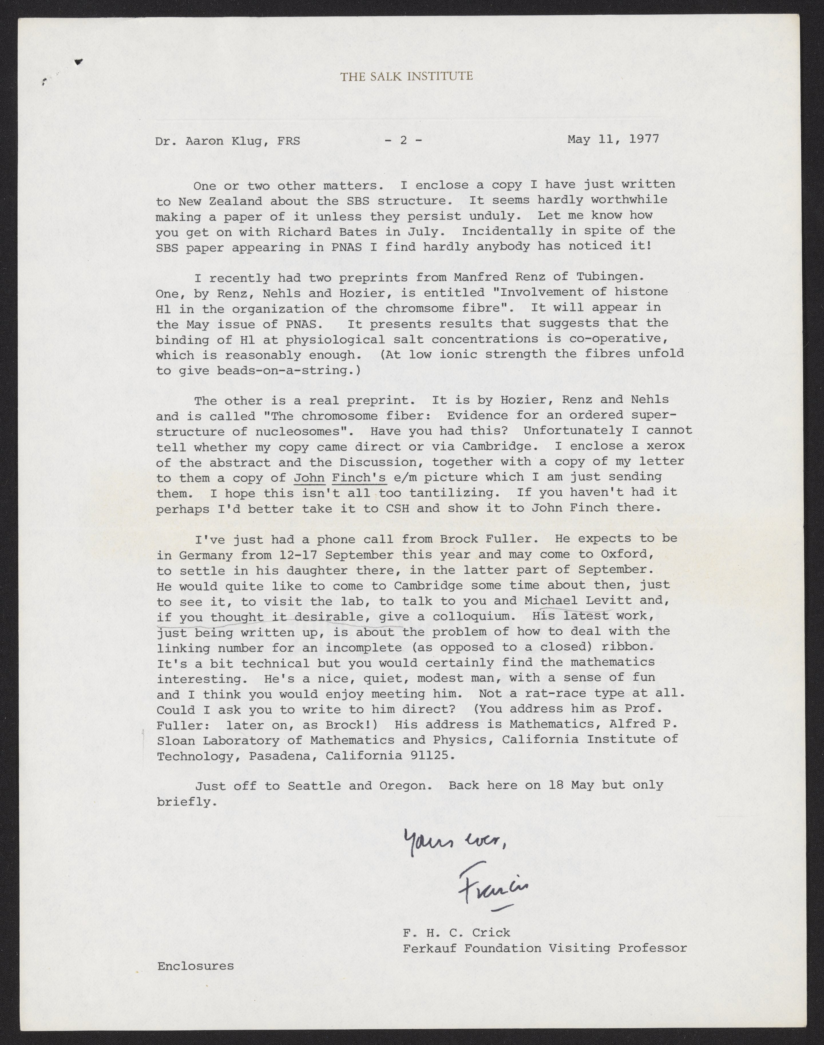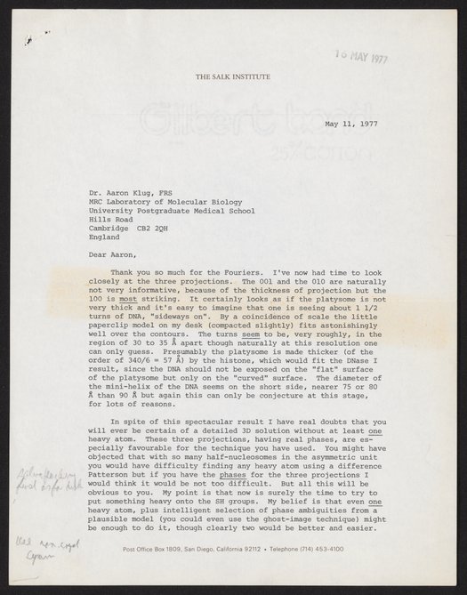 Crick, Francis. “Letter from Francis Crick to Aaron Klug, May 11, 1977,” May 11, 1977. History of Molecular Biology Collection, Box 20, Folder 1. Science History Institute. Philadelphia. https://digital.sciencehistory.org/works/uwv64fh.