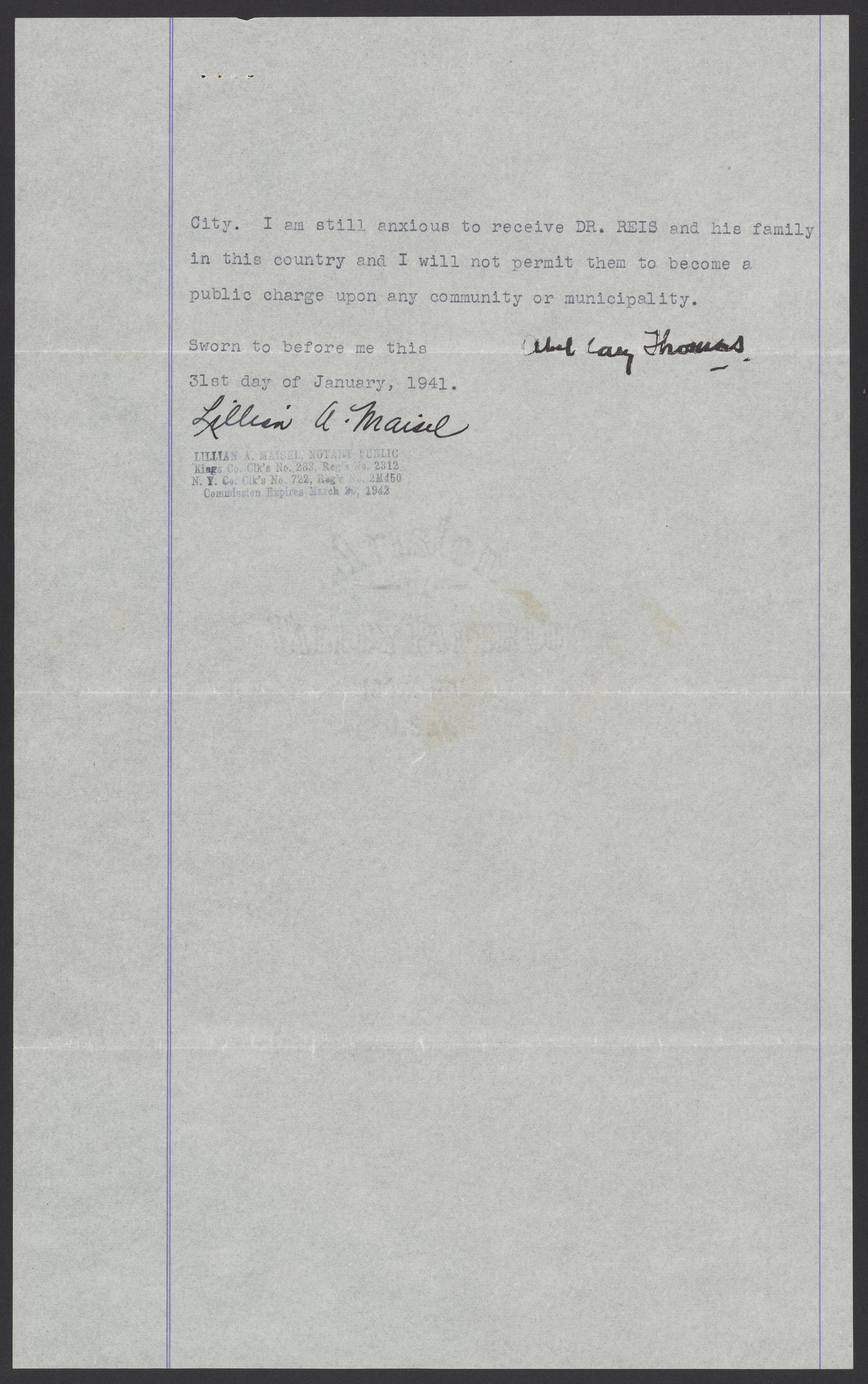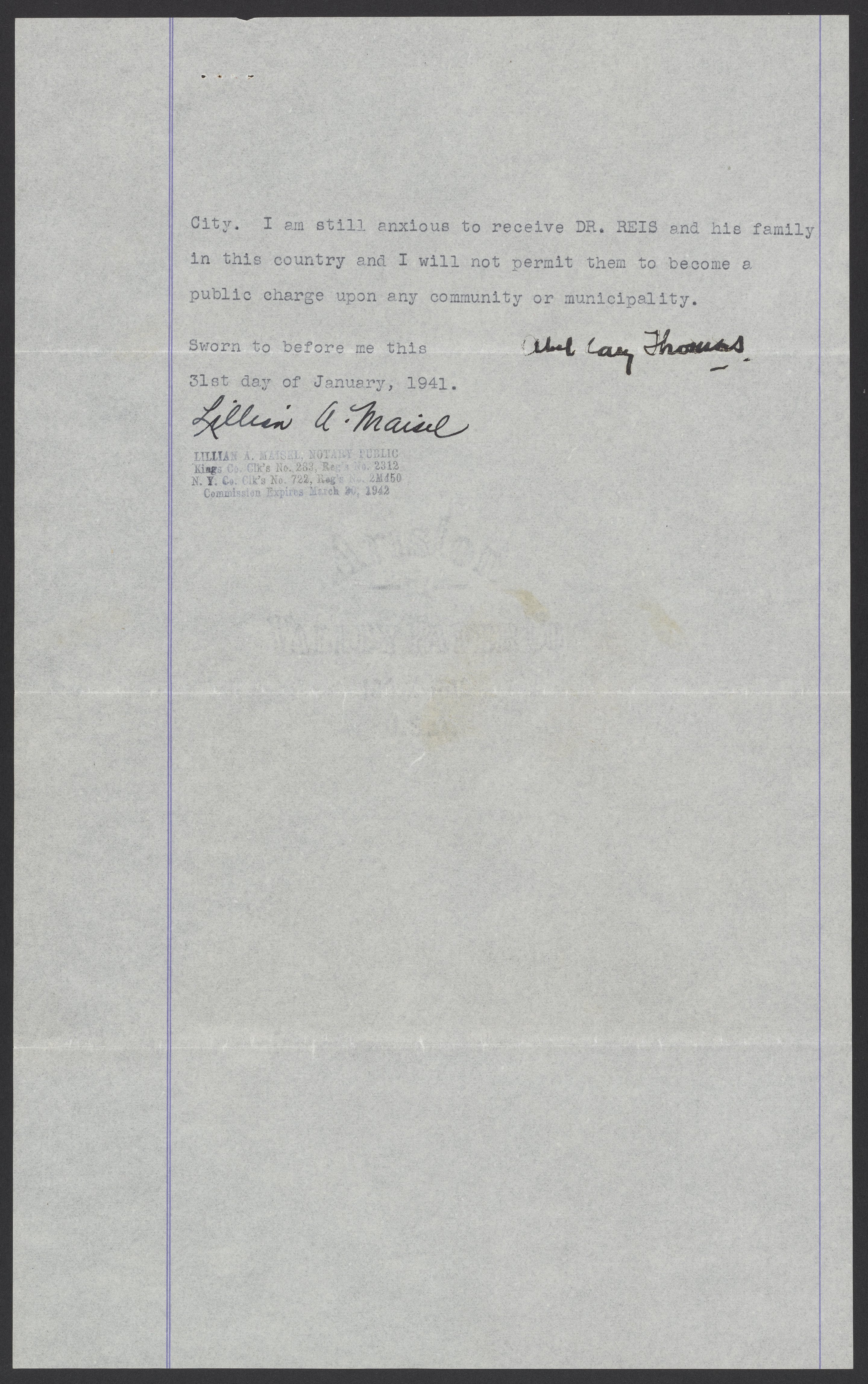 Small JPG1200 x 1913px — 370 KBLarge JPG2880 x 4590px — 2.2 MBFull-sized JPG5097 x 8123px — 6.6 MBOriginal fileTIFF — 5097 x 8123px — 119 MBAffidavit in support of the immigration of Dr. Alfred Reis (1882-1951), written by Abel Cary Thomas, an employee of Warner Brothers Pictures, Incorporated. Max Bredig (1902-1977) has written at the top of the letter that the affidavit was not accepted by the President's Advisory Committee on January 31st, 1941.