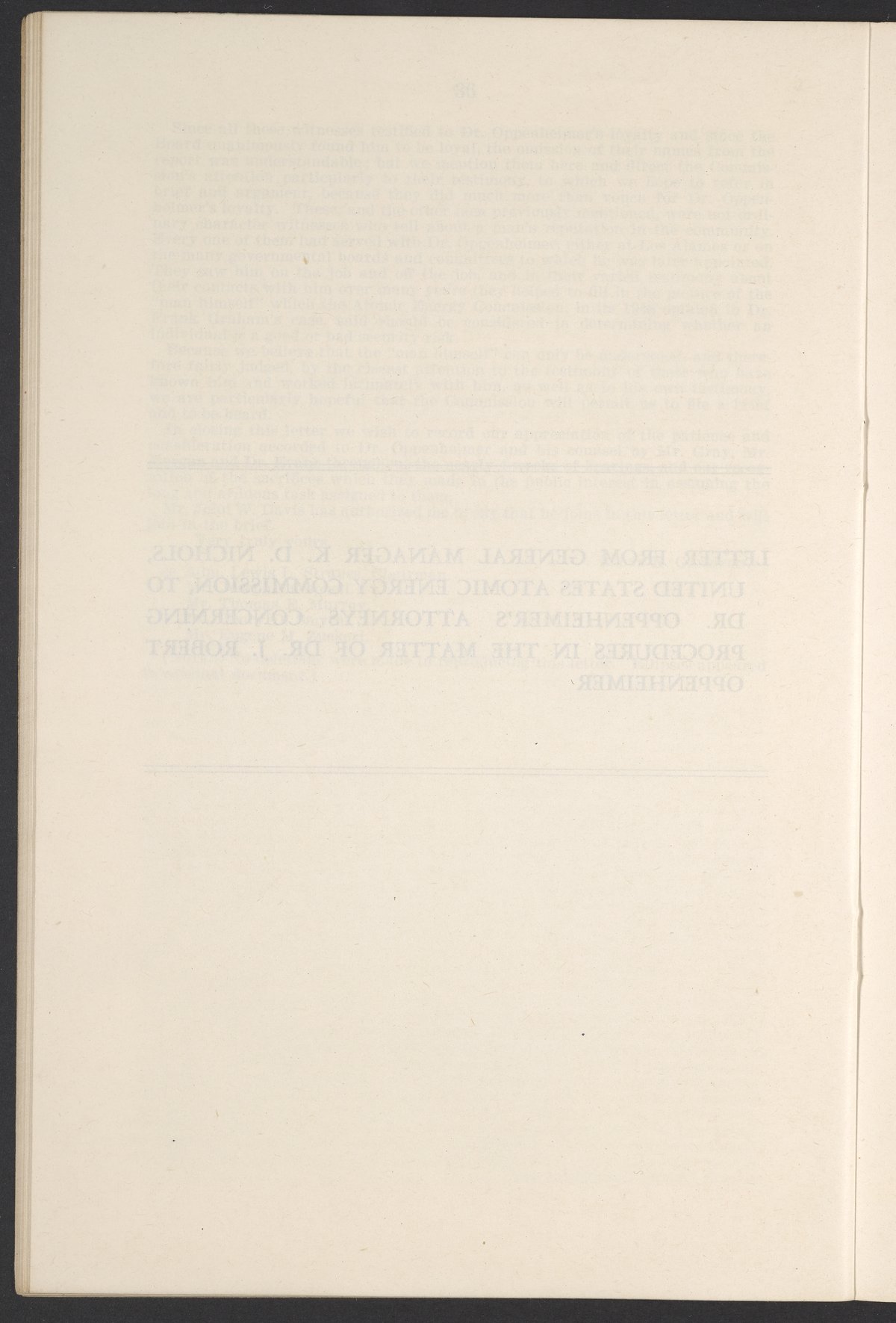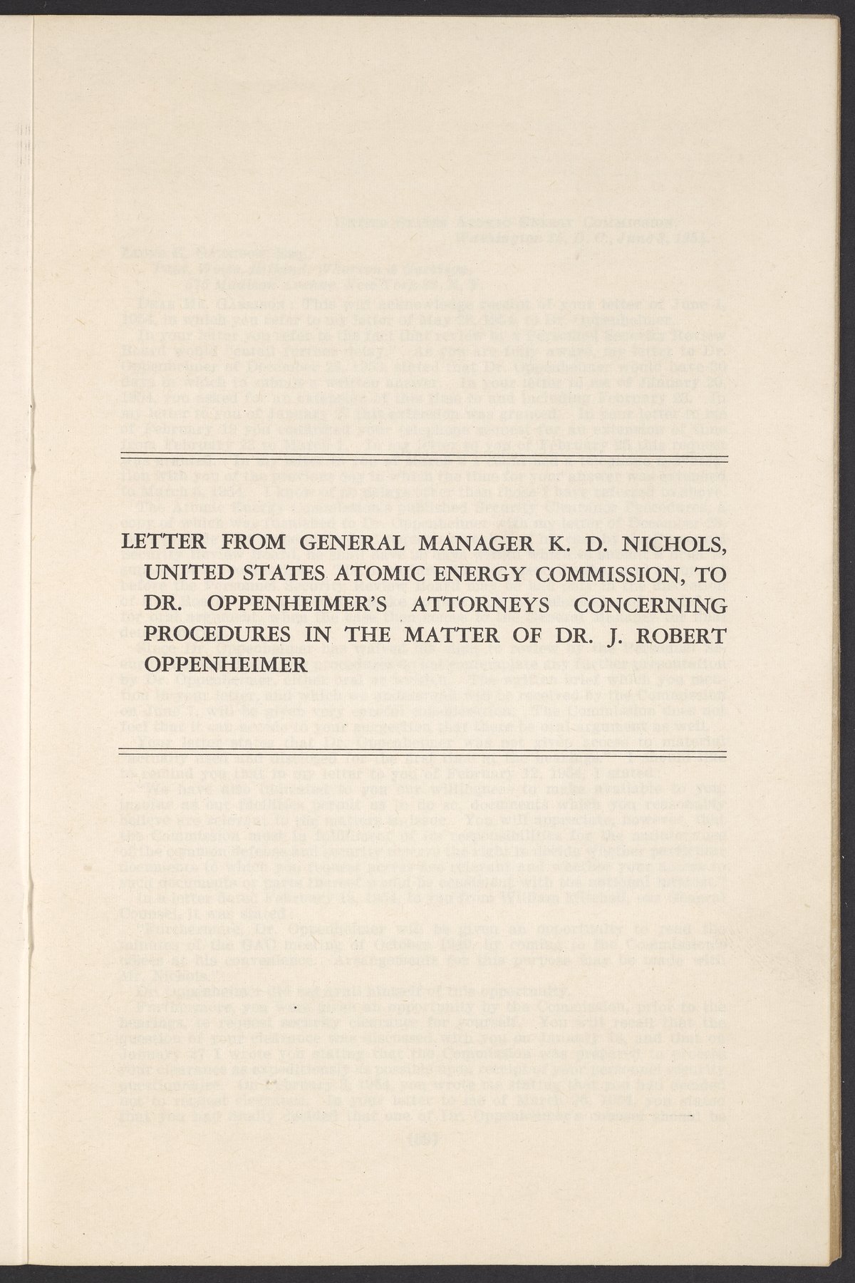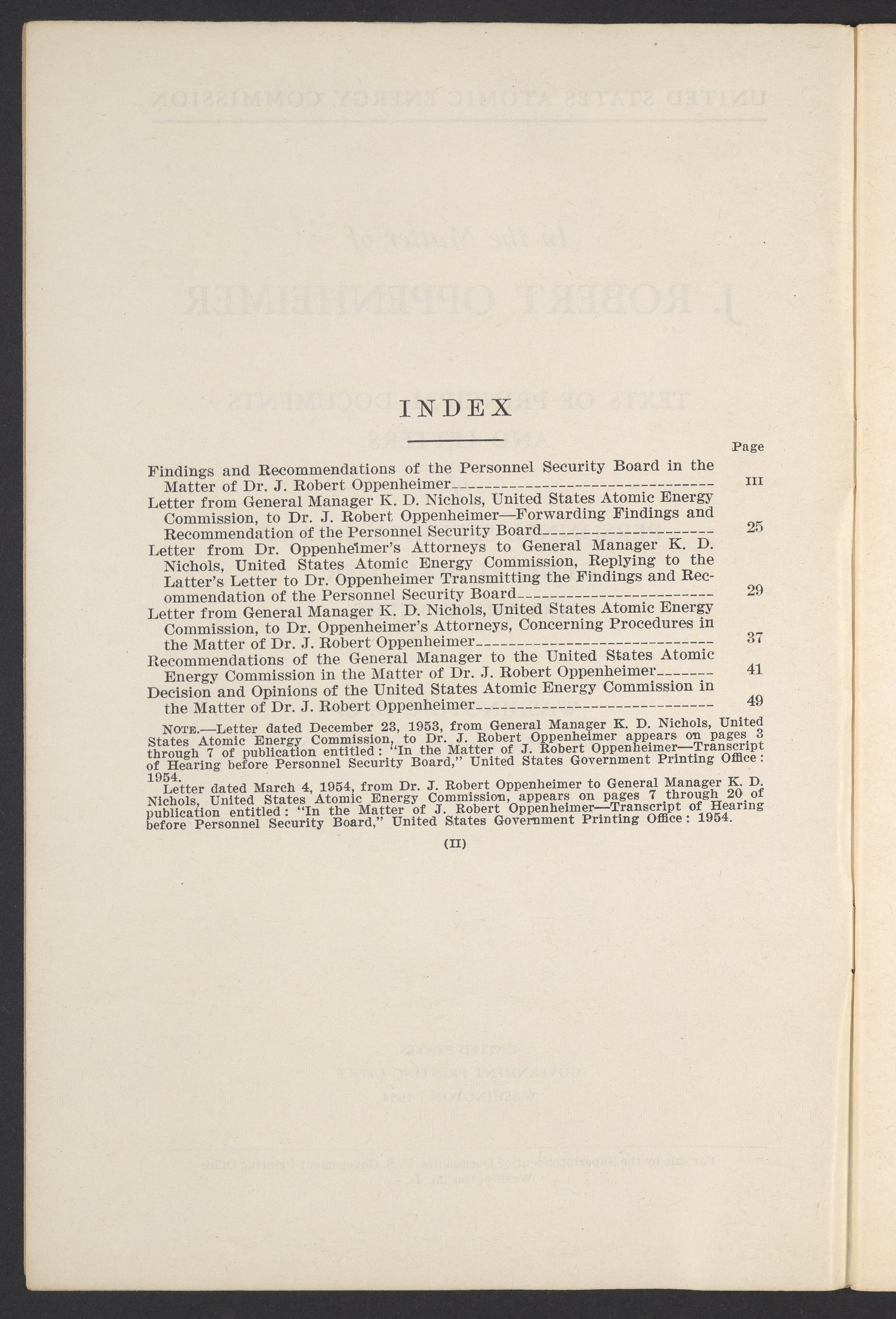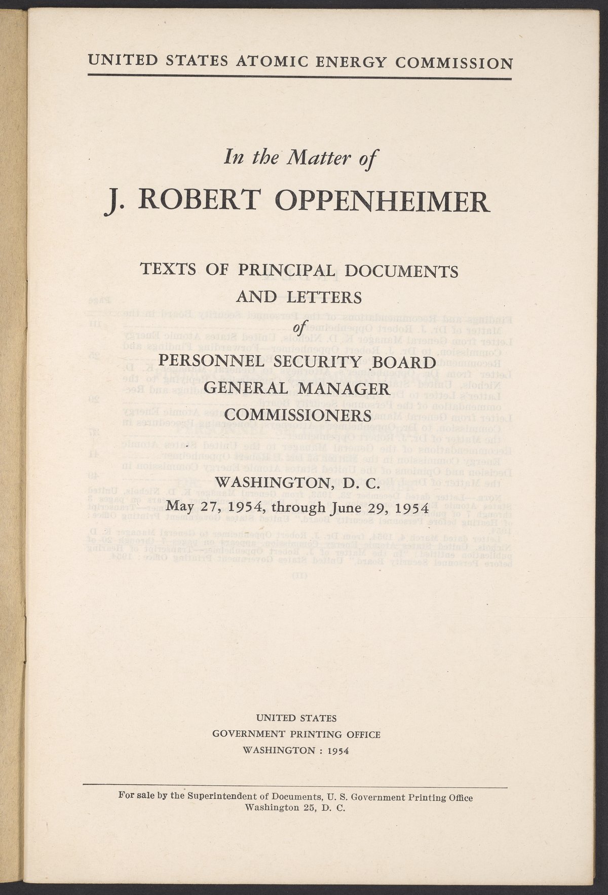 U.S. Atomic Energy Commission. “In the Matter of J. Robert Oppenheimer: Texts of Principal Documents and Letters of Personnel Security Board General Manager Commissioners.” Washington (D.C.): United States. Government Printing Office, 1954. Papers of Max Bredig, Box 8, Folder 42. Science History Institute. Philadelphia. https://digital.sciencehistory.org/works/uxuymyg.