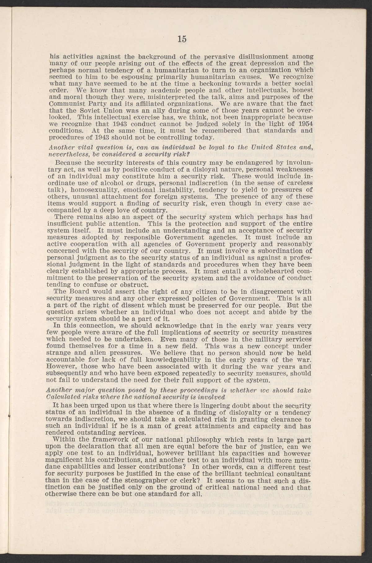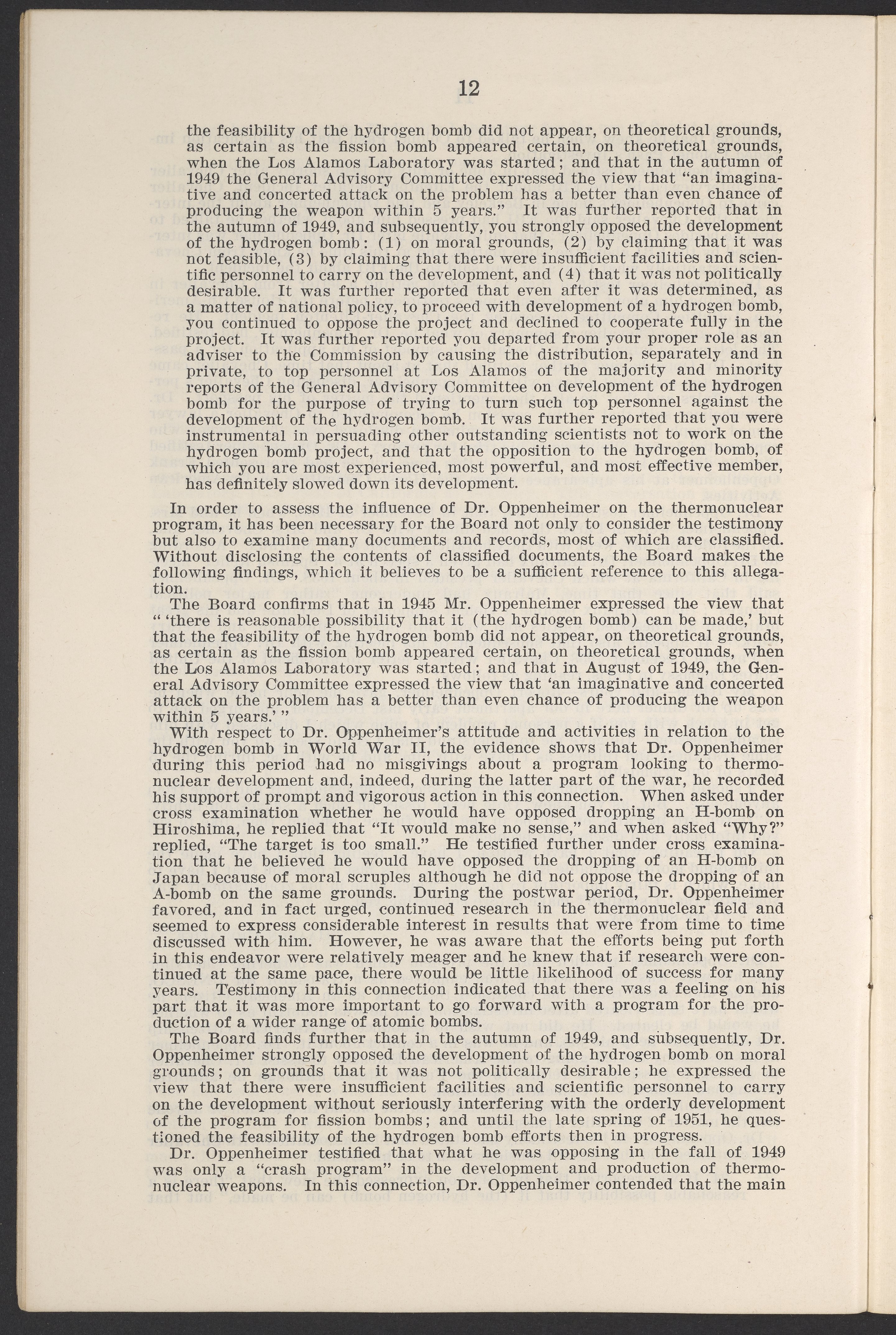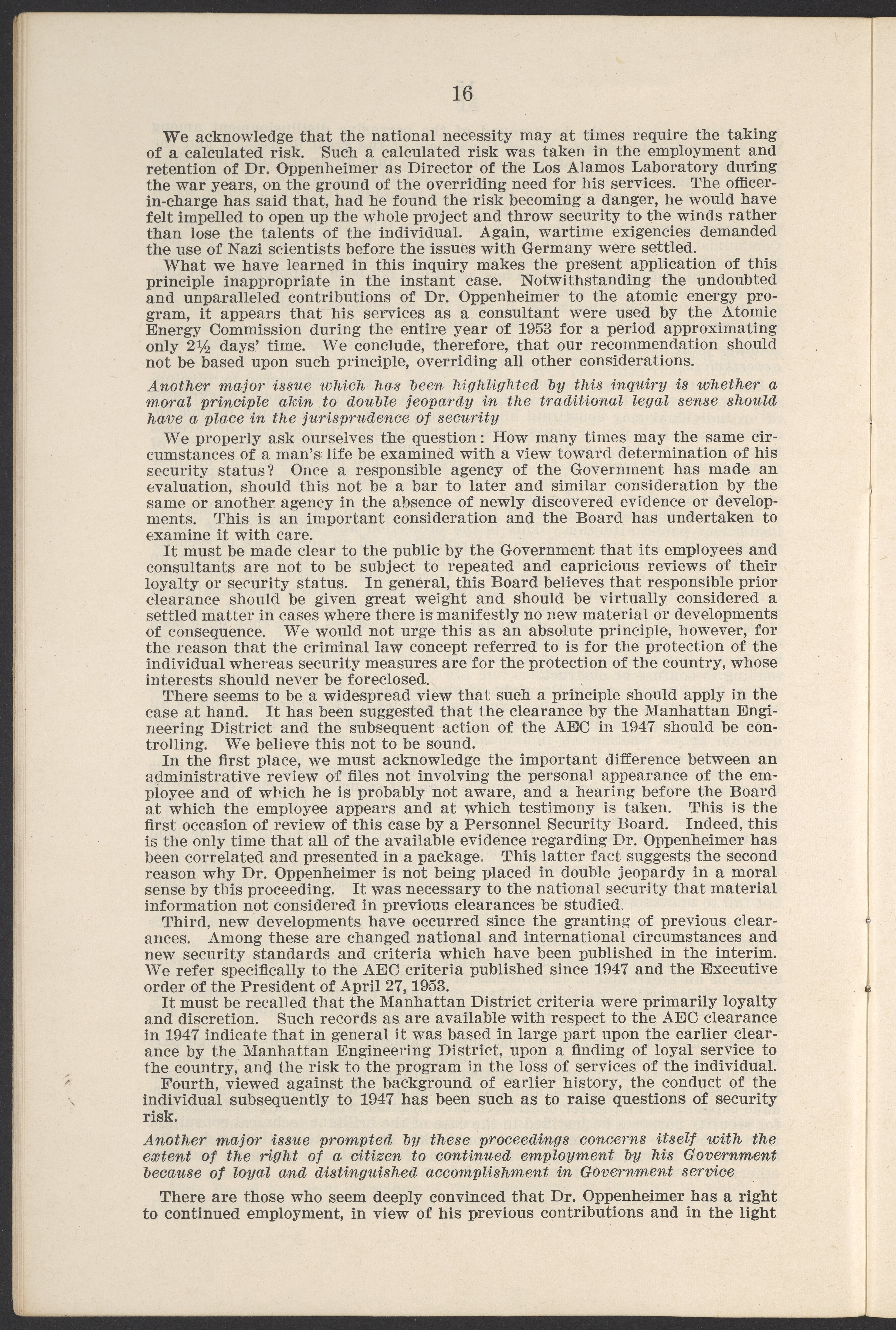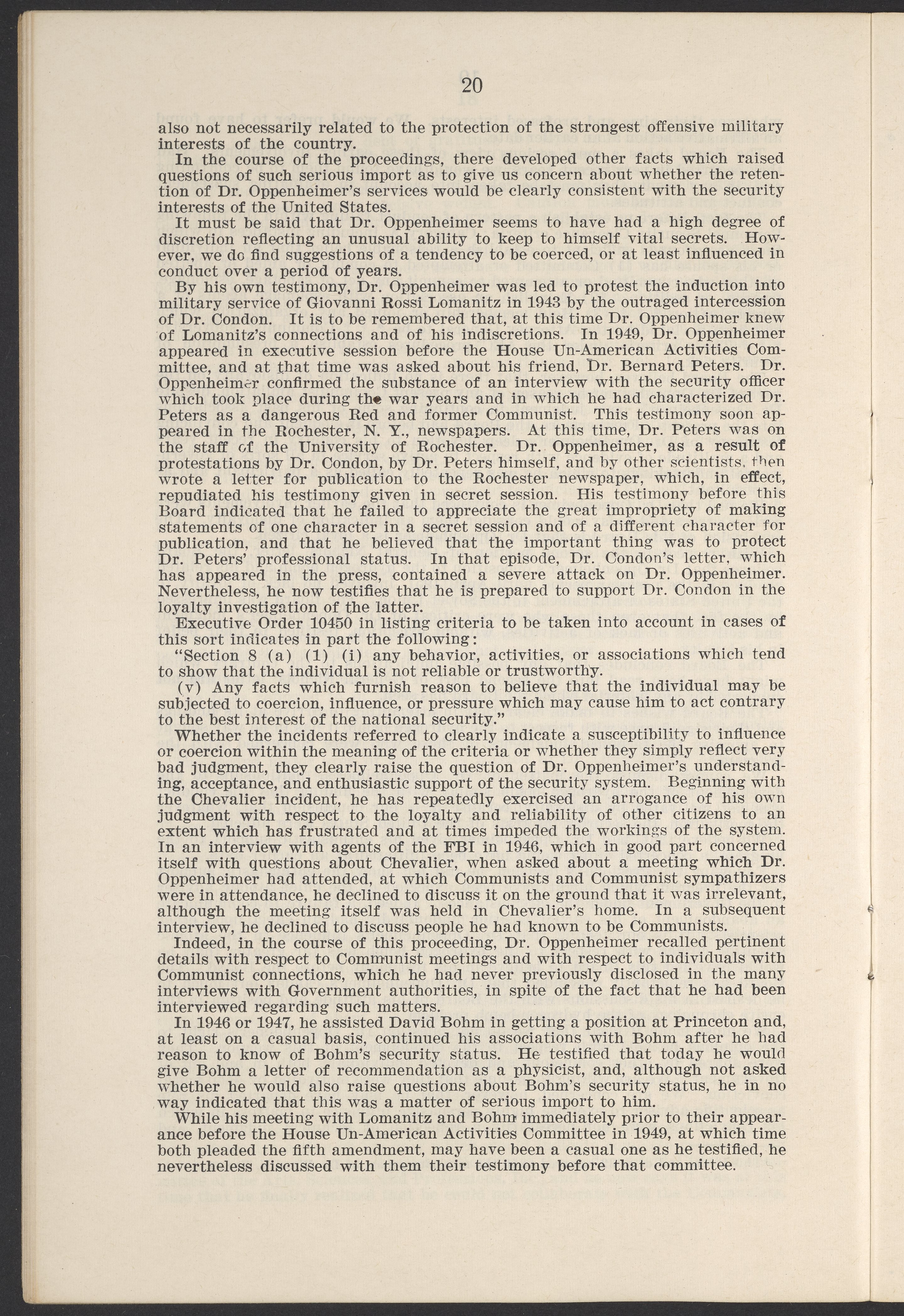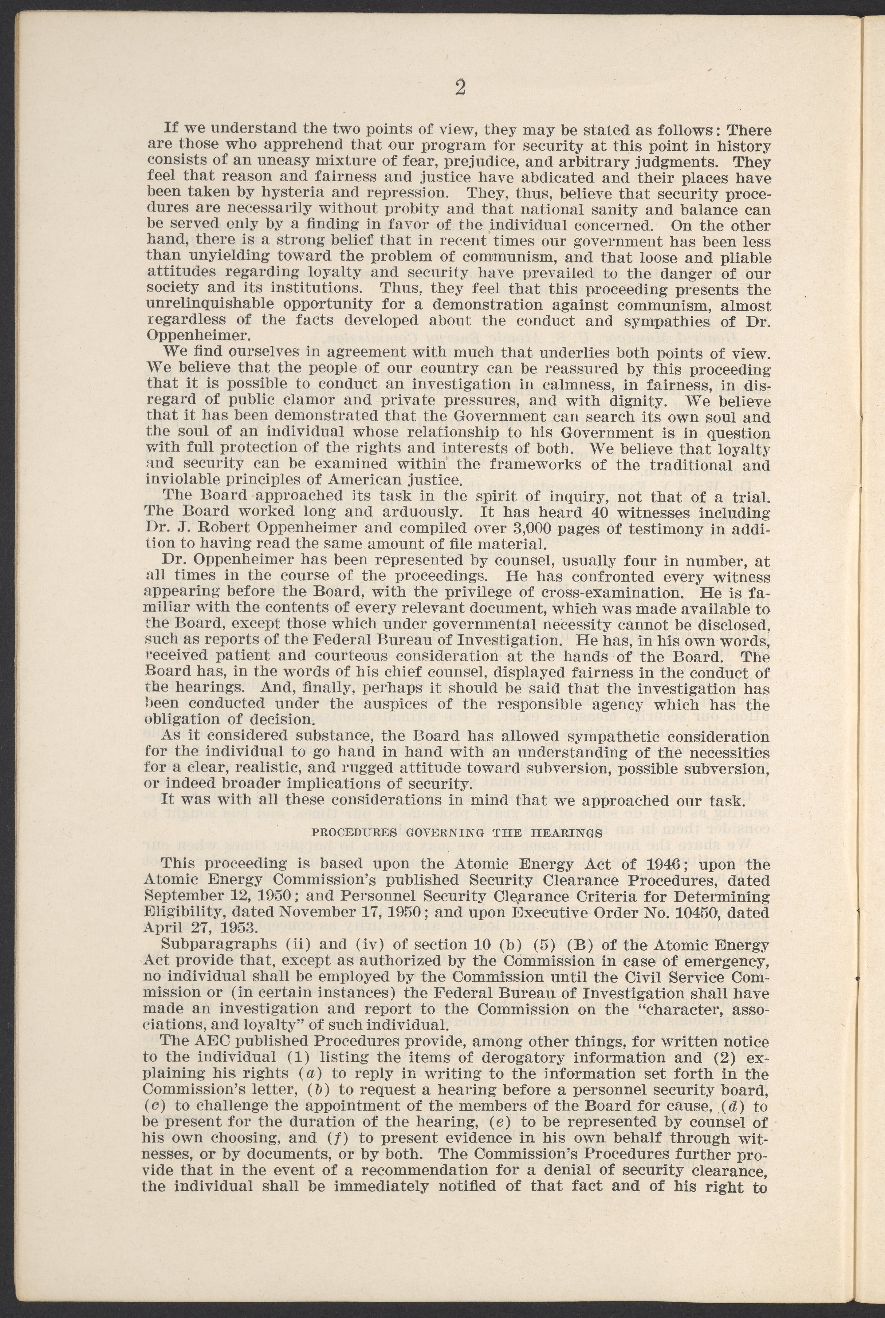 Small JPG1200 x 1811px — 385 KBLarge JPG2880 x 4347px — 2.6 MBFull-sized JPG3770 x 5690px — 4.4 MBOriginal fileTIFF — 3770 x 5690px — 61.4 MBThis booklet details the security clearance hearing of J. Robert Oppenheimer (1904-1967), a pivotal figure in the development of nuclear physics and the atomic bomb, conducted between April and May 1954. The documentation provides an overview of the hearing, including key letters, recommendations, and findings that led to the revocation of Oppenheimer's security clearance before its expiration. This decision stemmed from worries about his past affiliations and doubts over his trustworthiness despite his acknowledgement of his loyalty to the U.S.