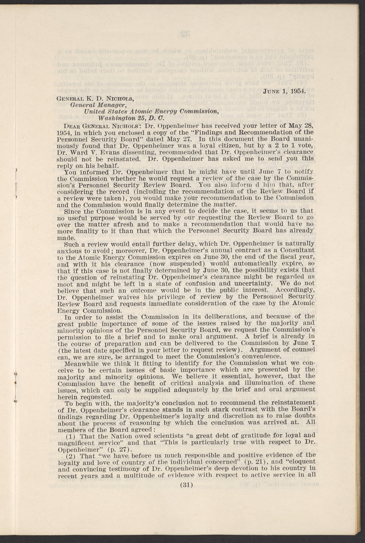 In the Matter of J. Robert Oppenheimer: Texts of Principal Documents and Letters of Personnel Security Board General Manager Commissioners