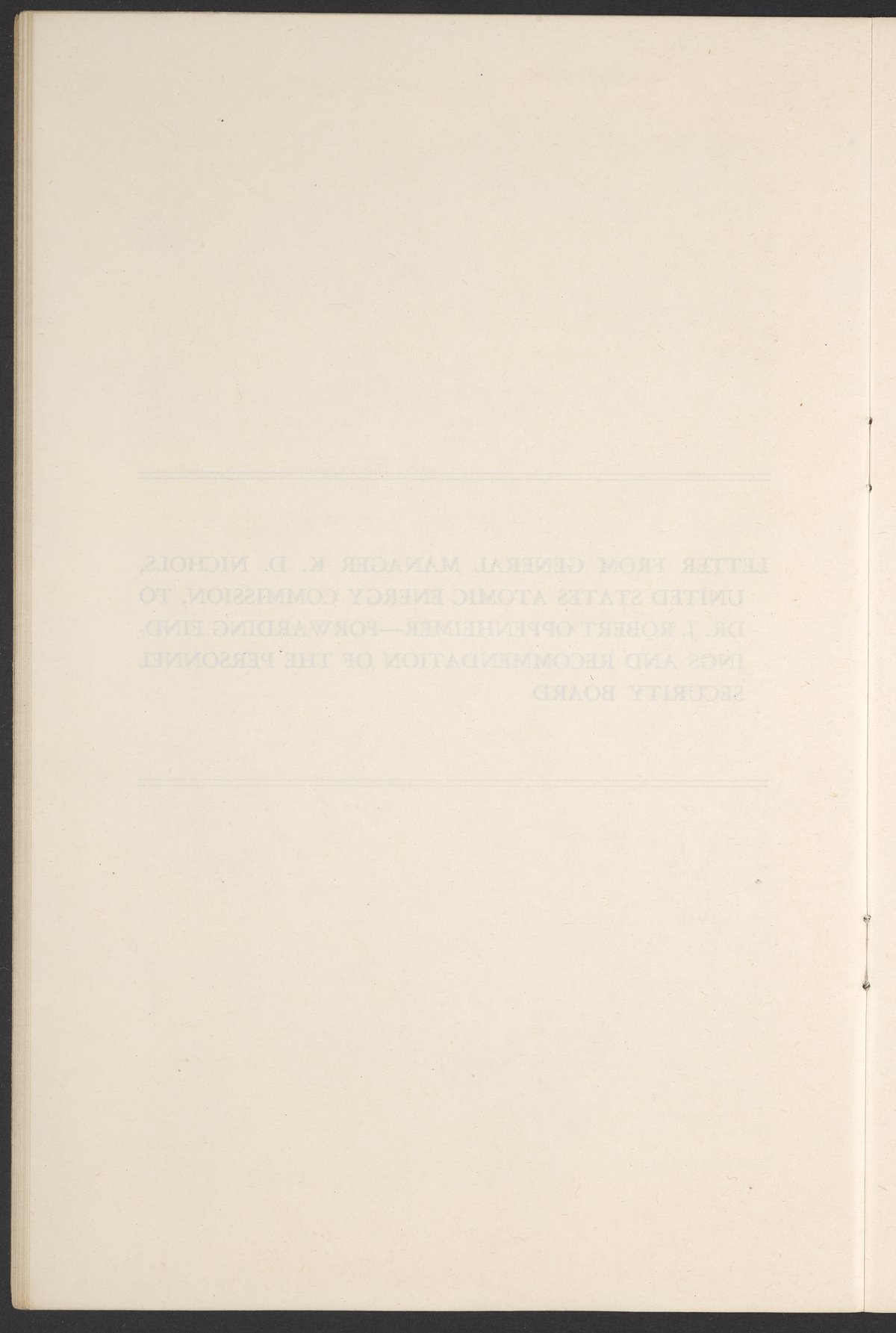 U.S. Atomic Energy Commission. “In the Matter of J. Robert Oppenheimer: Texts of Principal Documents and Letters of Personnel Security Board General Manager Commissioners.” Washington (D.C.): United States. Government Printing Office, 1954. Papers of Max Bredig, Box 8, Folder 42. Science History Institute. Philadelphia. https://digital.sciencehistory.org/works/uxuymyg.