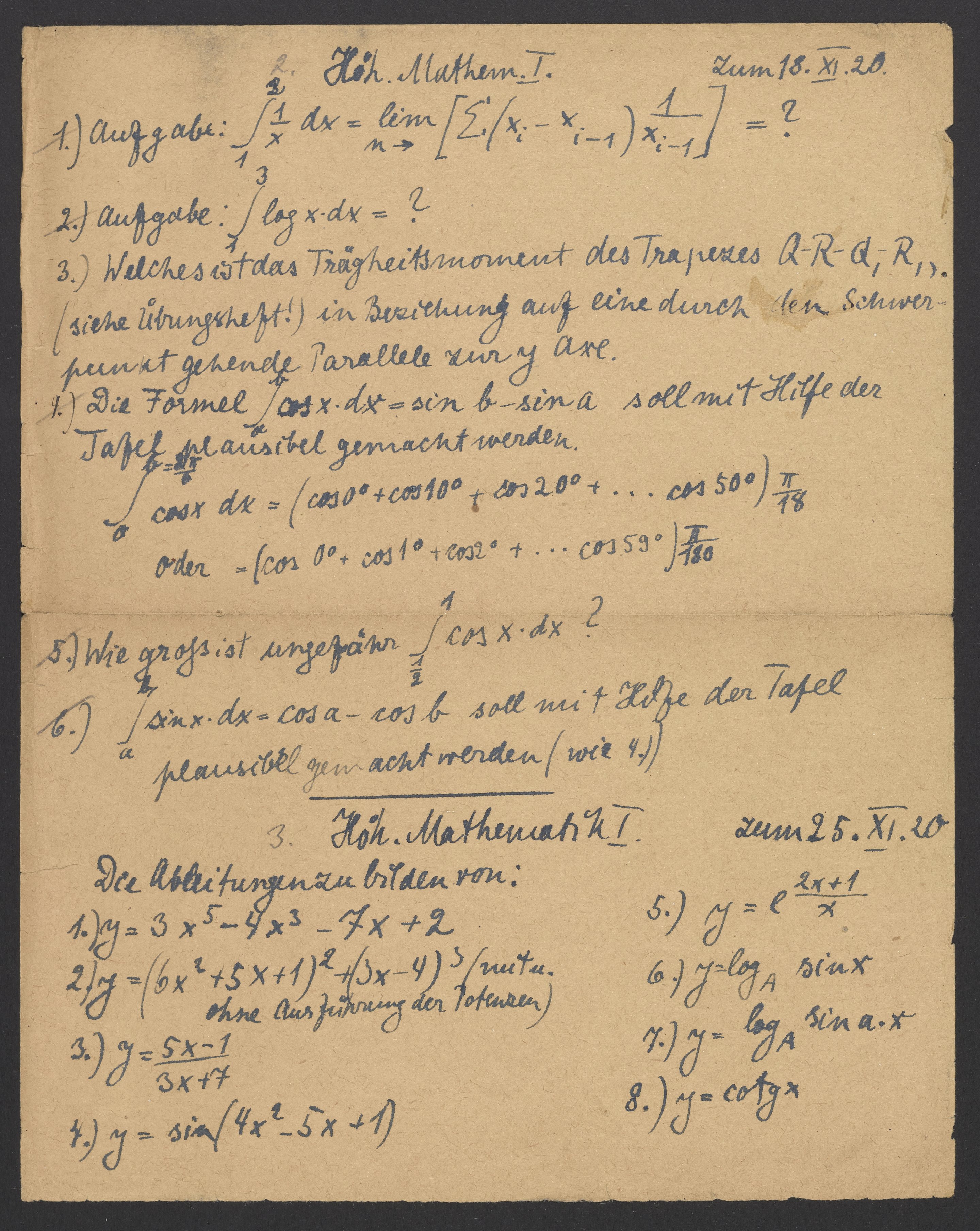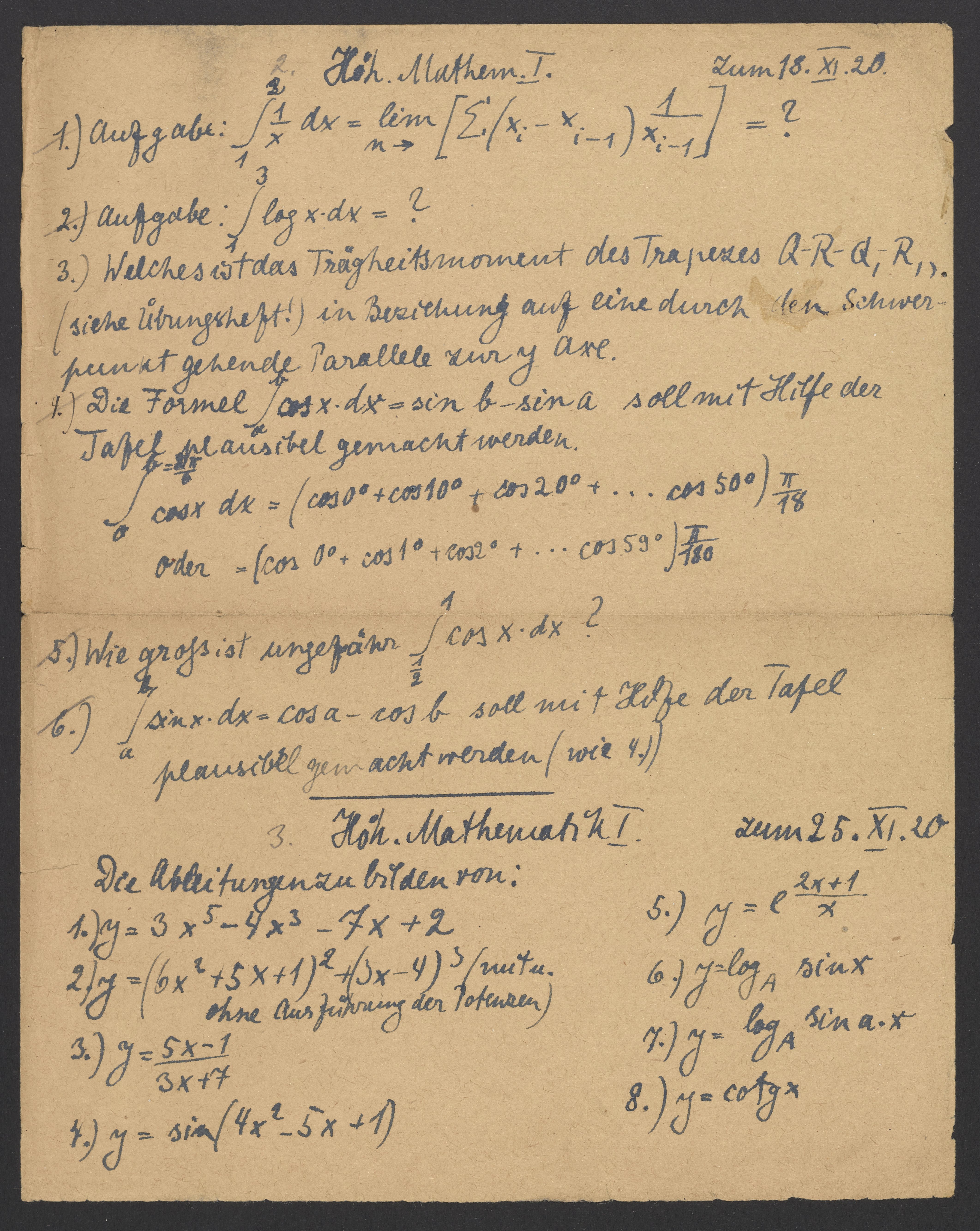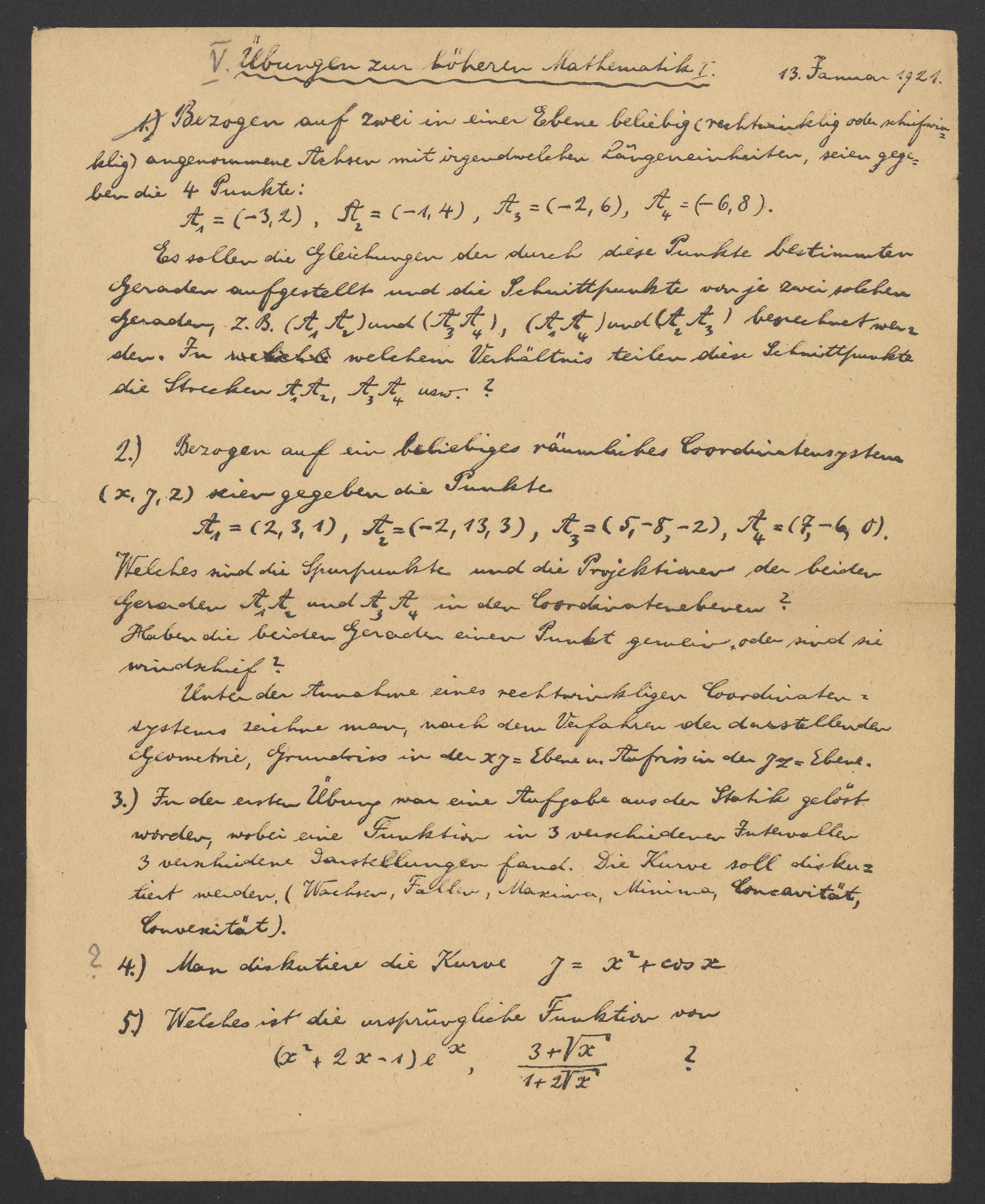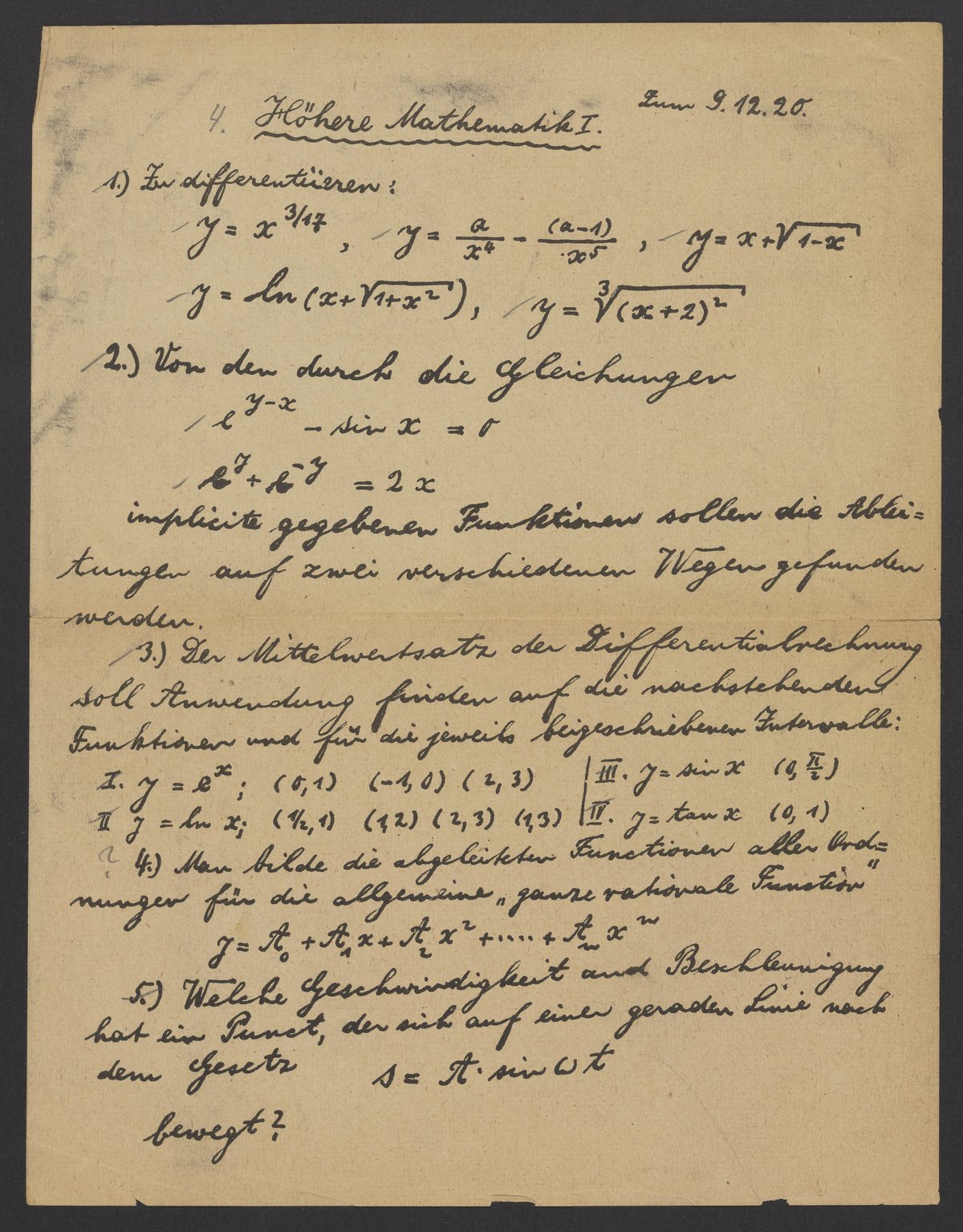 Bredig, Georg. “Problem Set for a Mathematics Course, 1920,” December 9, 1920. Papers of Georg and Max Bredig, Box 5, Folder 9. Science History Institute. Philadelphia. https://digital.sciencehistory.org/works/v1cmcfx.