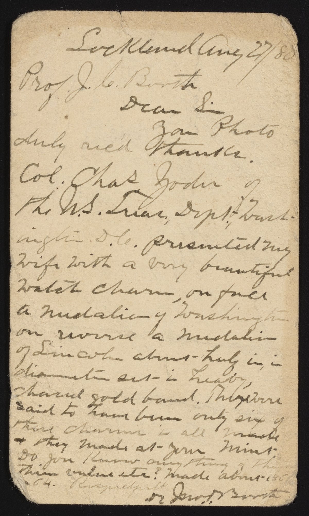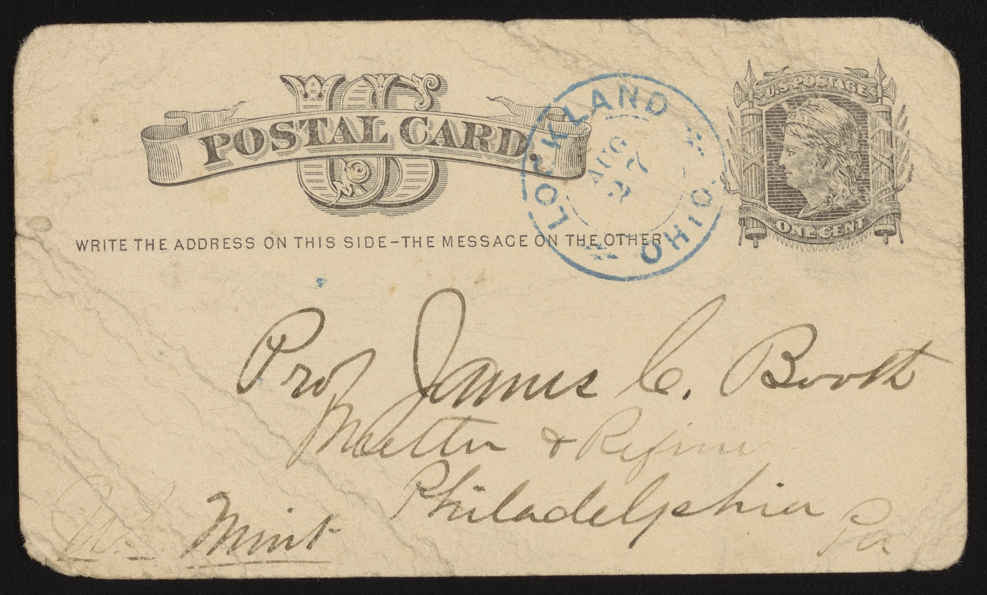 “Postcard from an Unidentified Sender to James Curtis Booth.” Lockland, Ohio, August 27, 1880. Papers of James Curtis Booth, Box 8, Folder 18. Science History Institute. Philadelphia. https://digital.sciencehistory.org/works/v28jjzj.