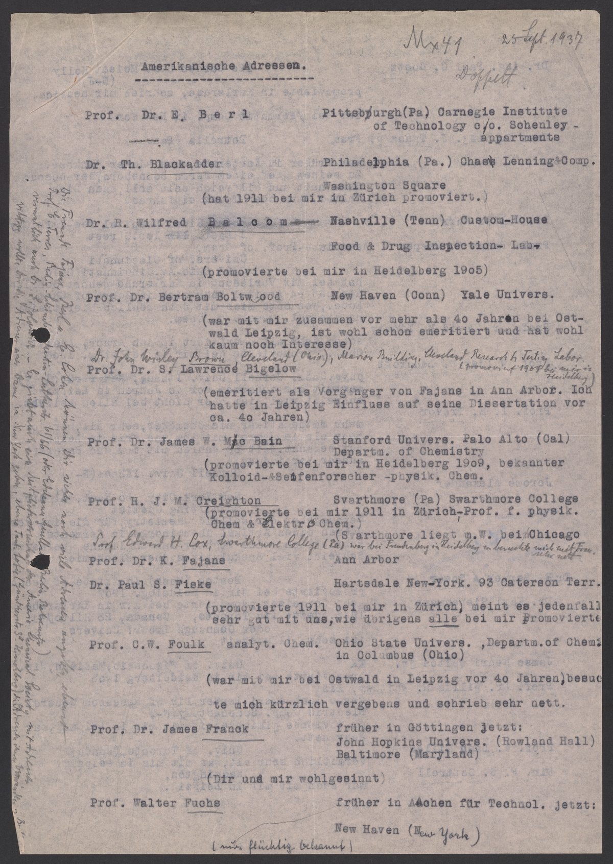 Bredig, Max Albert. “Amerikanische Adressen,” September 25, 1937. Papers of Georg and Max Bredig, Box 10, Folder 17. Science History Institute. Philadelphia. https://digital.sciencehistory.org/works/v3l4sqk.