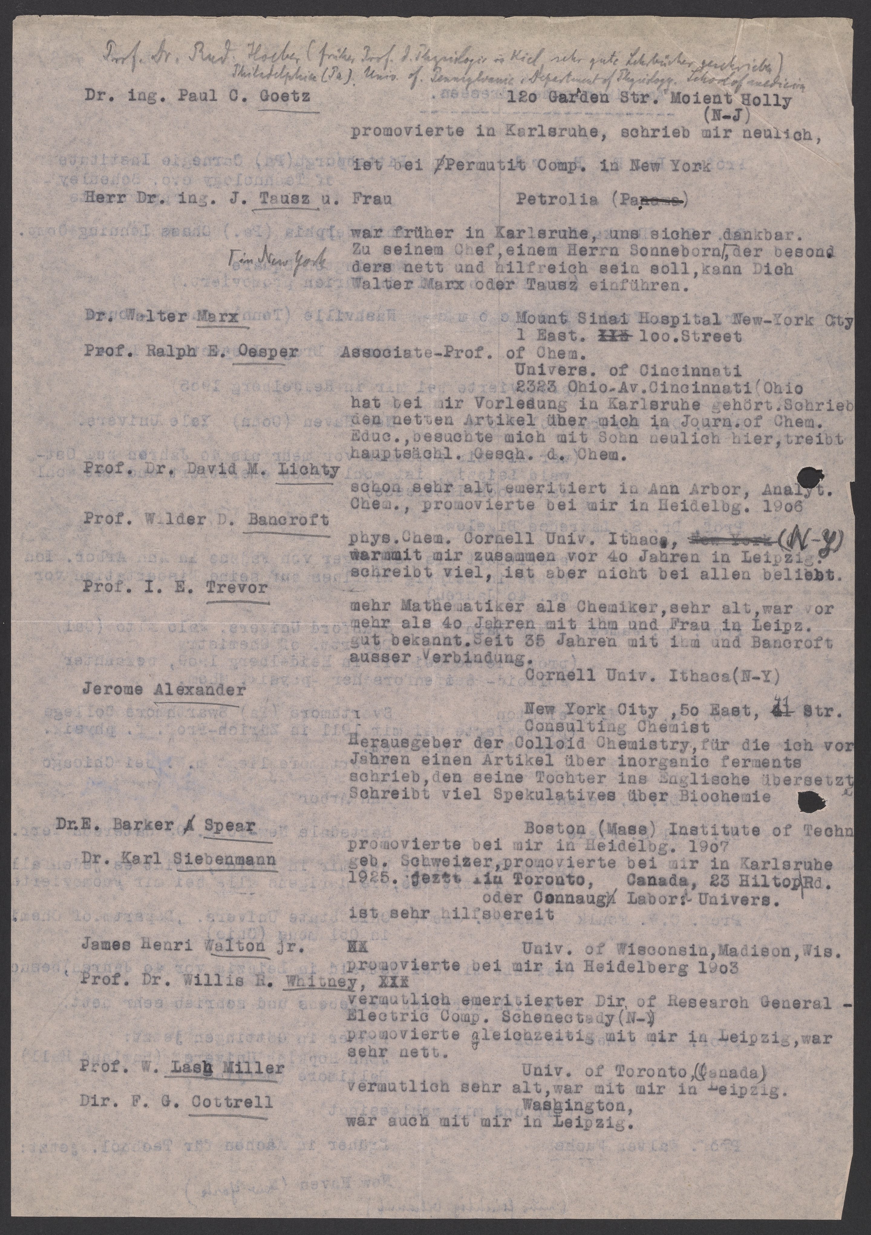Contacts include Ernst Berl (1877-1946), Thomas Blackadder (1887-1953), Bertram Boltwood (1870-1927), Samuel Lawrence Bigelow (1870 - 1947), James W. McBain (1882–1953), H. Jermain Creighton, Kasimir Fajans (1887-1975), Paul S. Fiske, James Franck (1882-1964), Walter Fuchs, Paul Goetz, Jeno Eugen Tausz (1891-1964), Ralph Edward Oesper (1886-1977), David M. Lichty, Wilder Dwight Bancroft (1867-1953), Joseph E. Trevor (1864-1941), Jerome Alexander (1876–1959), Ellwood Barker Spear (1875-1943), Karl Siebenmann, James Henri Walton Jr., Willis Rodney Whitney (1868-1958), William Lash Miller (1866-1940), and Frederick Gardner Cottrell (1877-948).