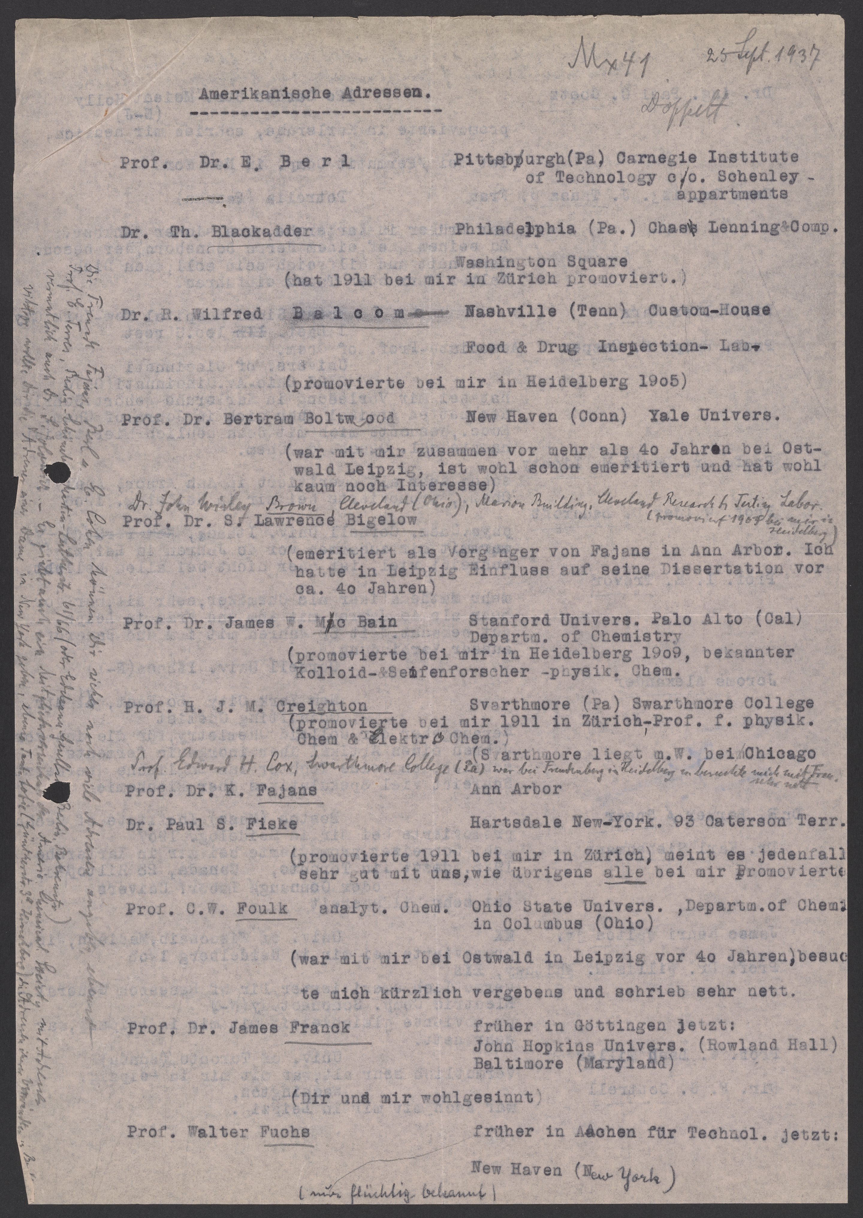 Bredig, Max Albert. “Amerikanische Adressen,” September 25, 1937. Papers of Georg and Max Bredig, Box 10, Folder 17. Science History Institute. Philadelphia. https://digital.sciencehistory.org/works/v3l4sqk.