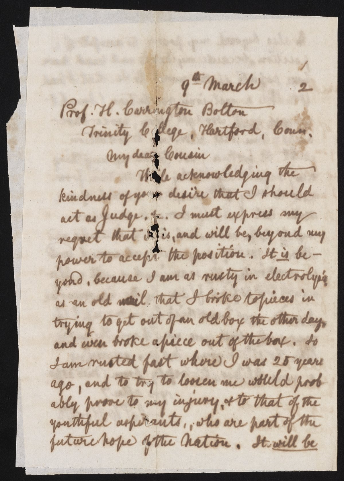 Small JPG1200 x 1679px — 319 KBLarge JPG2880 x 4031px — 1.7 MBFull-sized JPG3364 x 4708px — 2.3 MBOriginal fileTIFF — 3364 x 4708px — 45.4 MBJames Curtis Booth (1810-1888) writes to Henry Carrington Bolton (1843-1903) an American chemist, professor of science at Trinity College, and Booth's relative. Booth declines Bolton's invitation to serve as a judge in a student essay contest.