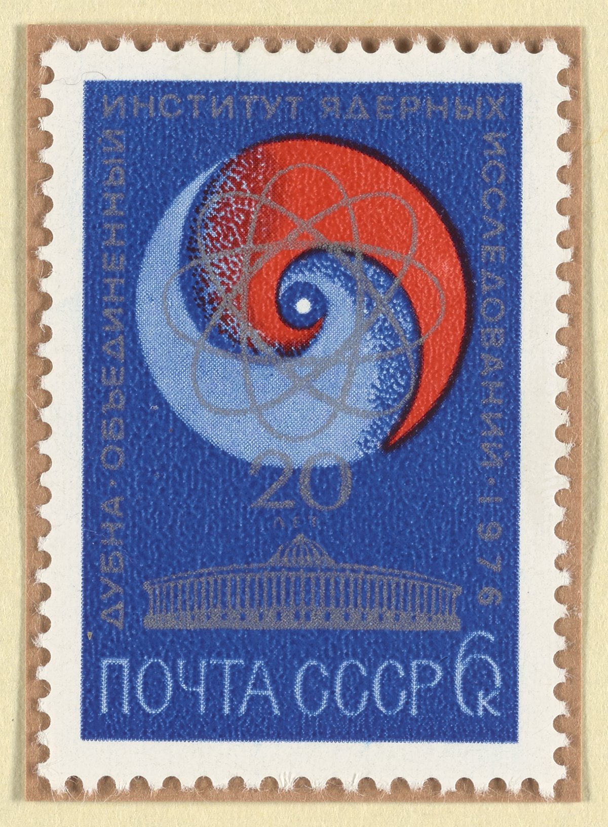 “Soviet Postage Stamp Commemorating the 20th Anniversary of the Institute for Nuclear Research of the Russian Academy of Sciences.” Soviet Union, 1976. Witco Stamp Collection, Box 3. Science History Institute. Philadelphia. https://digital.sciencehistory.org/works/v405s943f.