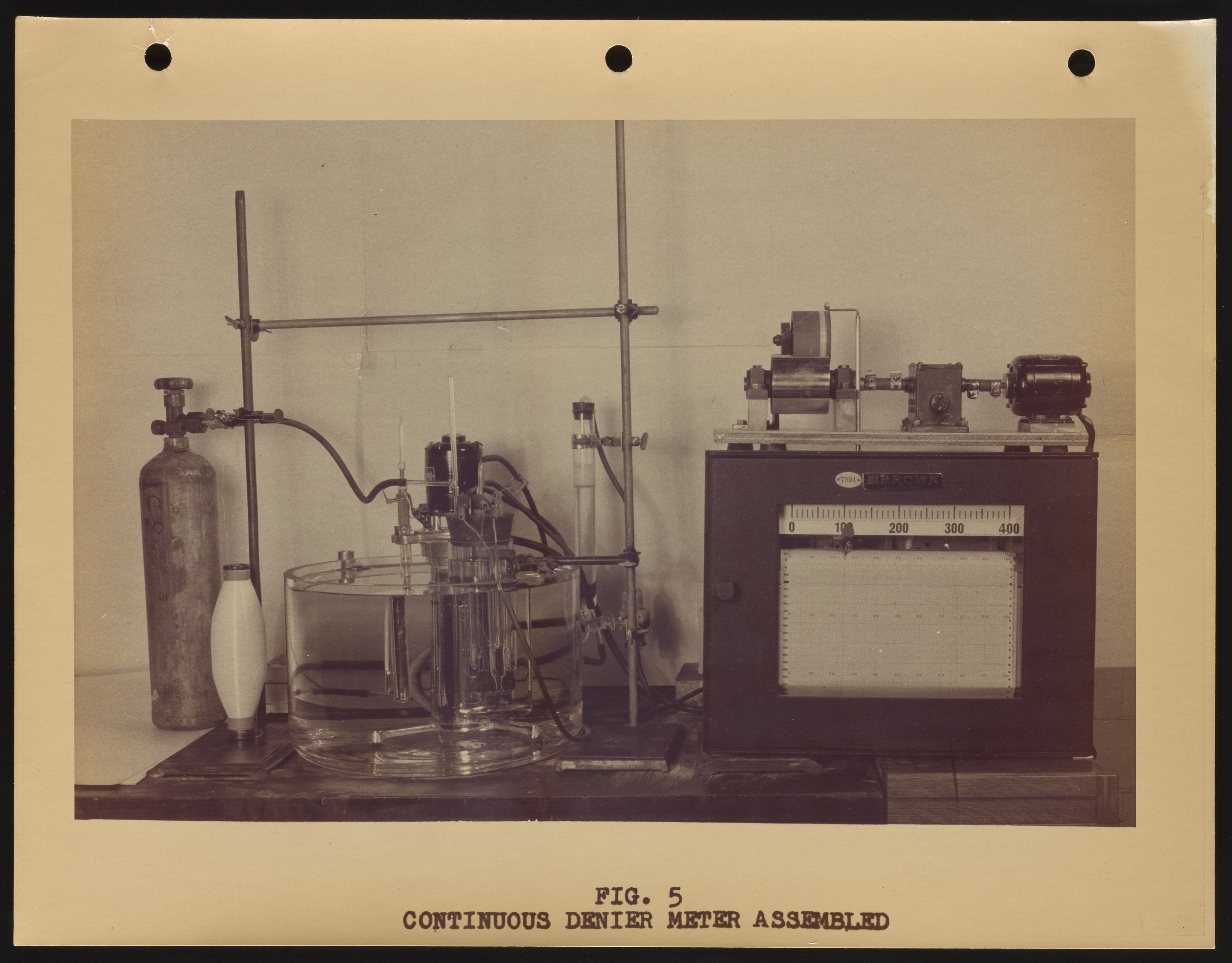 “Continuous Denier Meter Used in Production of Synthetic Fibers,” March 1947. Joseph X. Labovsky Collection of Nylon Photographs and Ephemera, Box 3. Science History Institute. Philadelphia. https://digital.sciencehistory.org/works/v405s9450.