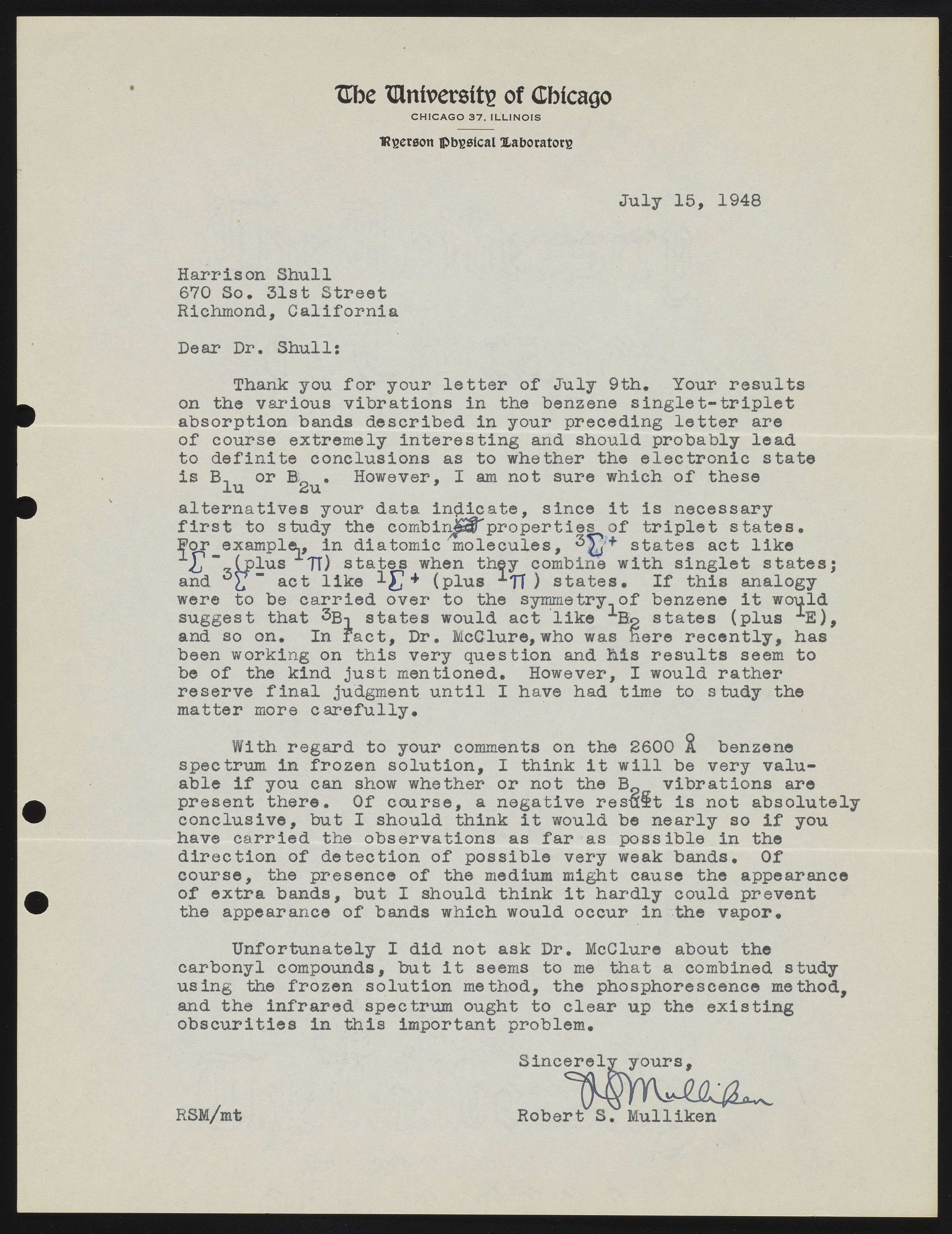 Letter from Robert S. Mulliken to Harrison Shull, 1948