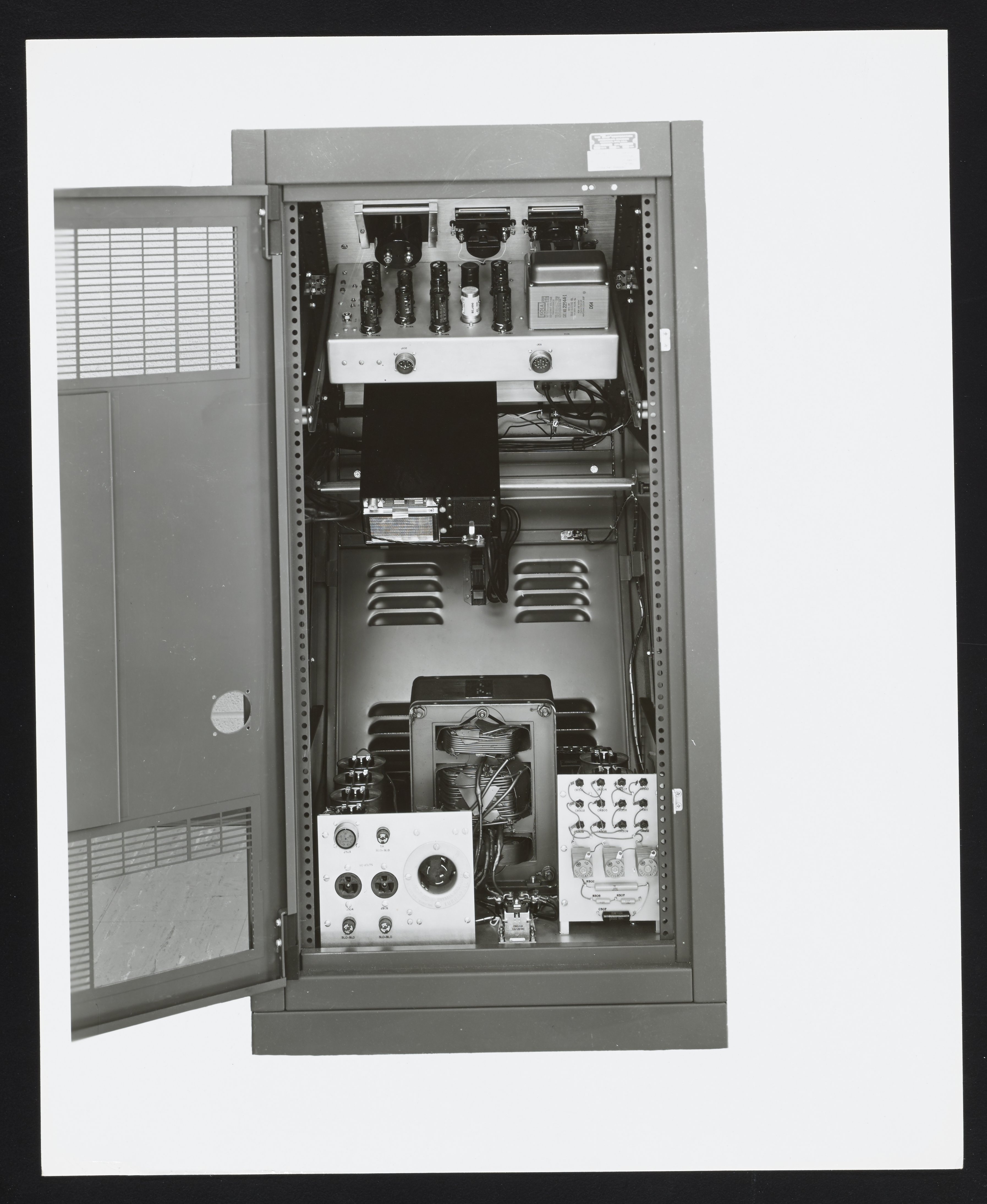 Interior view of the power supply of a Bendix Corporation Knudsen Cell Inlet System. Inlet systems are typically used to introduce samples into a mass spectrometer's ion source for analysis. The Knudsen Cell Inlet System allowed for rapid quantitative determinations of molecular weights and heats of vaporization, as well as qualitative determinations of molecular species in gas phase.