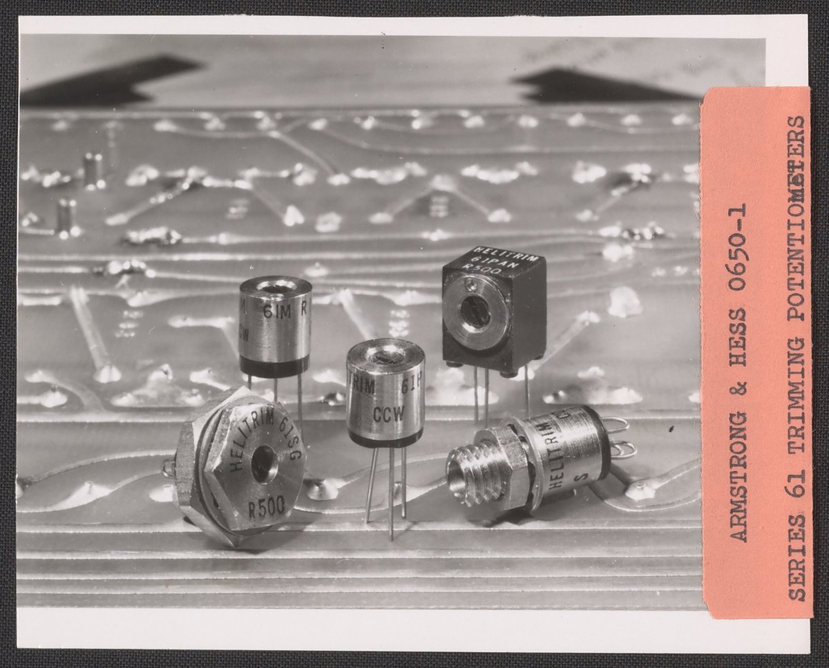 Armstrong & Hess. “Helipot Series 61 Trimming Potentiometers,” 1950–1969. Beckman Historical Collection, Box 85. Science History Institute. Philadelphia. https://digital.sciencehistory.org/works/v405s974f.