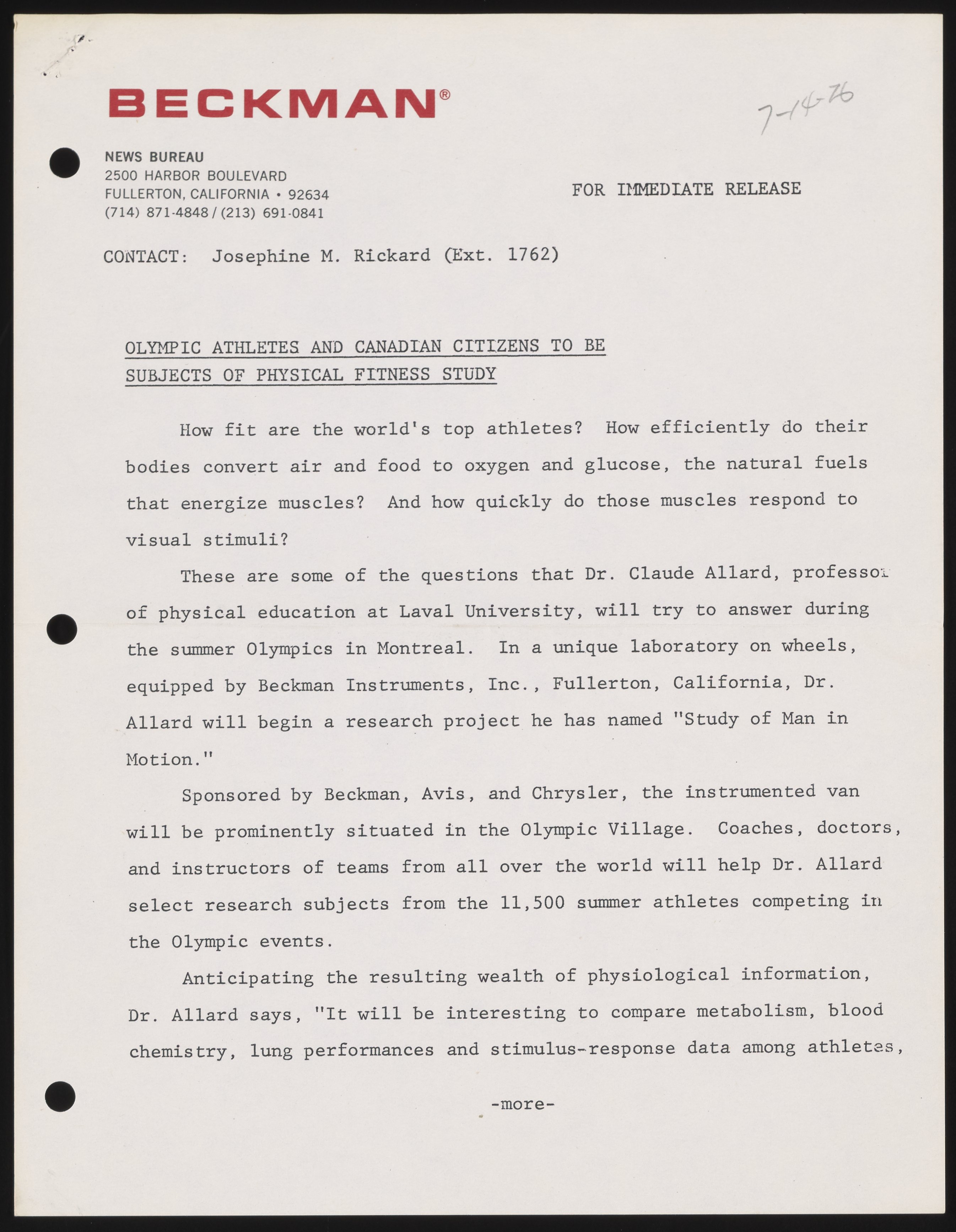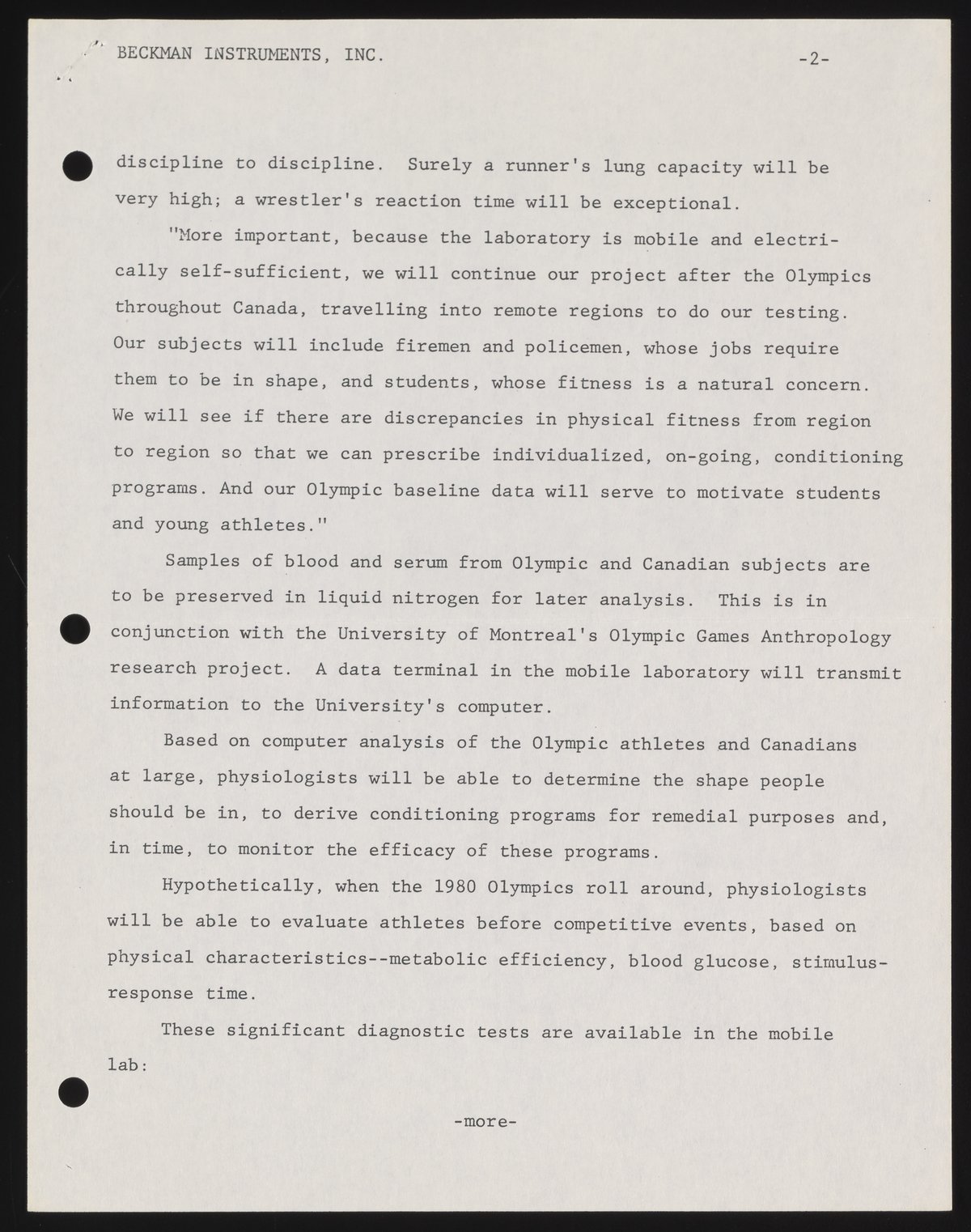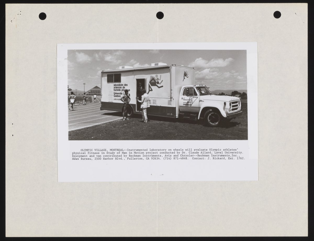 Small JPG1200 x 1547px — 224 KBFull-sized JPG2691 x 3470px — 791 KBOriginal fileTIFF — 2691 x 3470px — 26.8 MBThe press release announces physical education professor Claude Allard's "Study of Man in Motion," operating in conjunction with an anthropological study. A mobile van, including equipment supplied by Beckman Instruments, was to be dispatched to Montreal's Olympic Village to run various physiological tests on competing athletes, and later cross the country running similar tests in different regions.
