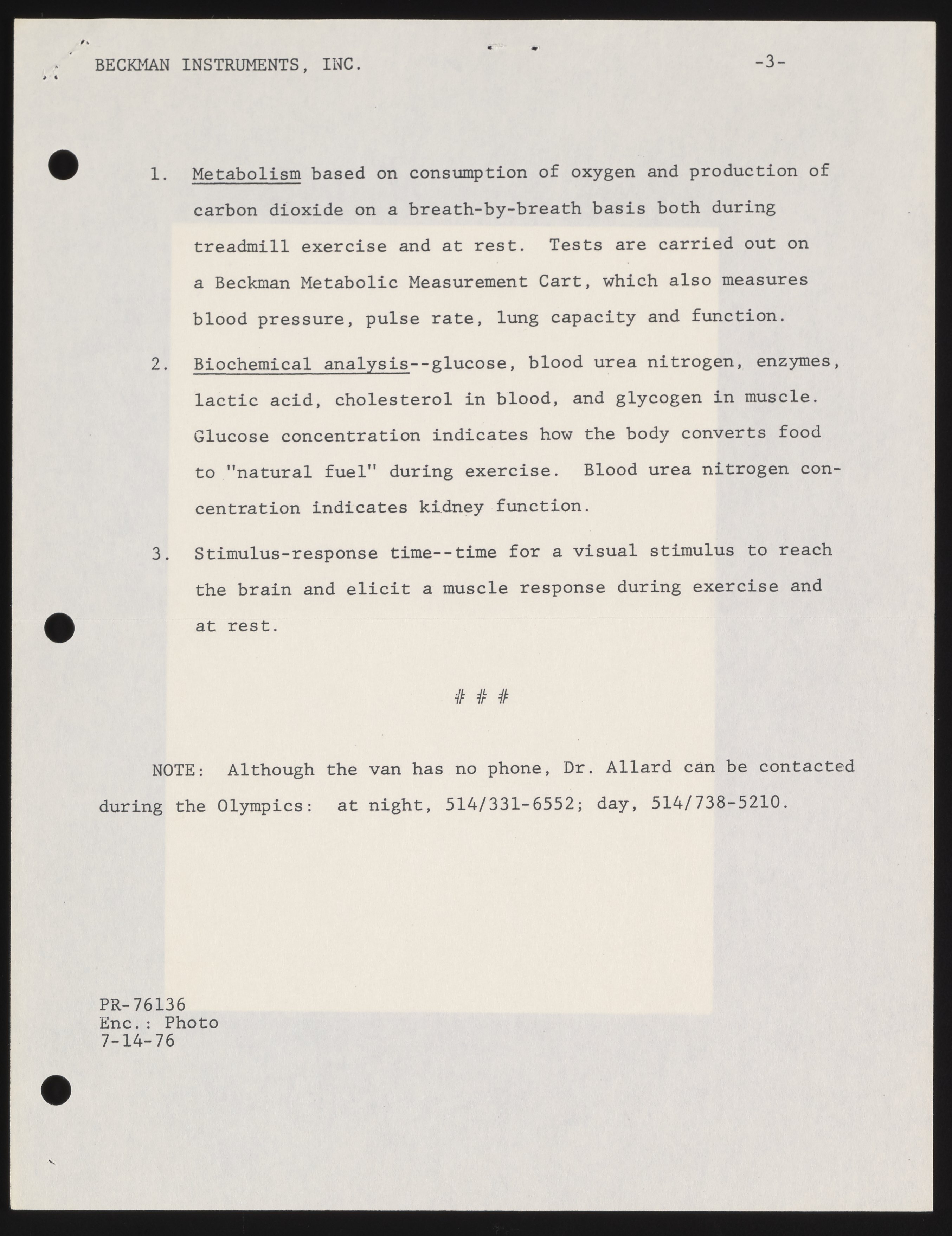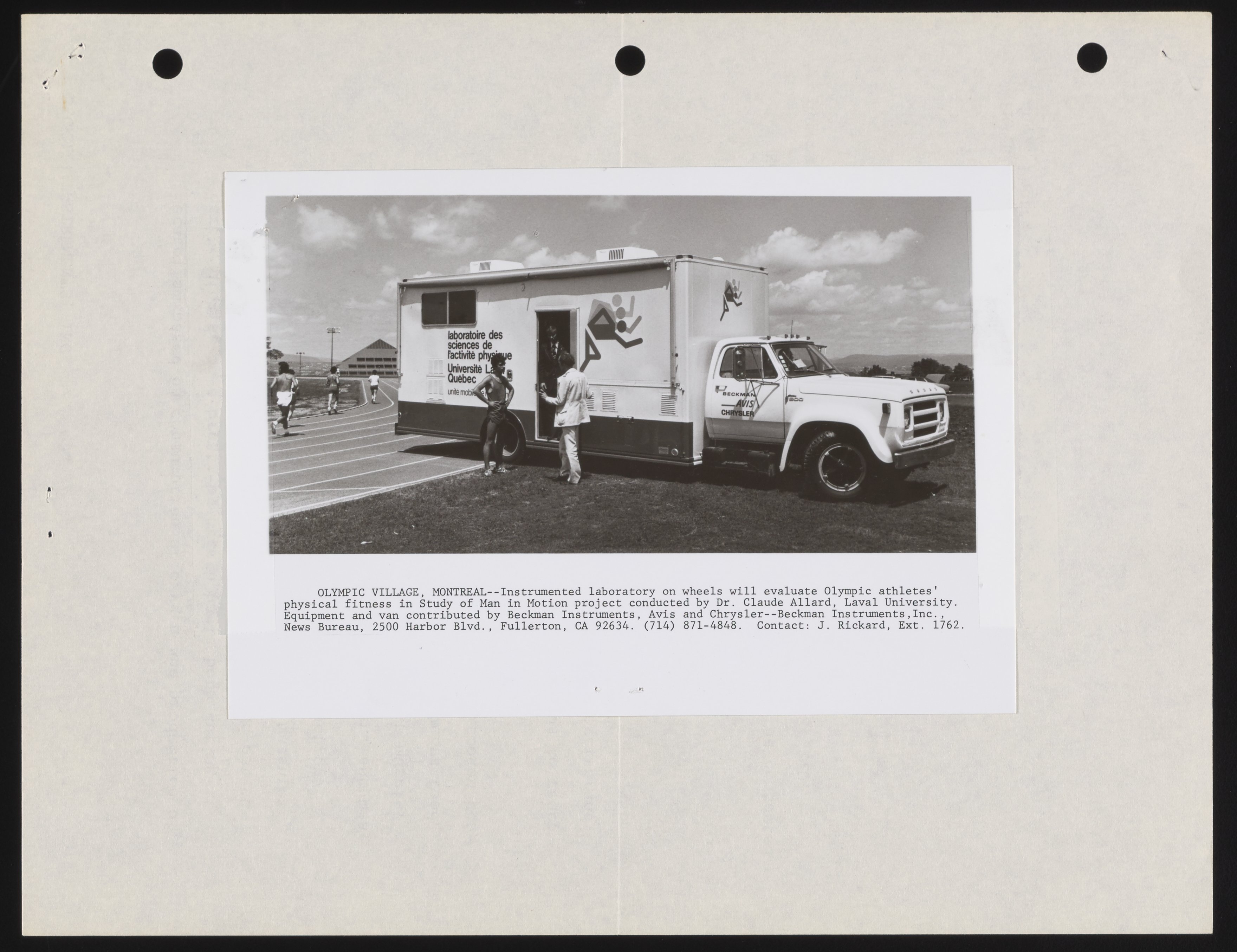 Small JPG1200 x 1547px — 224 KBFull-sized JPG2691 x 3470px — 791 KBOriginal fileTIFF — 2691 x 3470px — 26.8 MBThe press release announces physical education professor Claude Allard's "Study of Man in Motion," operating in conjunction with an anthropological study. A mobile van, including equipment supplied by Beckman Instruments, was to be dispatched to Montreal's Olympic Village to run various physiological tests on competing athletes, and later cross the country running similar tests in different regions.