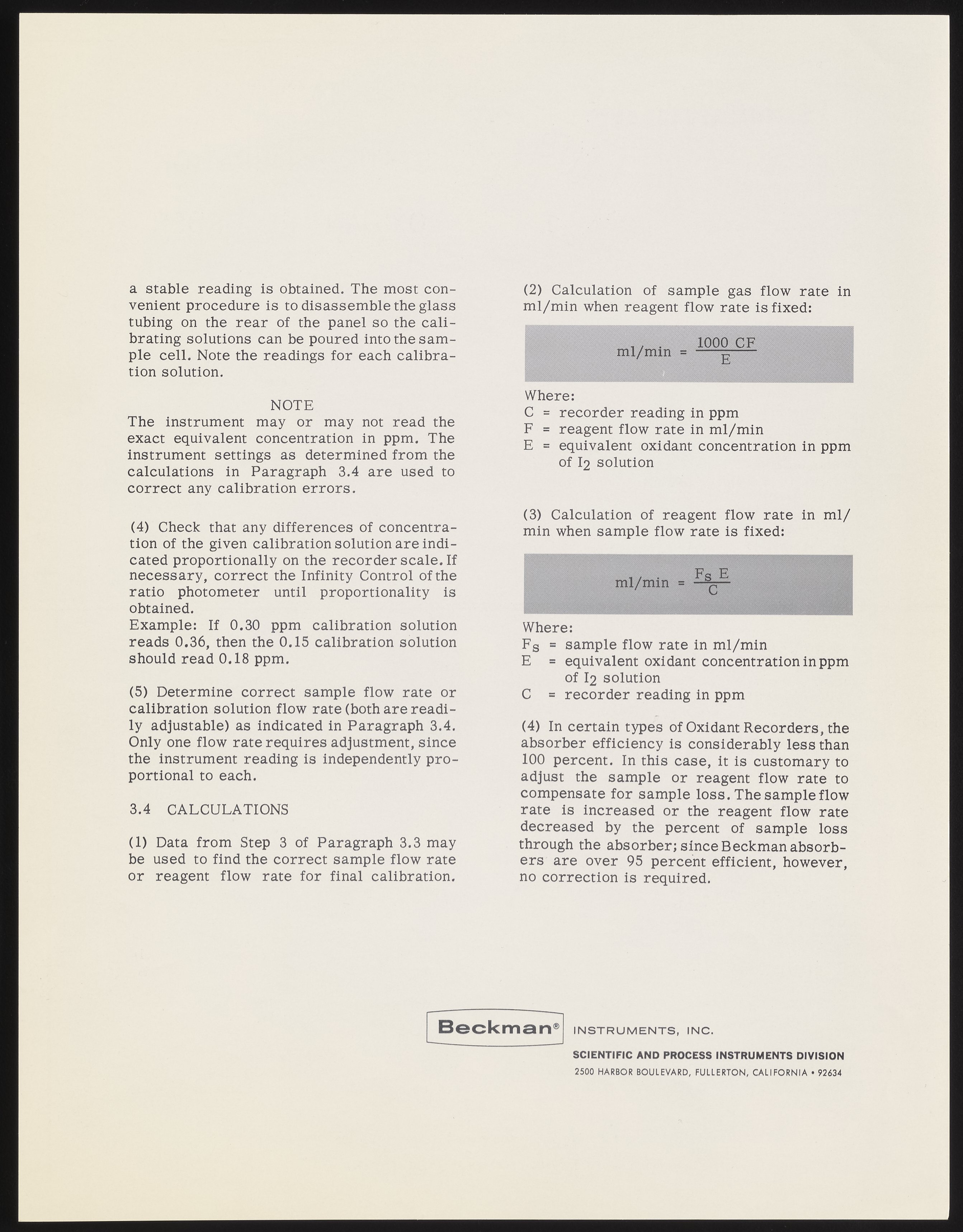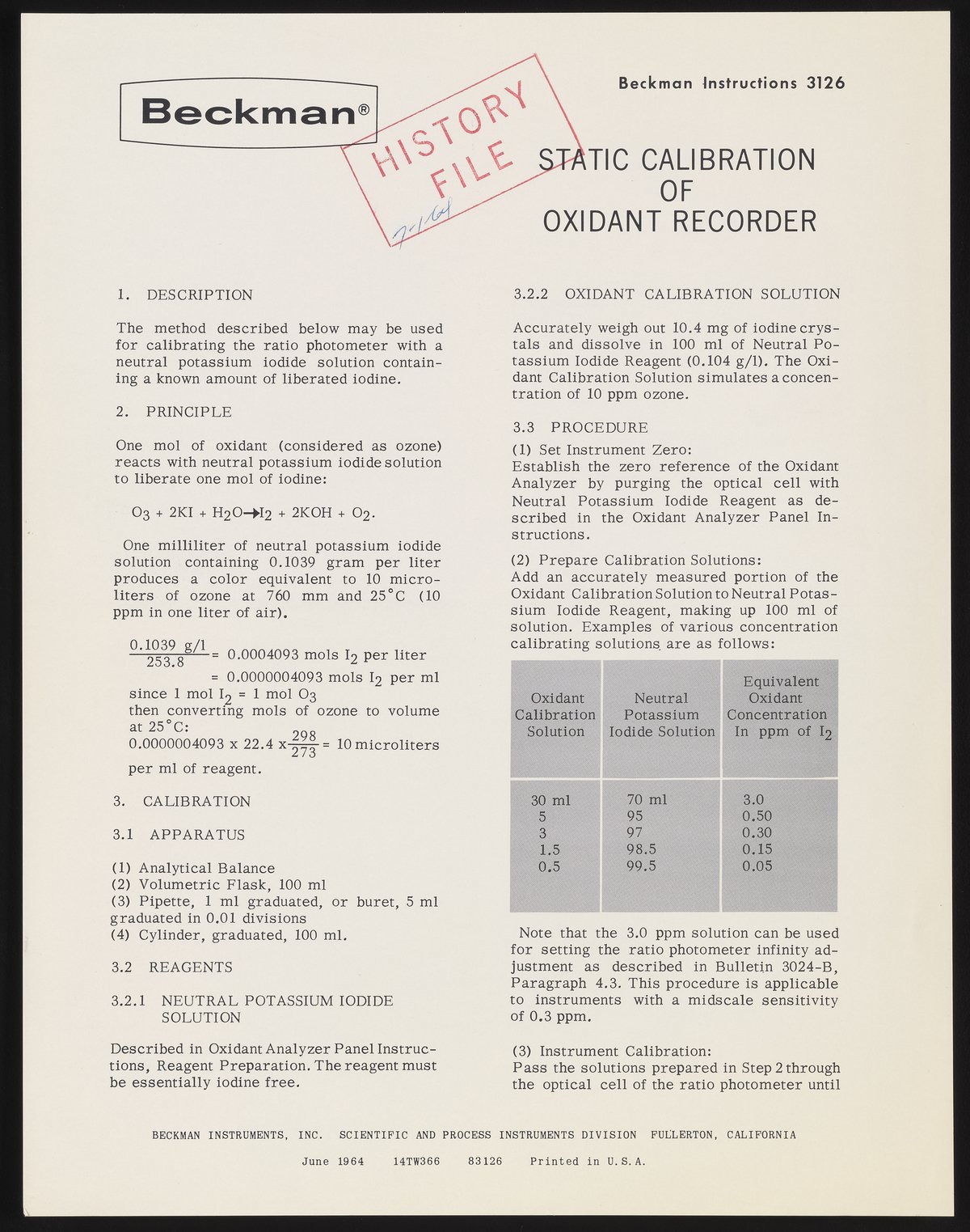 Beckman Instruments, Inc. “Static Calibration of Oxidant Recorder,” June 1964. Beckman Historical Collection, Box 113, Folder 76. Science History Institute. Philadelphia. https://digital.sciencehistory.org/works/v405s9778.