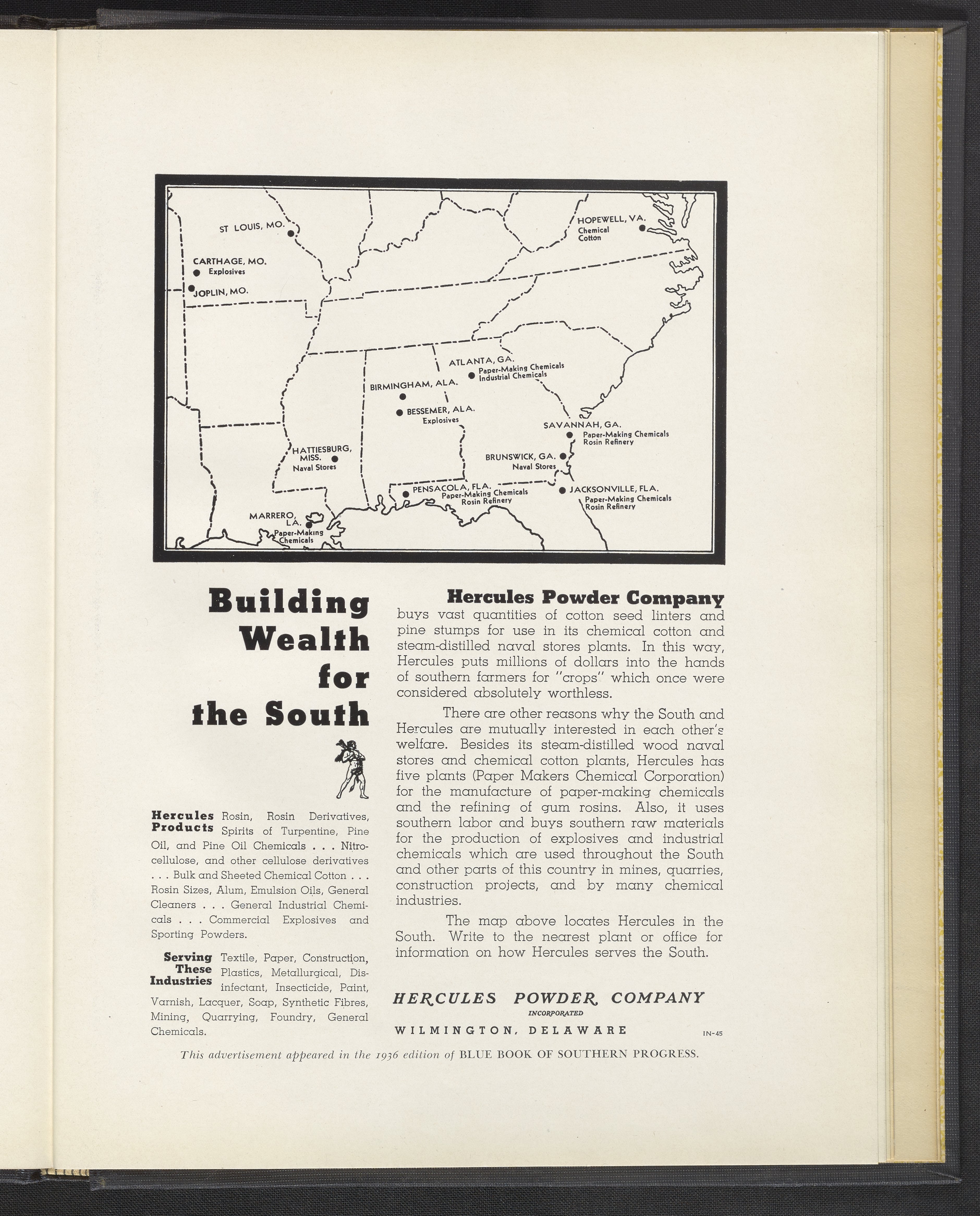 Hercules Incorporated. “Hercules Powder Company: Building Wealth for the New South.” 1936 Hercules Advertisements, 1936. Records of Hercules Incorporated, Volume 1936. Science History Institute. Philadelphia. https://digital.sciencehistory.org/works/v405sb260.