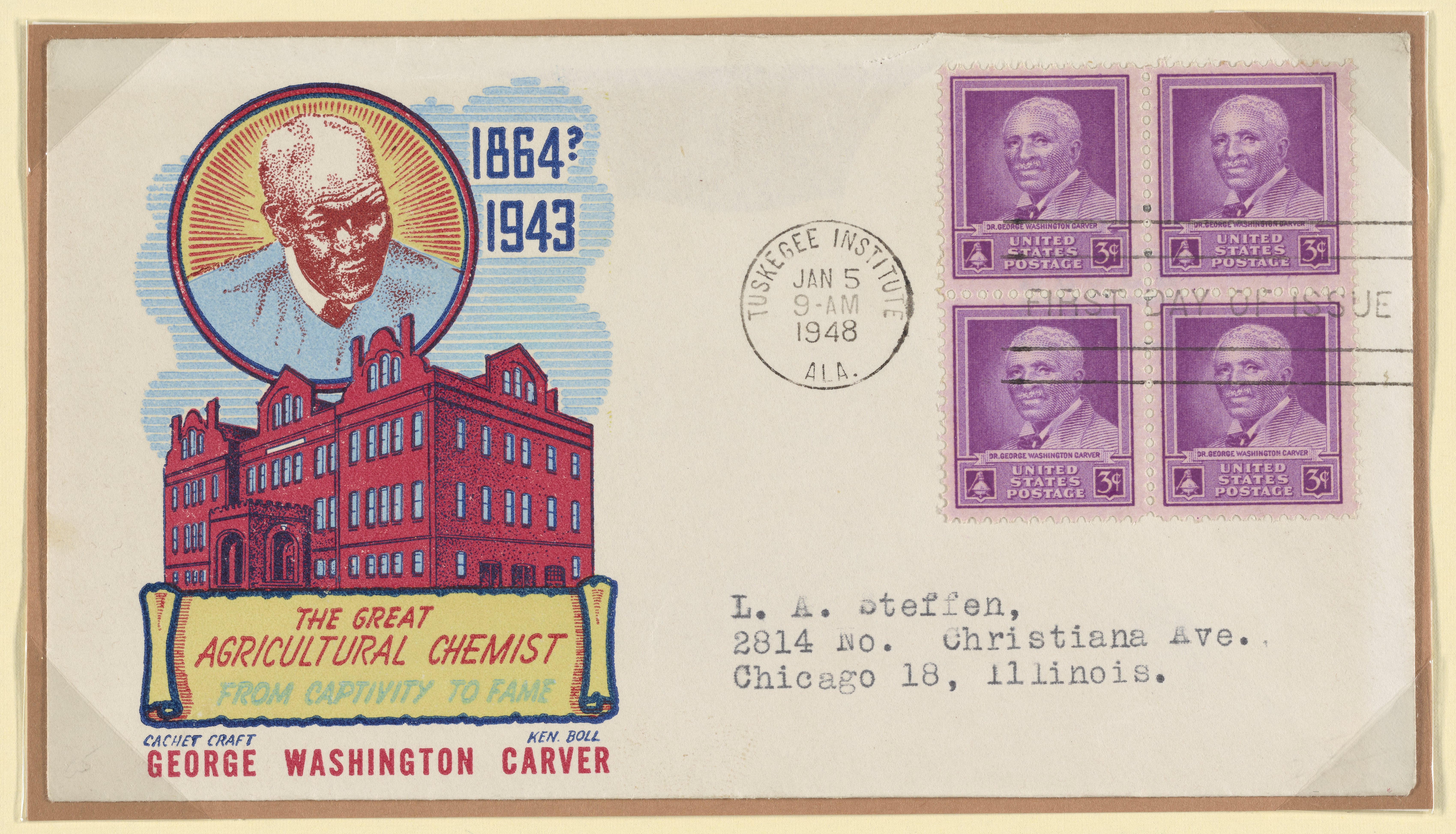 Cachet Craft. “First Day Cover Commemorating George Washington Carver.” United States, January 5, 1948. Witco Stamp Collection, Box 1. Science History Institute. Philadelphia. https://digital.sciencehistory.org/works/v692t625q.