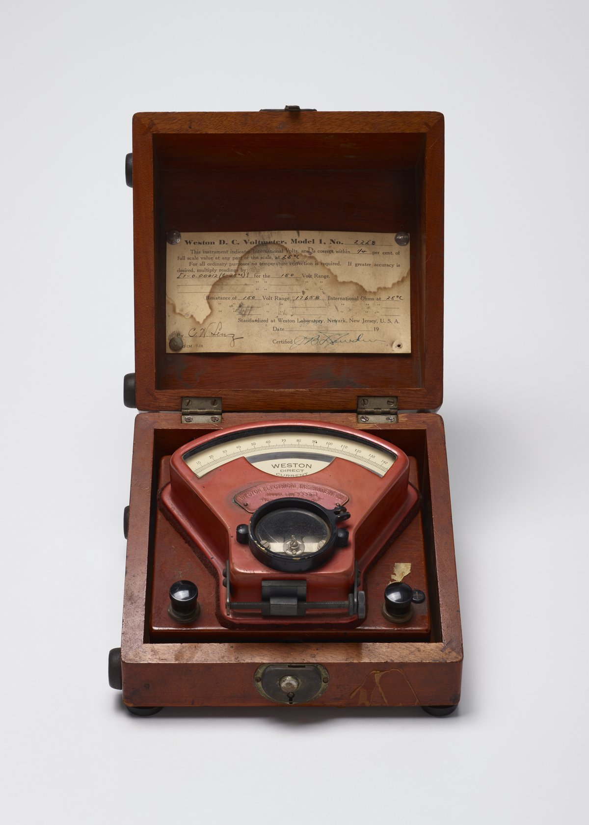 Science History Institute. Weston Direct Current Voltmeter with Case. Photograph, 2016. Science History Institute. Philadelphia. https://digital.sciencehistory.org/works/v692t628j.