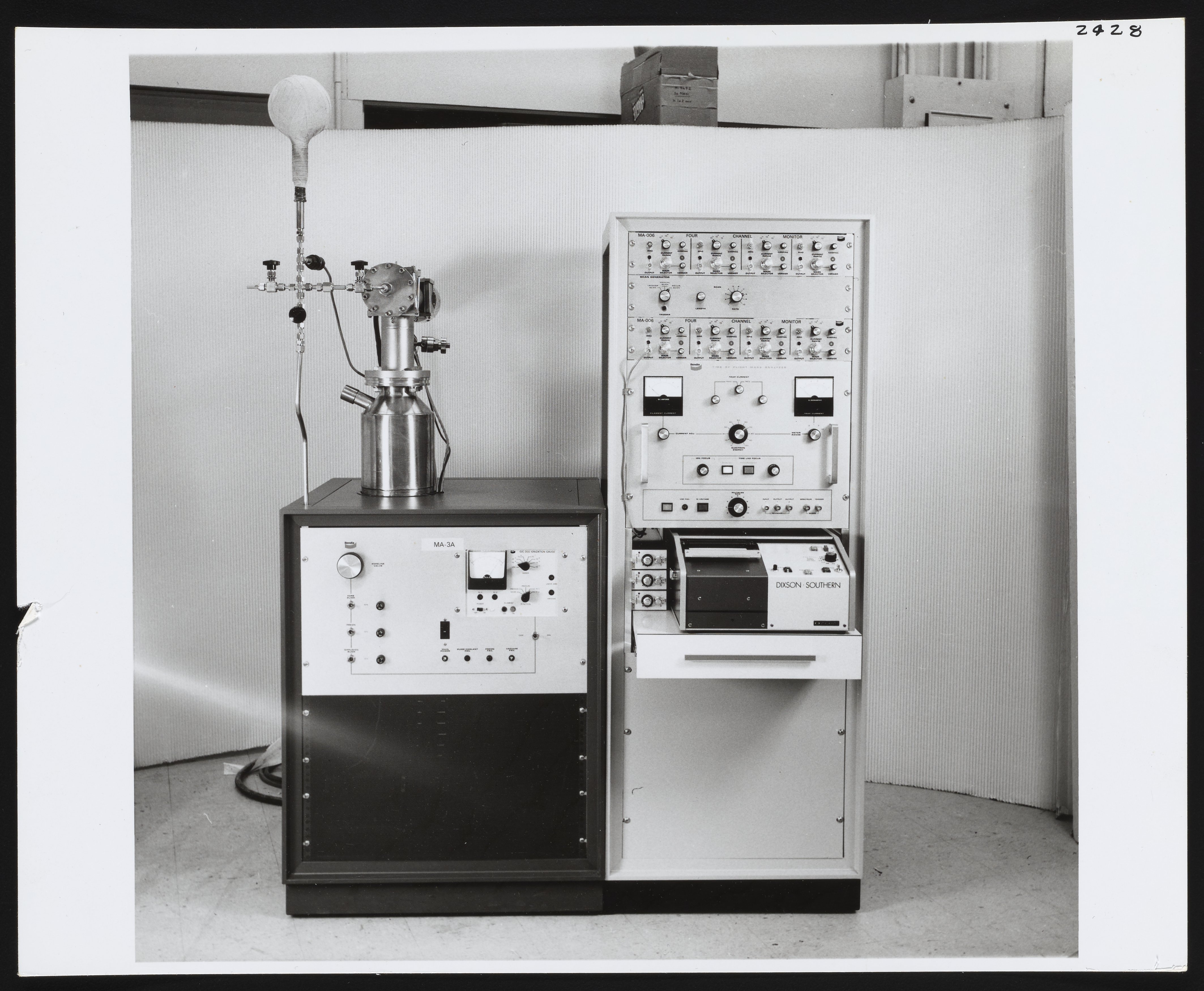 General view of assorted accessories, including a Model MA-006 Four Channel Monitor, a Time-of-Flight Mass Analyzer, and an oscilloscope designed for use with the Bendix Corporation Time-of-Flight Mass Spectrometer. The Time-of-Flight Mass Spectrometer (TOFMS) was the flagship analytical instrument of the Bendix Corporation.