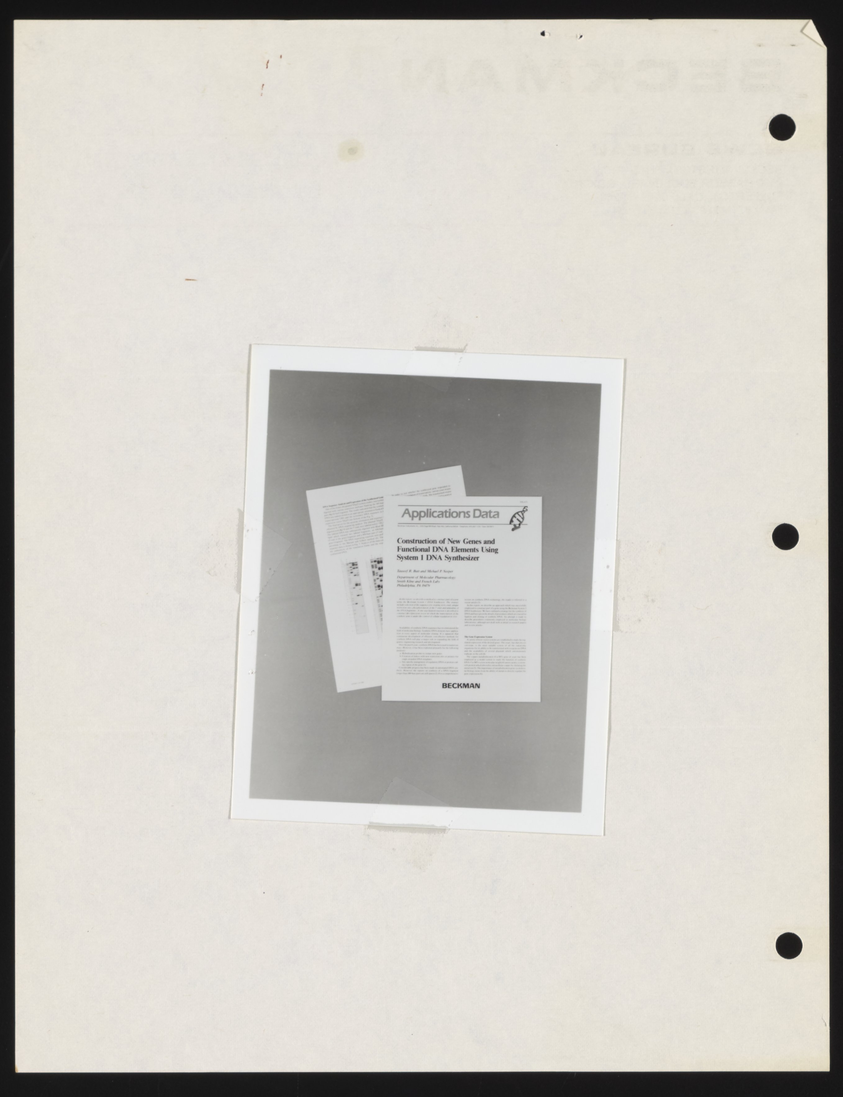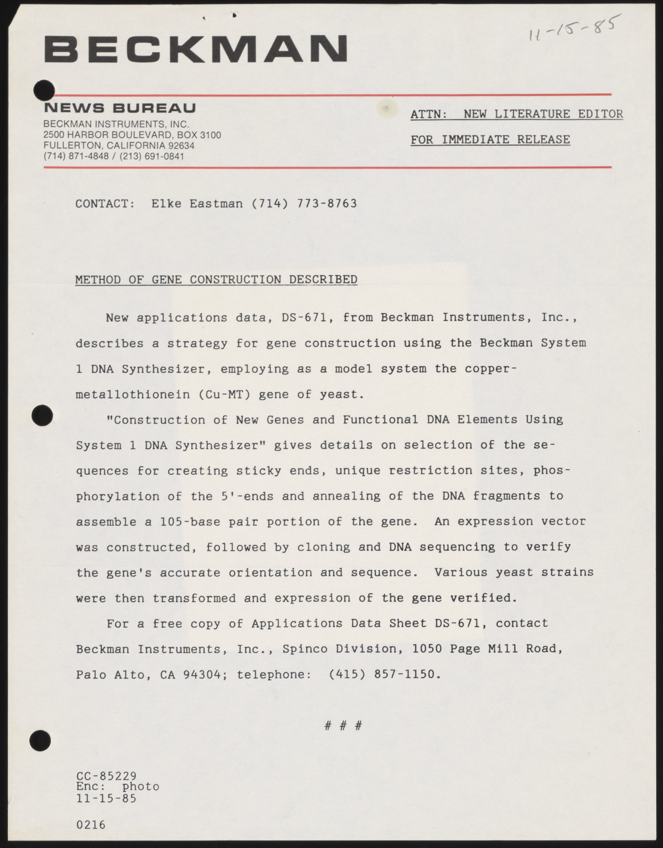 Eastman, Elke. “Method of Gene Construction Described,” November 15, 1985. Beckman Historical Collection, Box 58, Folder 70. Science History Institute. Philadelphia. https://digital.sciencehistory.org/works/v692t675x.