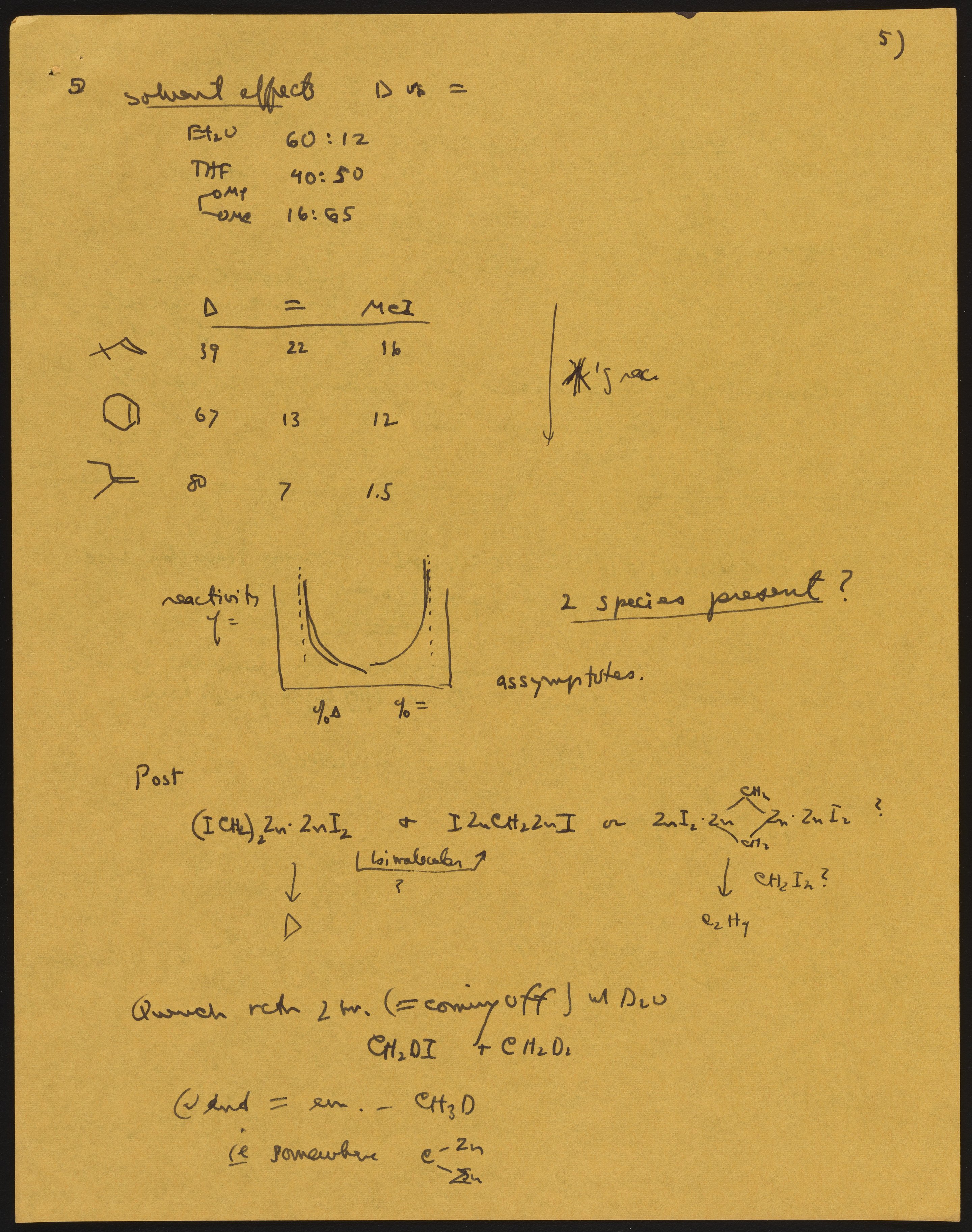 Kohler, Robert E. “R. B. (Robert Burns) Woodward Seminar Entitled ‘Simmons - Carbenes - CH2 I2u Cu Couple.’” Notes from R. B. (Robert Burns) Woodward's Seminars, circa 1959–1966. Folder 2. Science History Institute. Philadelphia. https://digital.sciencehistory.org/works/v692t719s.