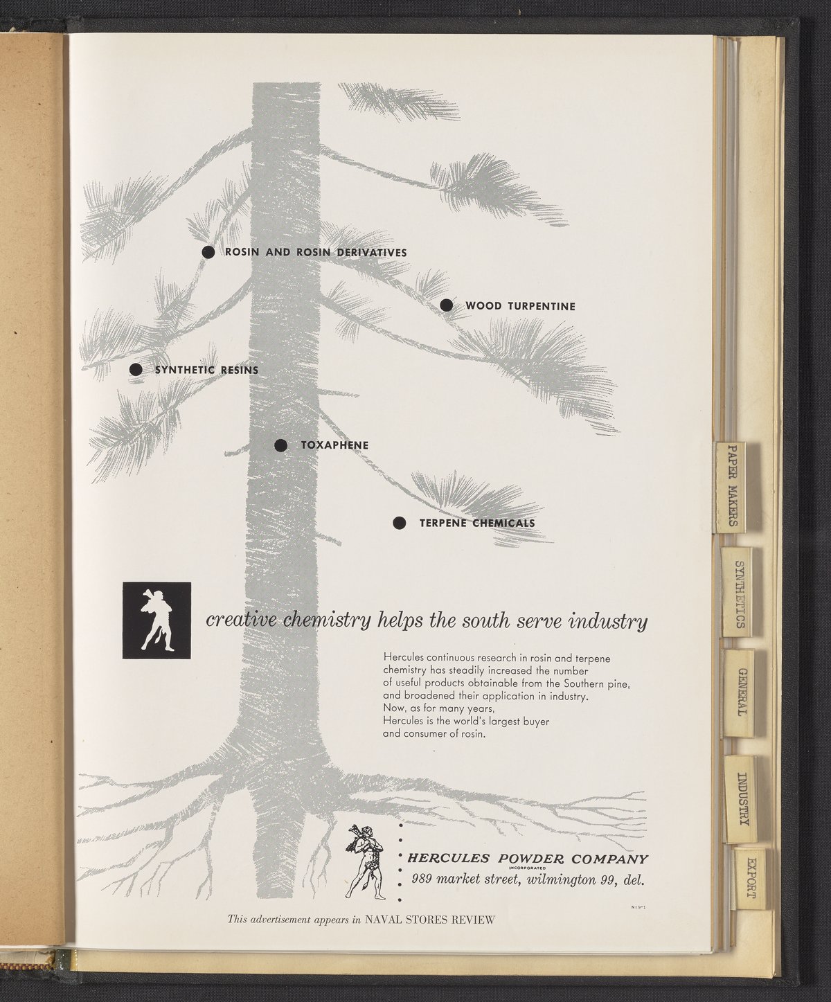 Hercules Incorporated. “Creative Chemistry Helps the South Serve Industry.” 1949 Hercules Advertisements, 1949. Records of Hercules Incorporated, Volume 1949. Science History Institute. Philadelphia. https://digital.sciencehistory.org/works/v979v3991.