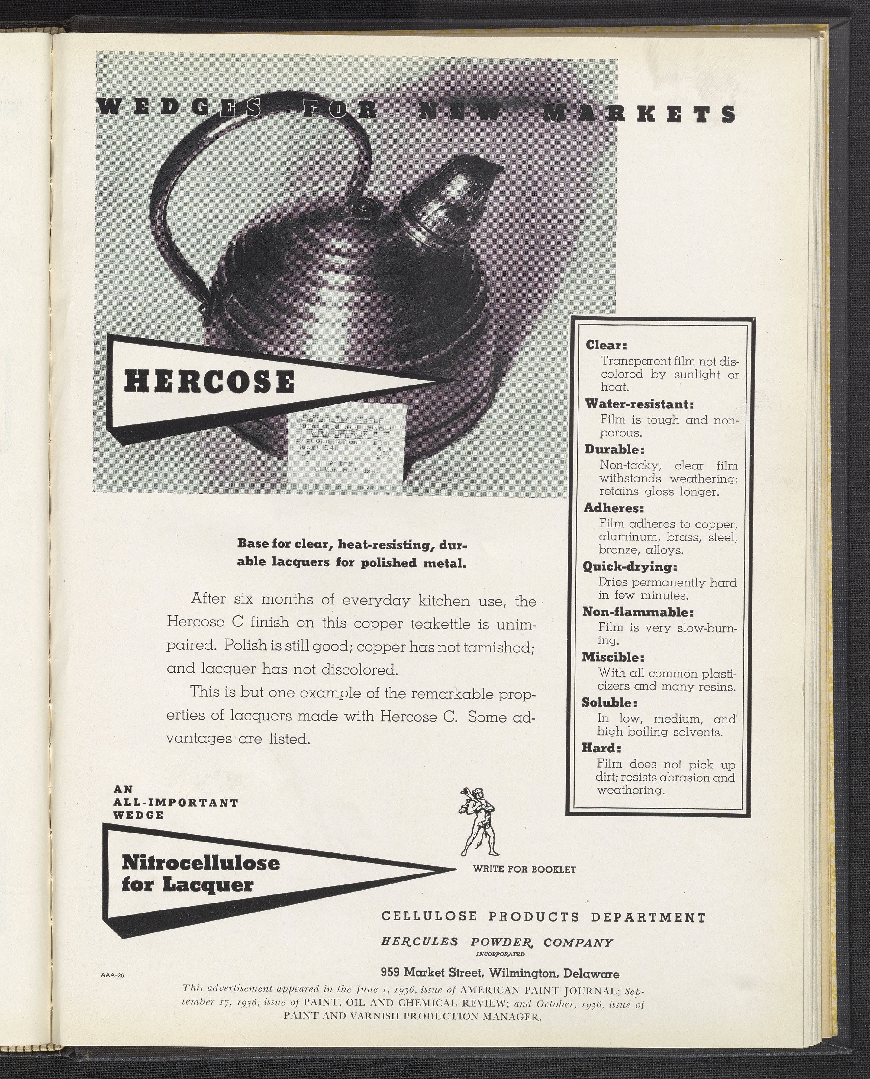 Hercules Incorporated. “Wedges for New Markets: Hercose.” 1936 Hercules Advertisements, 1936. Records of Hercules Incorporated, Volume 1936. Science History Institute. Philadelphia. https://digital.sciencehistory.org/works/v979v407h.