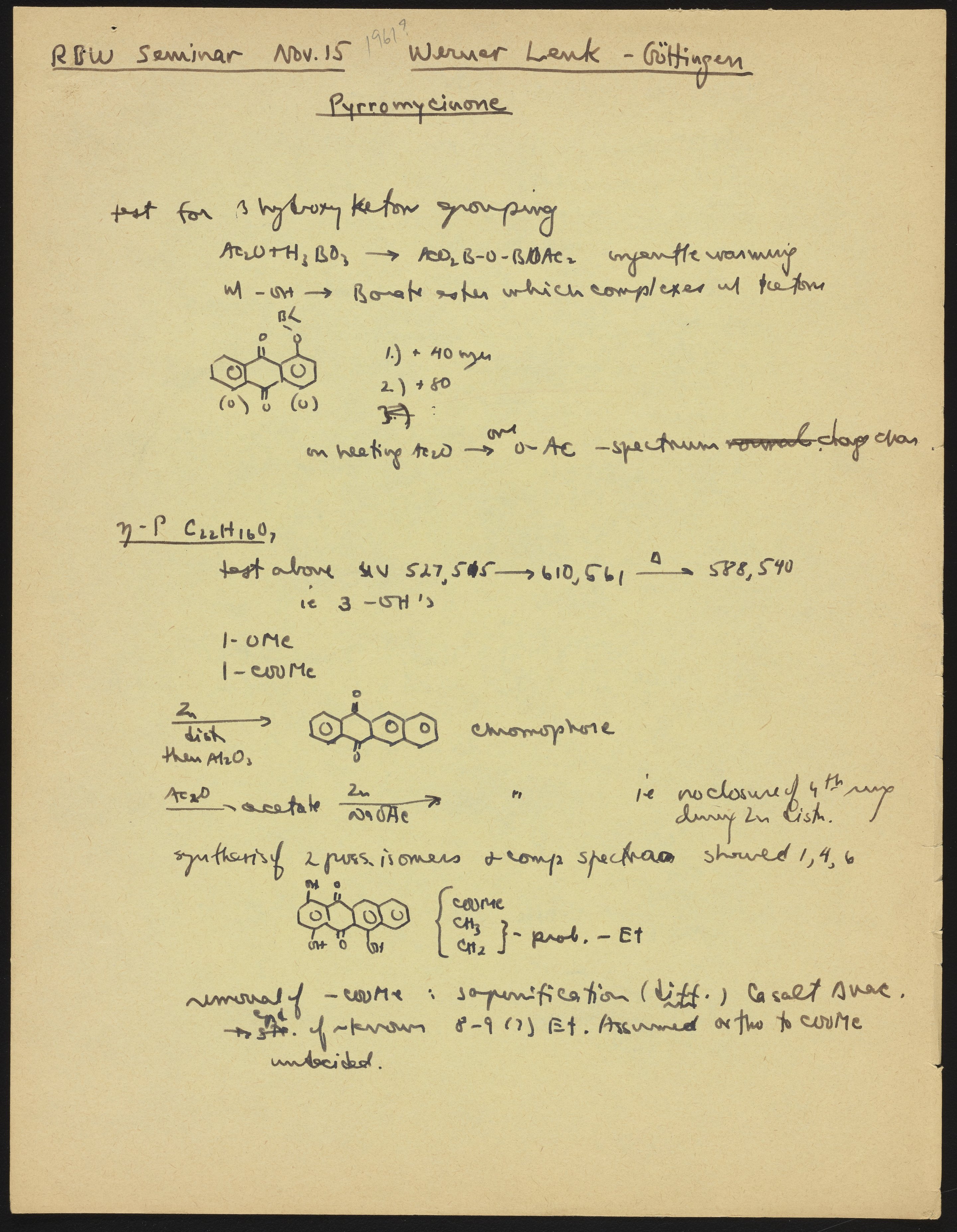 Kohler, Robert E. “R. B. (Robert Burns) Woodward Seminar Entitled ‘Werner Lenk - Göttingen/Pyrromycinone.’” Notes from R. B. (Robert Burns) Woodward's Seminars, circa 1959–1966. Folder 2. Science History Institute. Philadelphia. https://digital.sciencehistory.org/works/v979v4245.