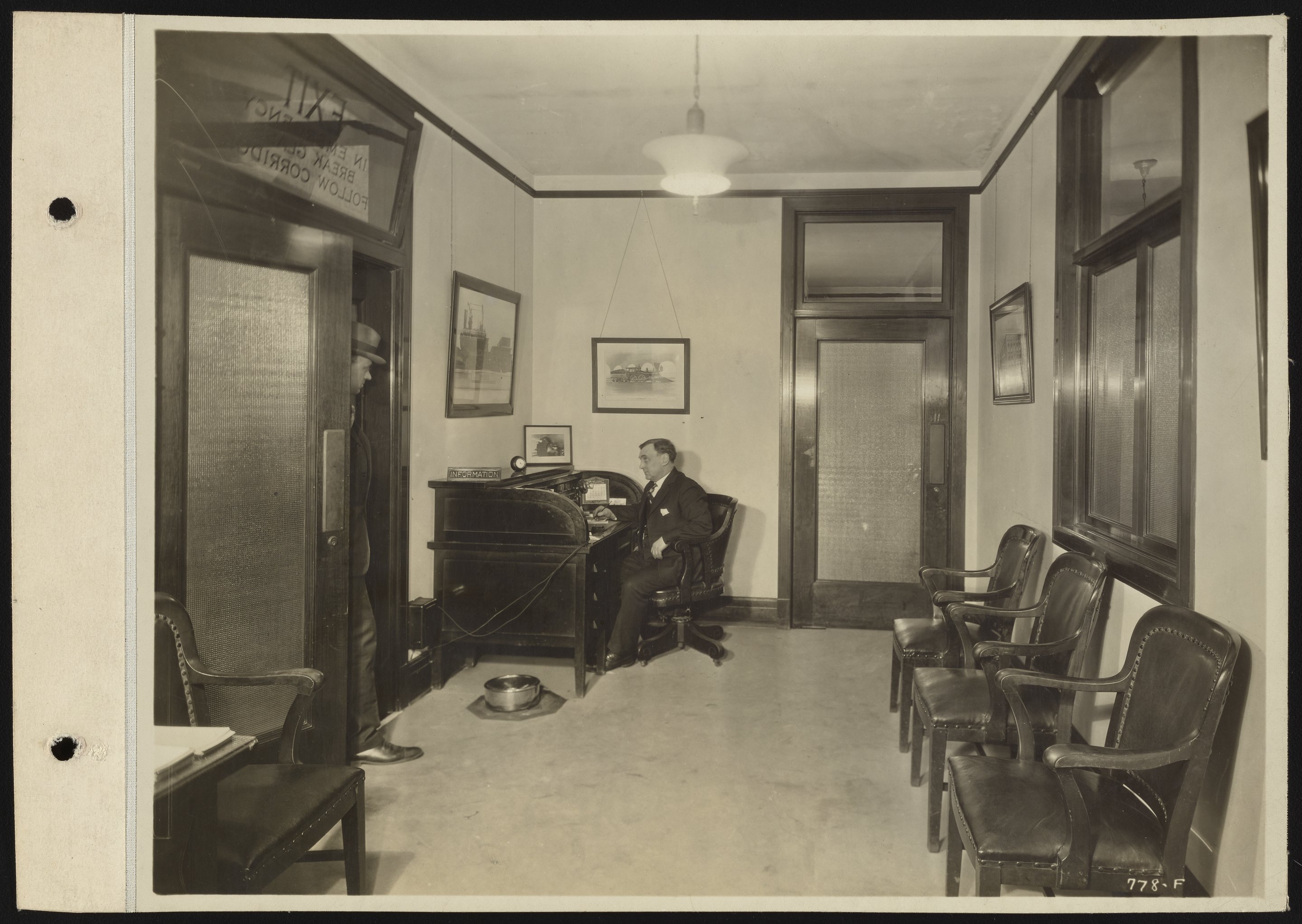 General view of the information desk at the Dearborn Chemical Company's 35th Street laboratory facility and manufacturing plant. The employees visible in the photograph are identified as J. Beckerley (seated) and C.M. Sloan (standing at door). Founded in 1887, the Dearborn Chemical Company was a corporate ancestor of BetzDearborn, Incorporated best known for manufacturing water treatment chemicals for use in boilers and cooling towers.