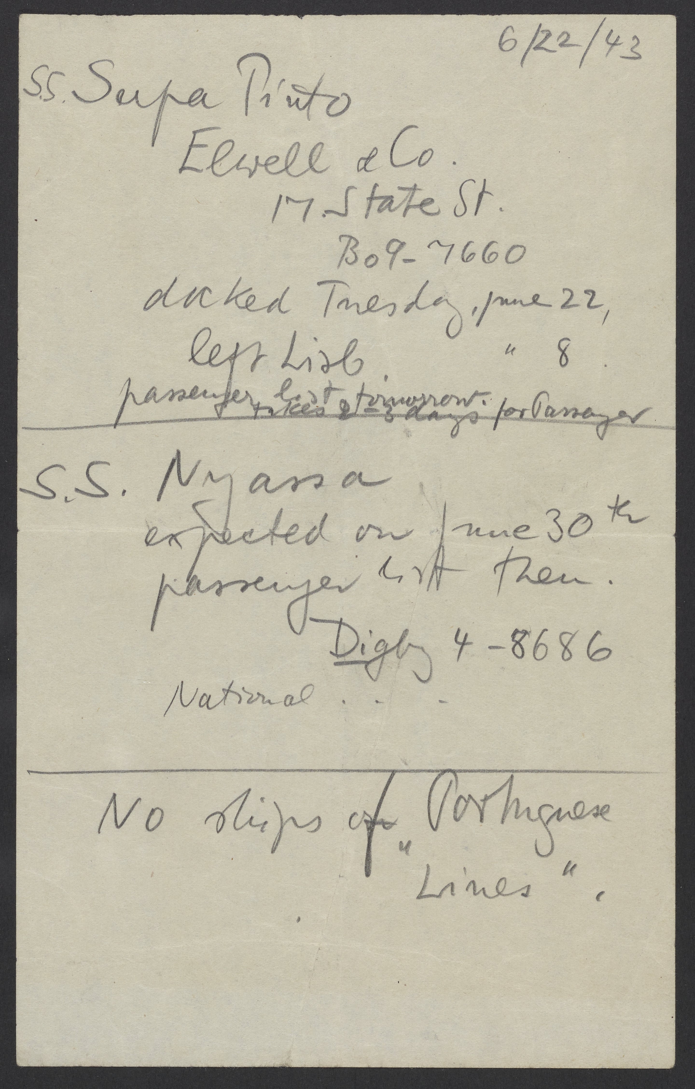 Small JPG1200 x 1880px — 317 KBLarge JPG2880 x 4513px — 1.9 MBFull-sized JPG3208 x 5027px — 2.3 MBOriginal fileTIFF — 3208 x 5027px — 46.2 MBPassenger ship names, ports of arrival, and expected arrival dates. Fritz Hochwald (1897-1968) is expected to be on the Nyassa, arriving June 30th, 1943. Note likely intended for Ilse Wolfsberg's awareness of her fiance's arrival.