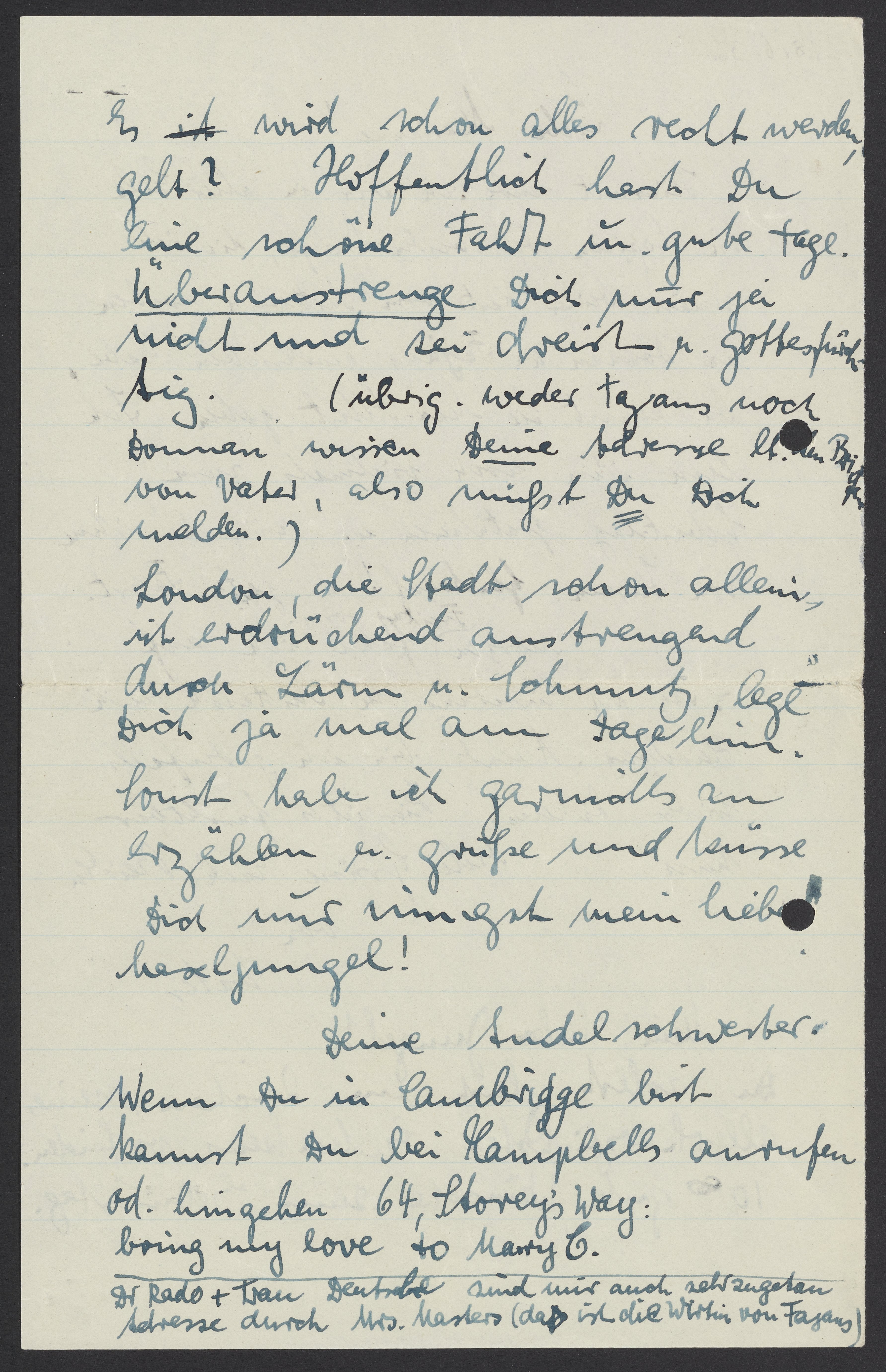 London, die Stadt schon allem, ist erdrückend anstrengend durch Lärm u. Löhnung, lege Dich ja mal am Tage hin. Auch habe ich gewollt zu erzählen u. grüsse und küsse Dich und sei gut mein liebes Herzjungel.