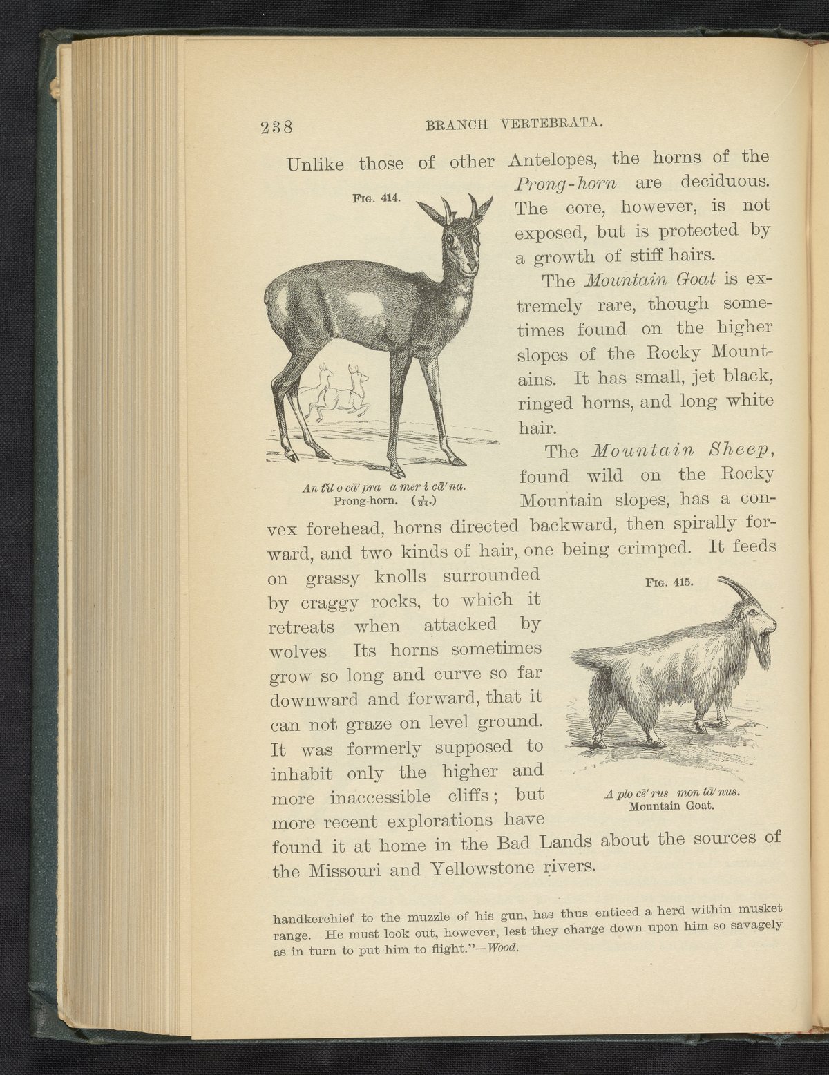 Steele, Joel Dorman, and Jenks, J. W. P. (John Whipple Potter). “Figure 414. Prong-Horn. Figure 415. Mountain Goat.” Popular Zoology. New York, New York: Chautauqua Press, 1887. https://digital.sciencehistory.org/works/vctxa8g.