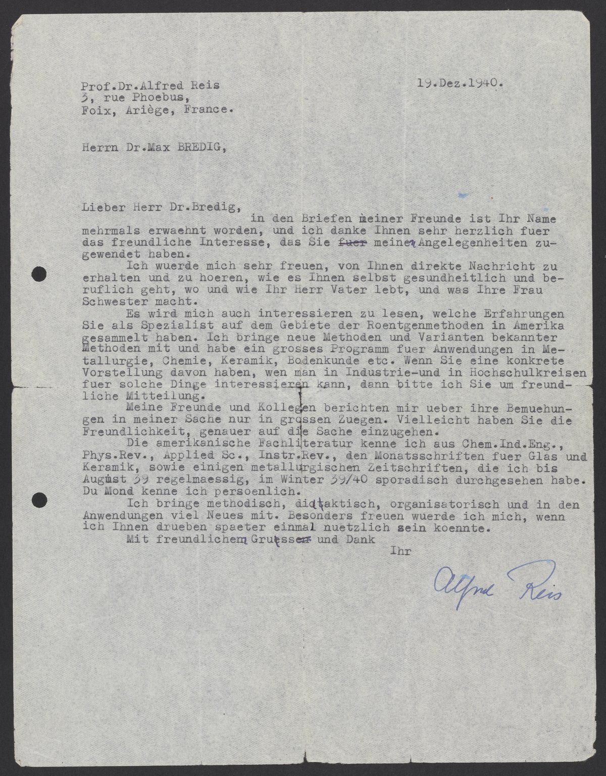 Letter from Alfred Reis to Max Bredig, December 19, 1940