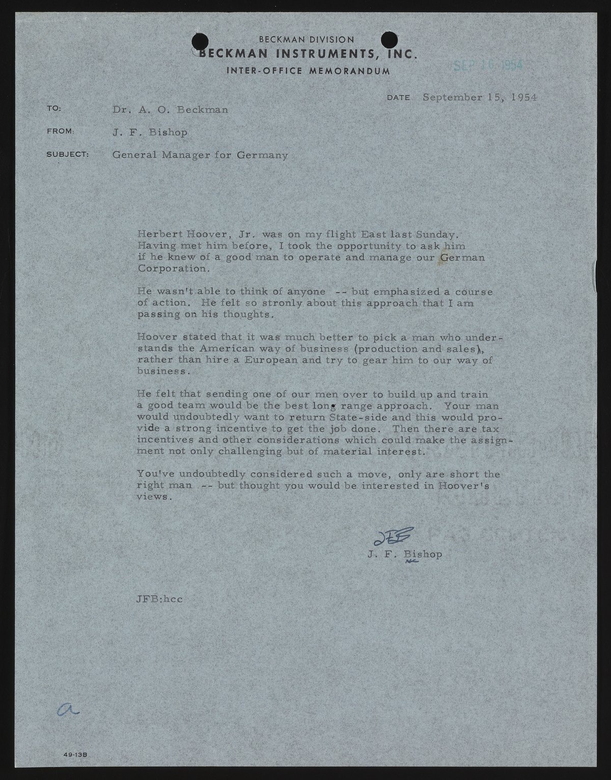 In this letter, John F. Bishop relates a conversation with Herbert Hoover, Jr., in which Hoover recommended that Beckman choose "a man who understands the American way of business," rather than a European candidate, to head the German subsidiary.