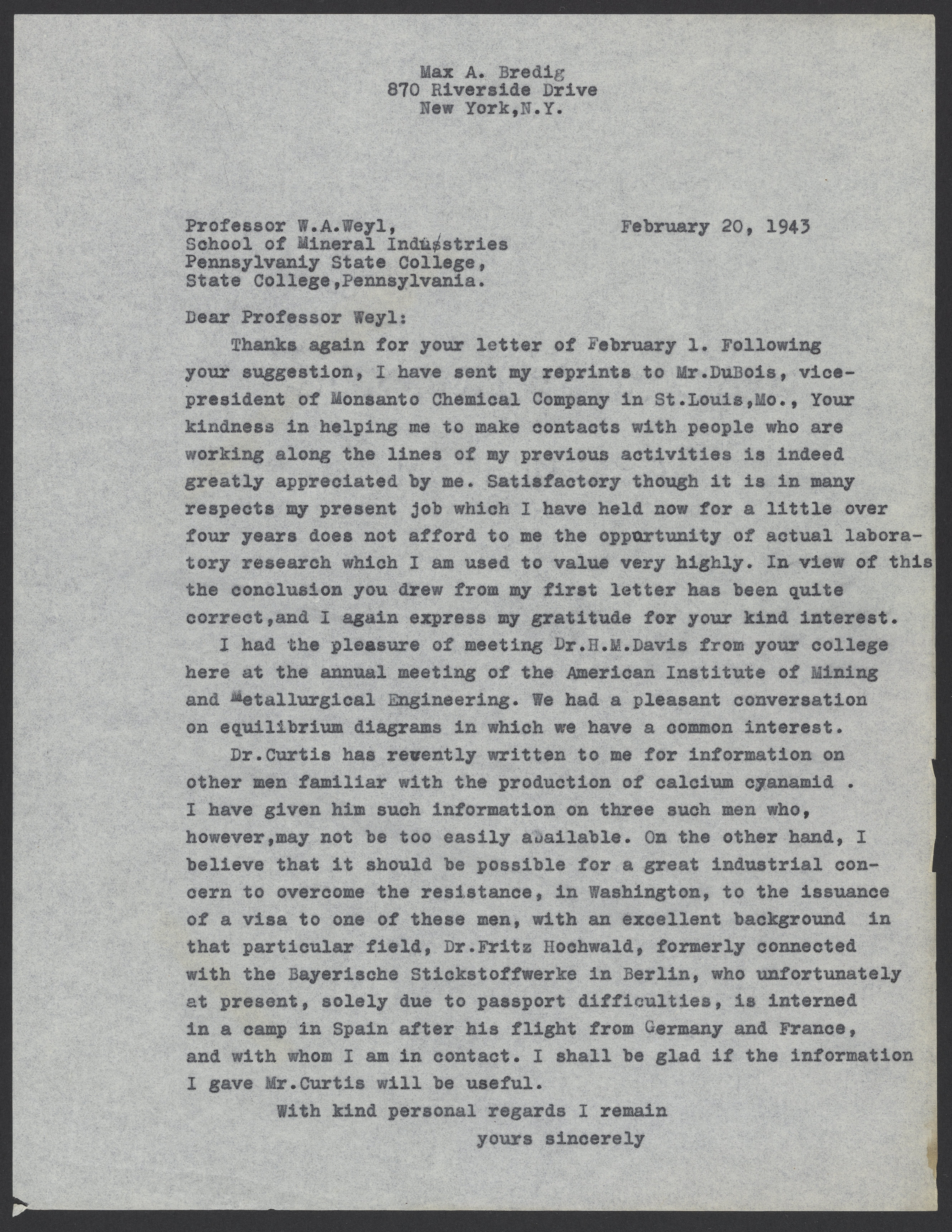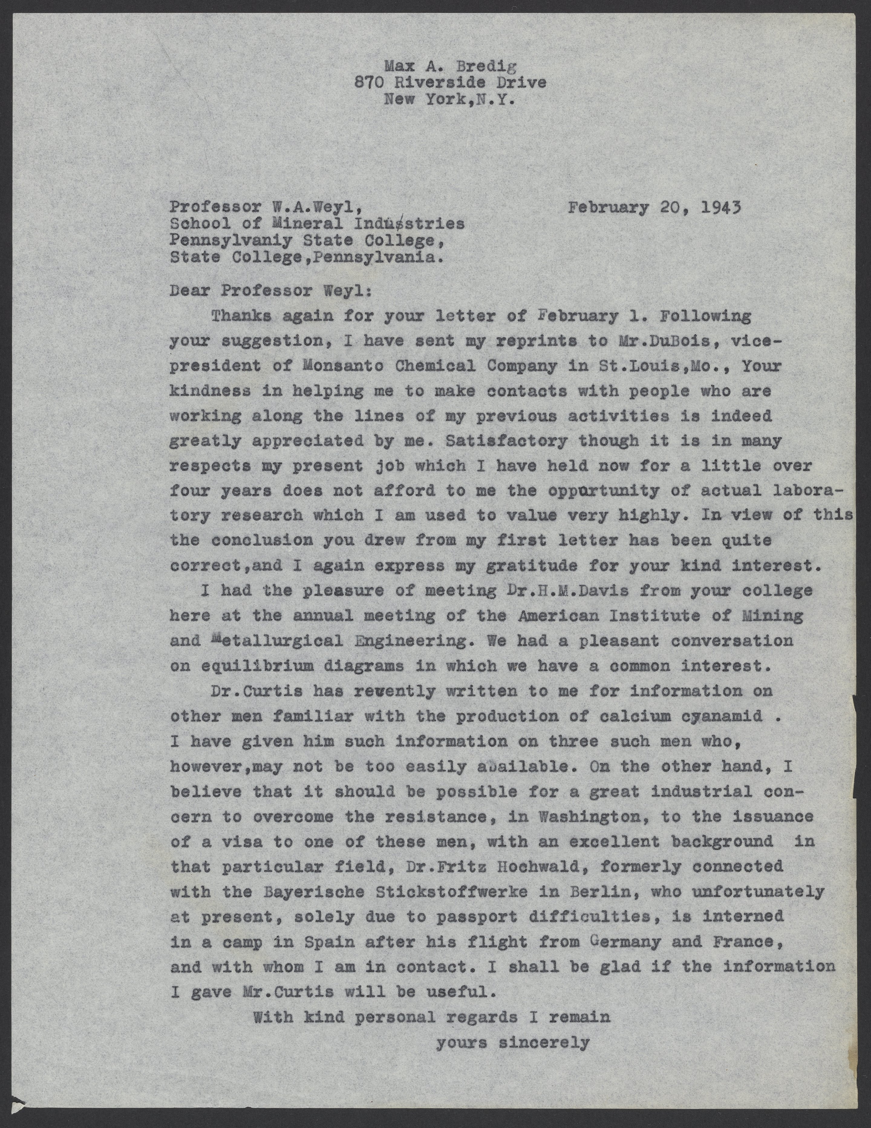 Letter from Max Bredig to W. A. Weyl, February 20, 1943